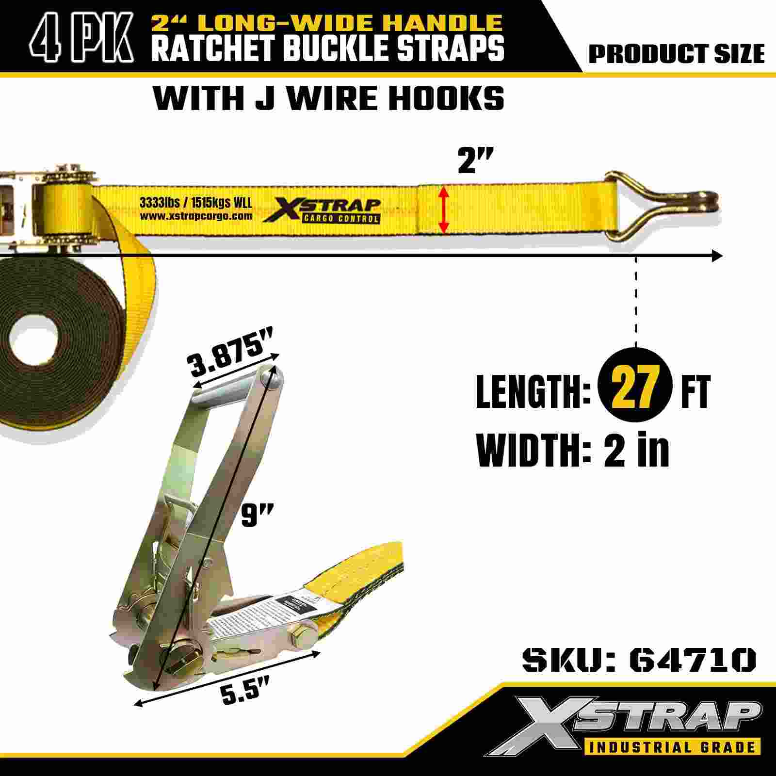 Xstrap 64710 Kargo Kawalan Ratchet Tali 2" x 27kaki (4-Pek) – Cangkuk Wayar, Kapasiti Dinilai 10,000 lbs, Pengikat Tahan Lama untuk Pengangkutan Peralatan