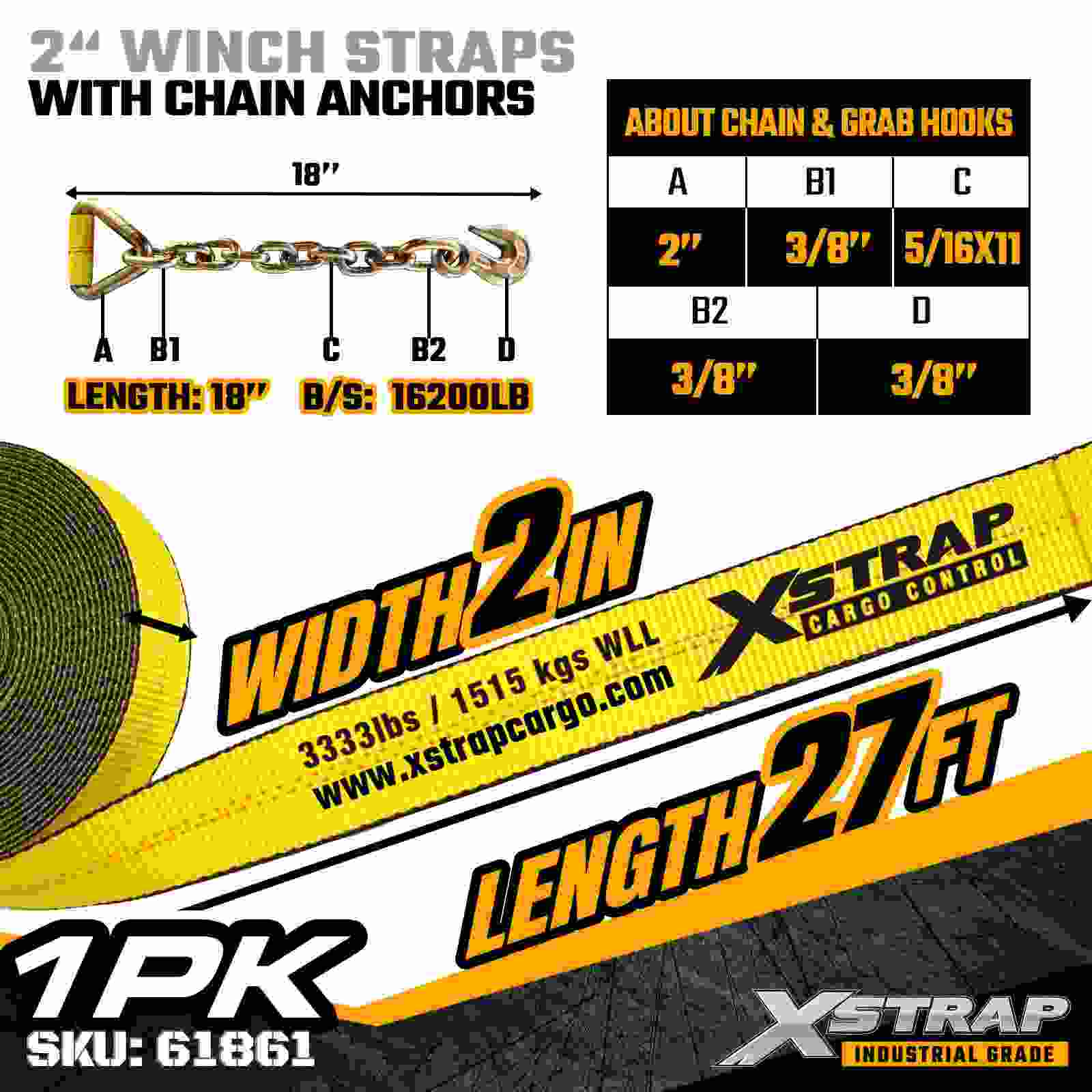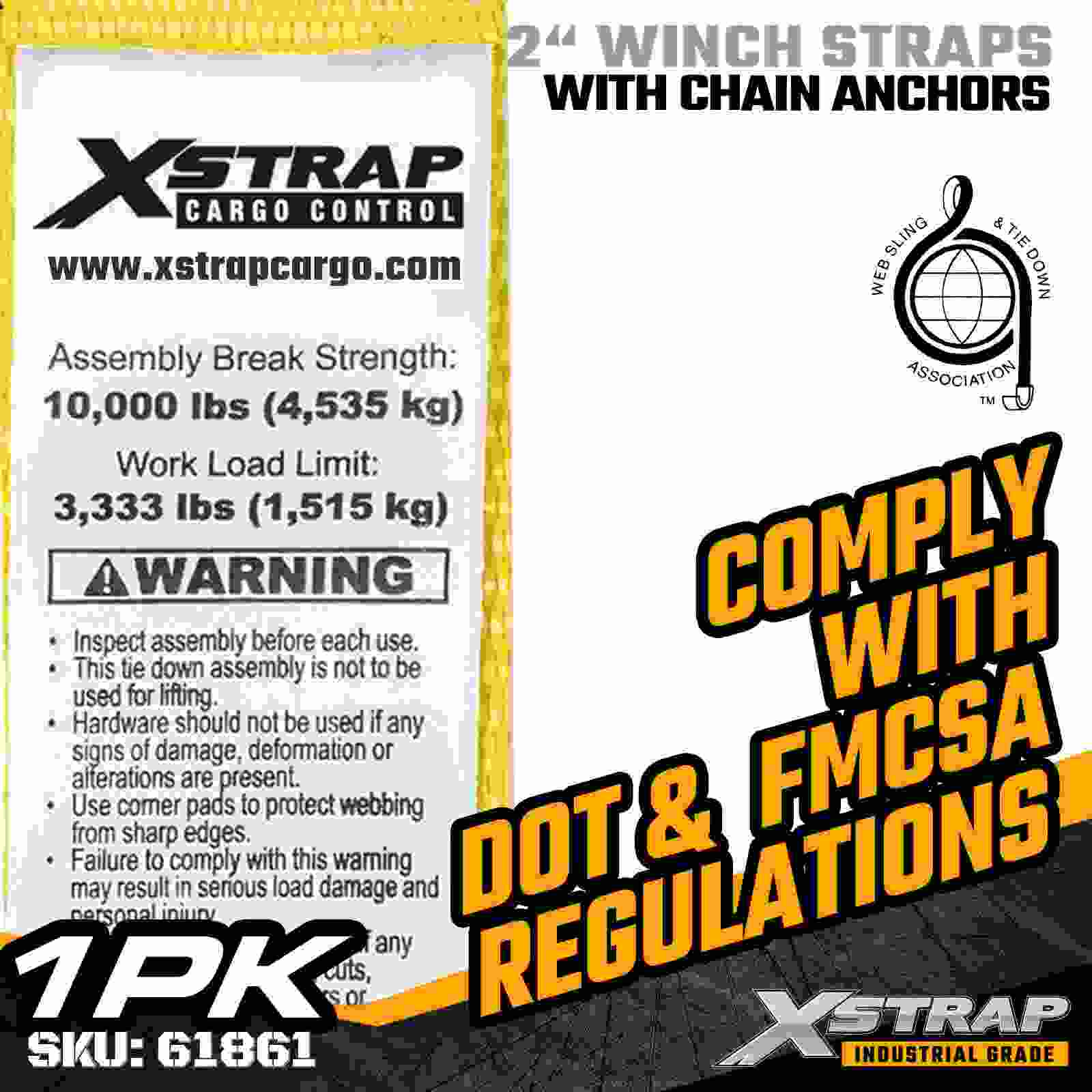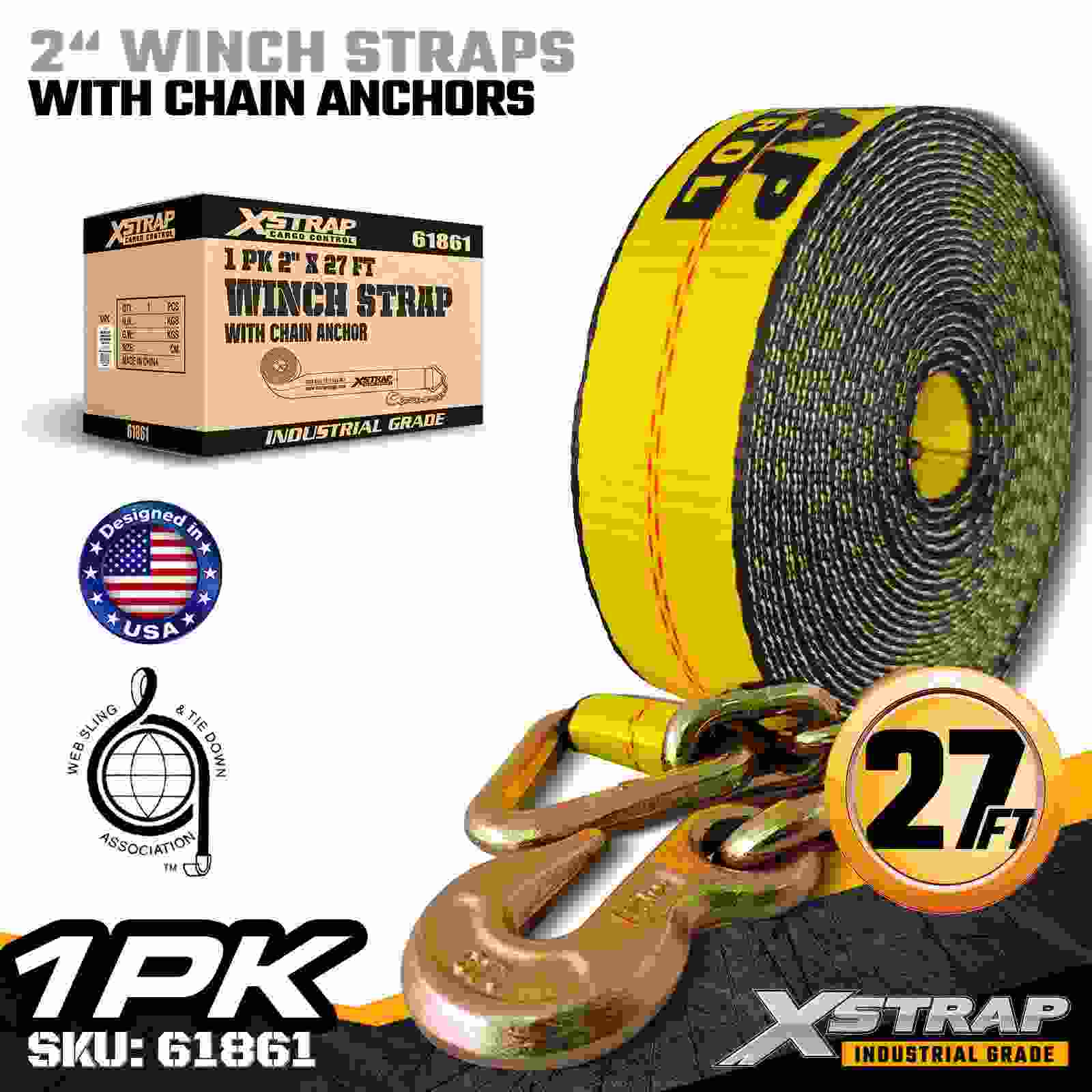 Tali Win Piawai Xstrap 61861 2" × 27 kaki dibina untuk keselamatan kargo katil rata yang boleh dipercayai, menampilkan Penambat Rantaian yang tahan lama dan anyaman poliester berkekuatan tinggi. Dengan Had Beban Kerja 3,333 lbs dan 10,000 lbs Break Strength, pallet dan pallet yang boleh dipercayai prestasi, ia menyediakan prestasi pengangkutan yang boleh dipercayai setiap hari. aplikasi logistik.