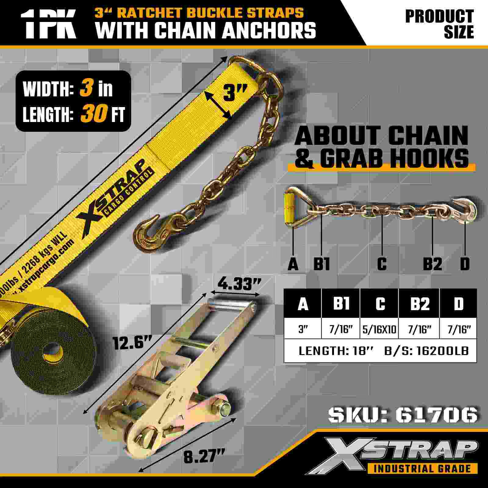 Xstrap 61706 3" × 30 kaki Gesper Ratchet Strap (1-Pek) direka bentuk untuk keselamatan kargo tugas berat, menampilkan sauh rantai palsu dan sistem ratchet tegangan tinggi. Dengan WLL 5,000 lbs dan 15,000 lbs, kekuatan pecah industri, dan memberikan prestasi yang boleh dipercayai untuk pengangkutan mesin, pengangkutan rata.