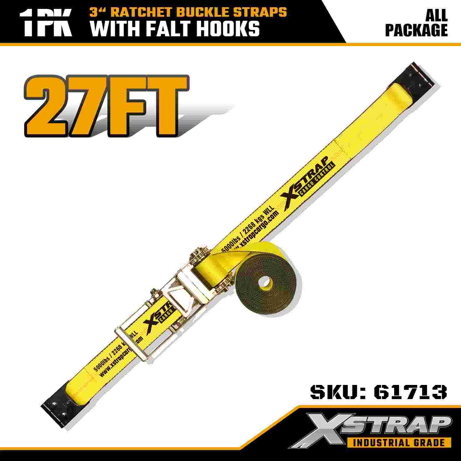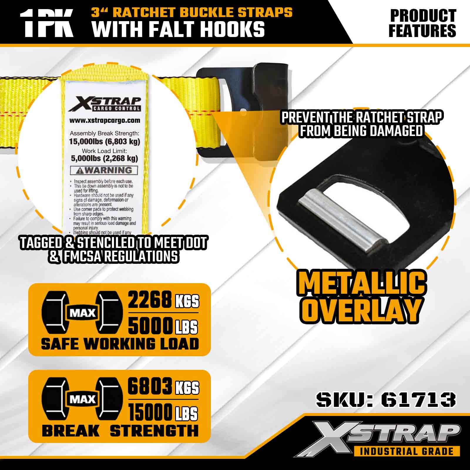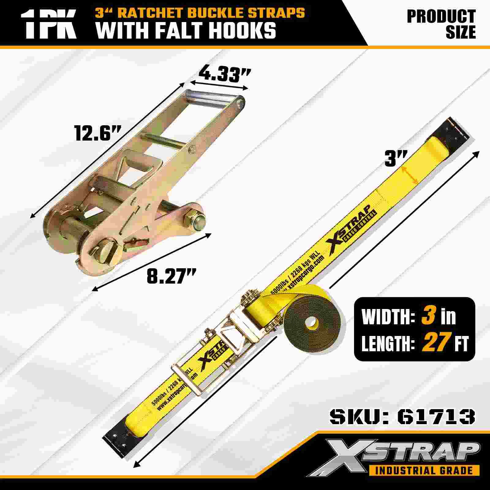 Xstrap 61713 3" x 27 kaki Gesper Ratchet Straps (1-Pek) Cangkuk Rata, 5,000 paun Kapasiti Muatan 15,000 lbs Kekuatan Pecah, Pengikat Tugas Berat untuk Lori, Treler dan Pengangkutan Kargo Industri.