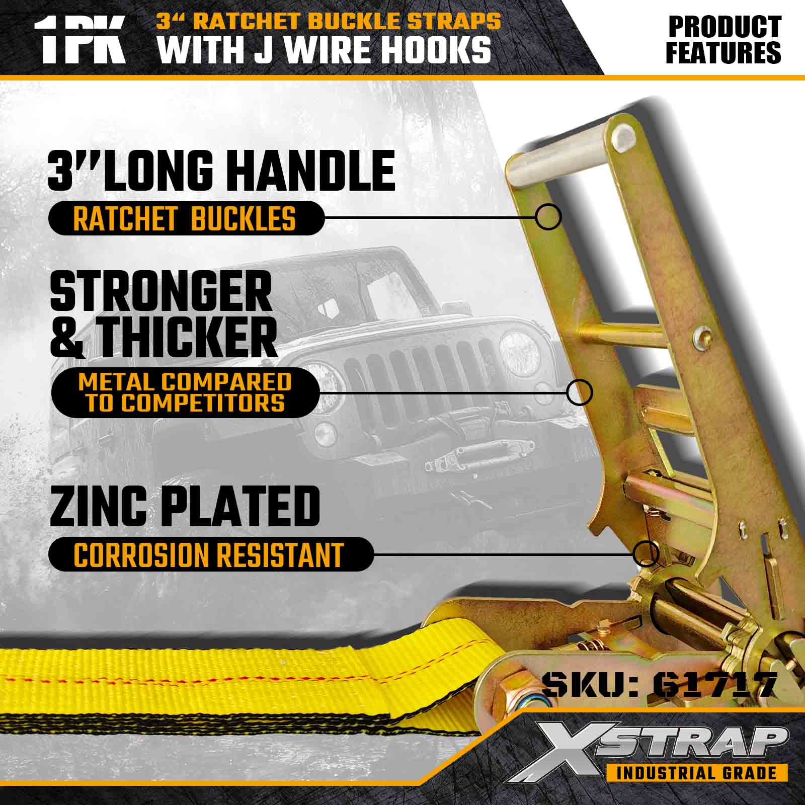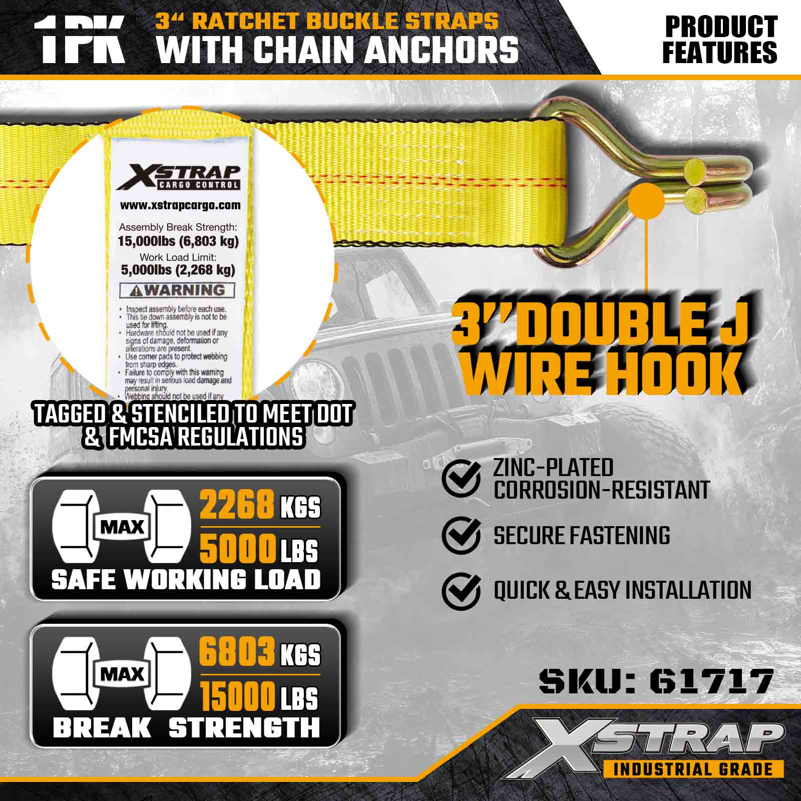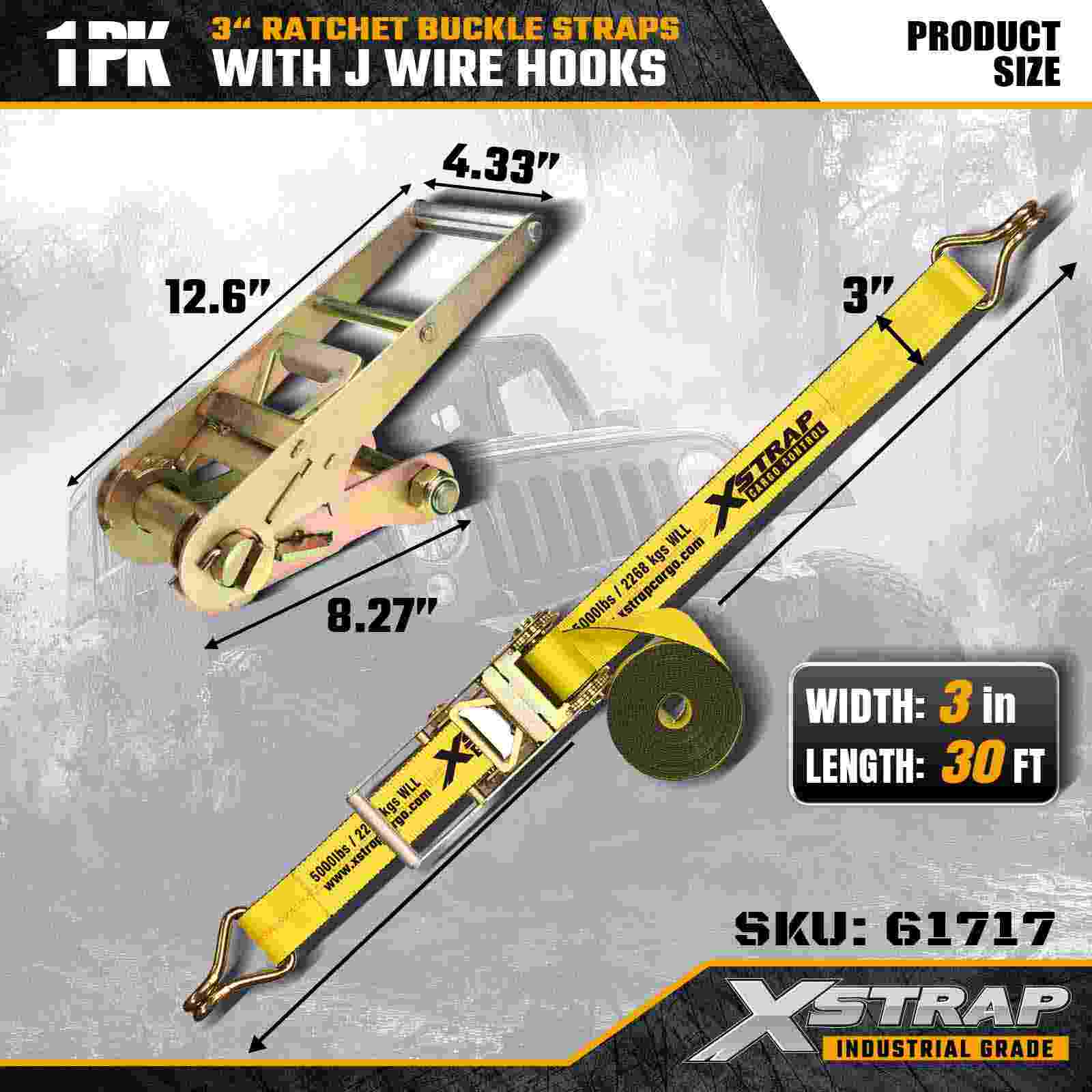 Xstrap 61717 3" × 30 kaki Gesper Ratchet Strap (1-Pek) direka bentuk untuk aplikasi kargo yang menuntut, menampilkan Cangkuk Wayar bertetulang dan sistem ratchet bertegangan tinggi. Dengan Had Beban Kerja 5,000 lbs dan 15,000 lbs untuk pengangkutan yang boleh dipercayai untuk Kekuatan Pecah, peralatan yang boleh dipercayai ini. logistik.