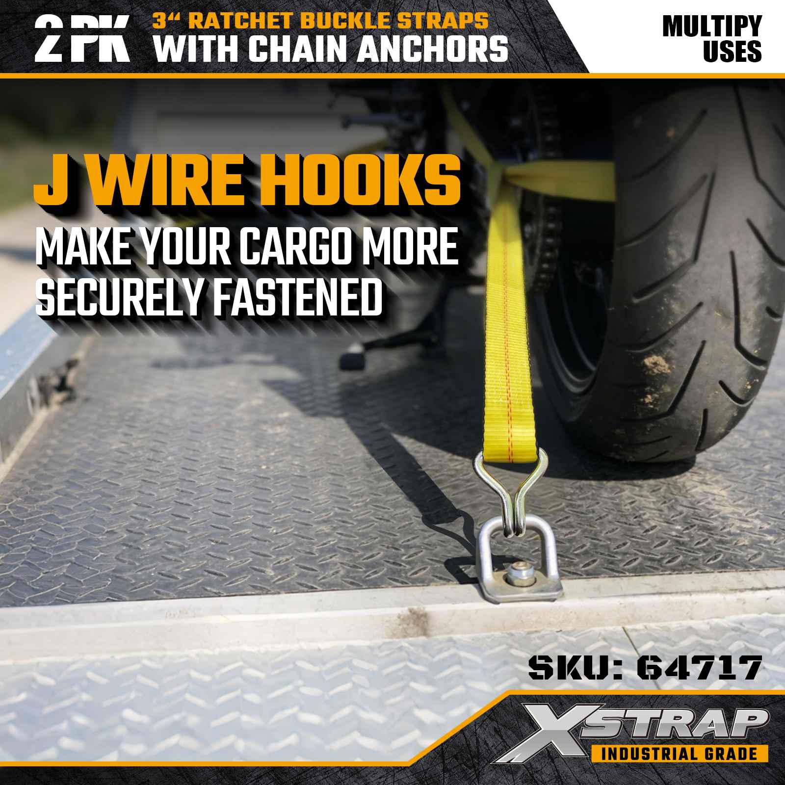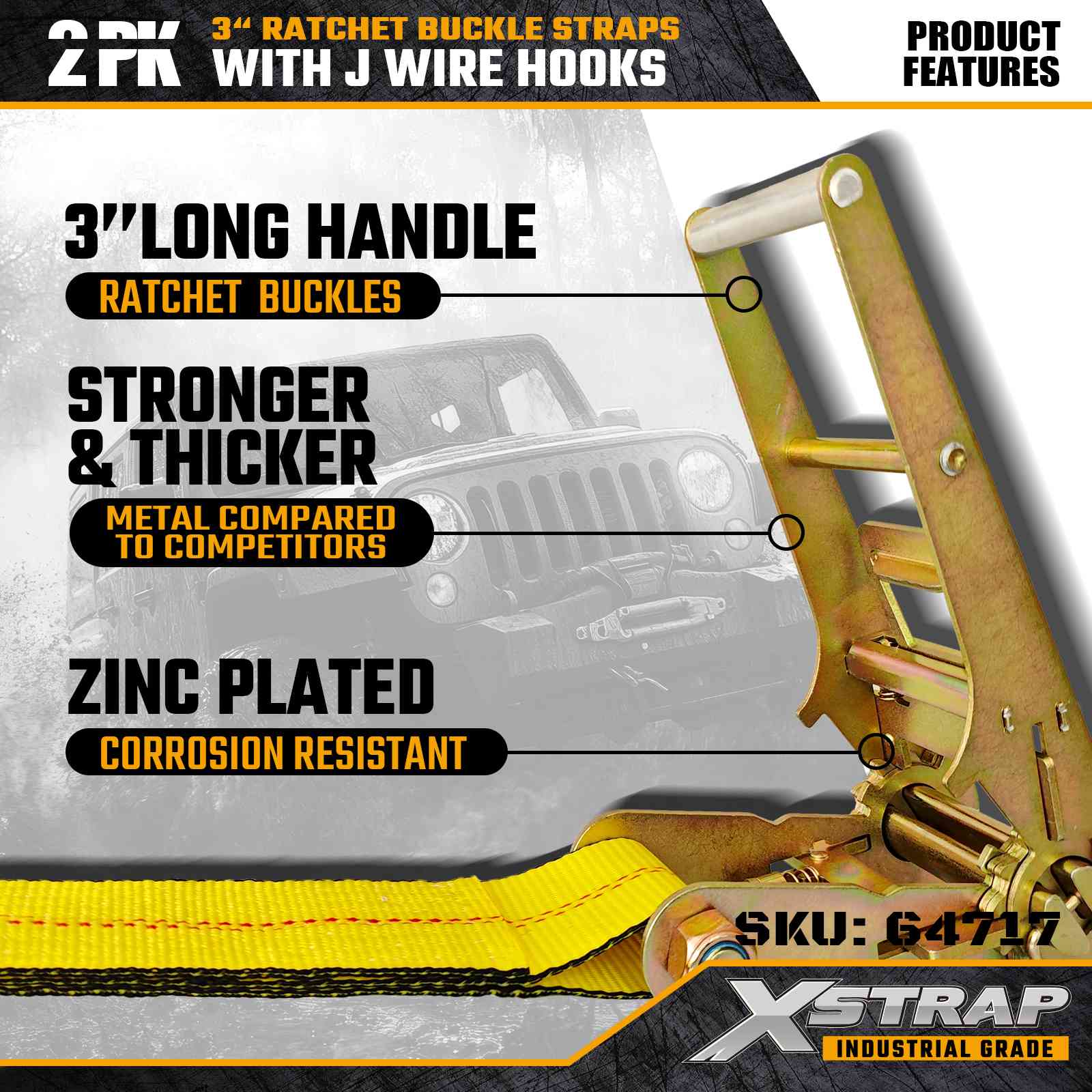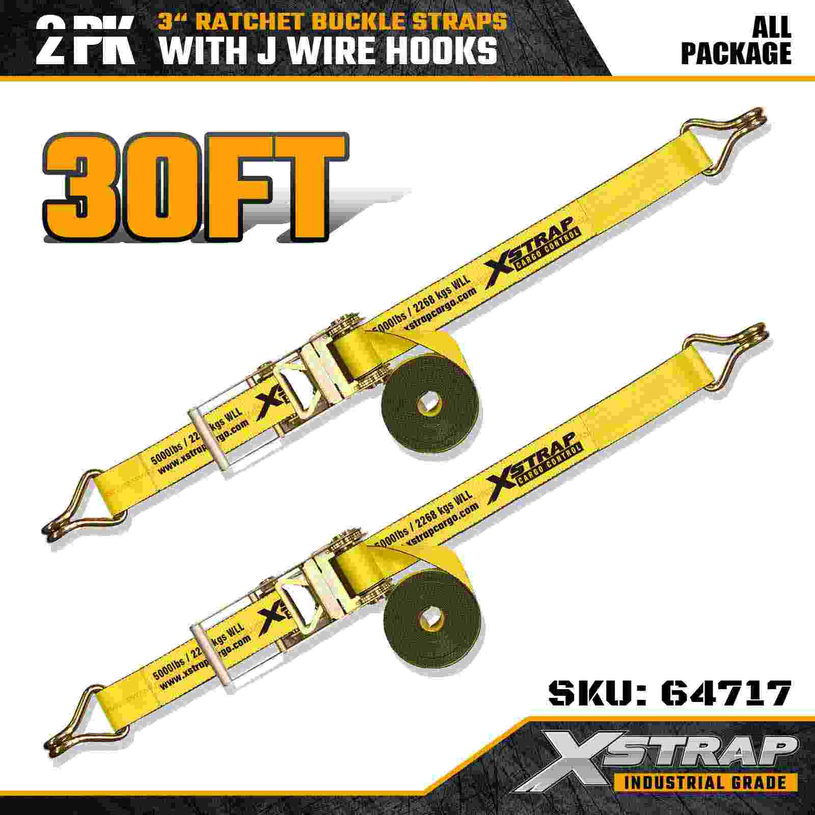 Xstrap 64717 3" × 30 kaki Gesper Ratchet Straps (2-Pek) direka bentuk untuk keselamatan kargo profesional, menampilkan Cangkuk Wayar bertetulang dan mekanisme ratchet tugas berat. Dengan Had Beban Kerja 5,000 lbs dan 15,000 lbs 15,000 lbs pengangkutan boleh dipercayai, Kekuatan Pecah industri dan prestasi mesin yang panjang. operasi mengangkut.