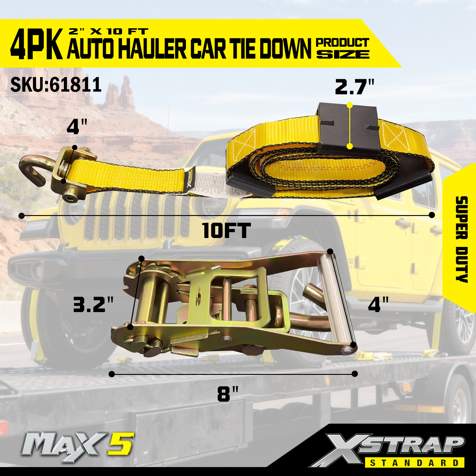 Tali Pengangkut Kereta Xstrap Heavy Duty 6,600 lbs Kekuatan Pecah - Tali Pengikat Tayar untuk Treler, Pengikat Atas Roda dengan Cleat Getah untuk SUV, Lori, ATV, UTV