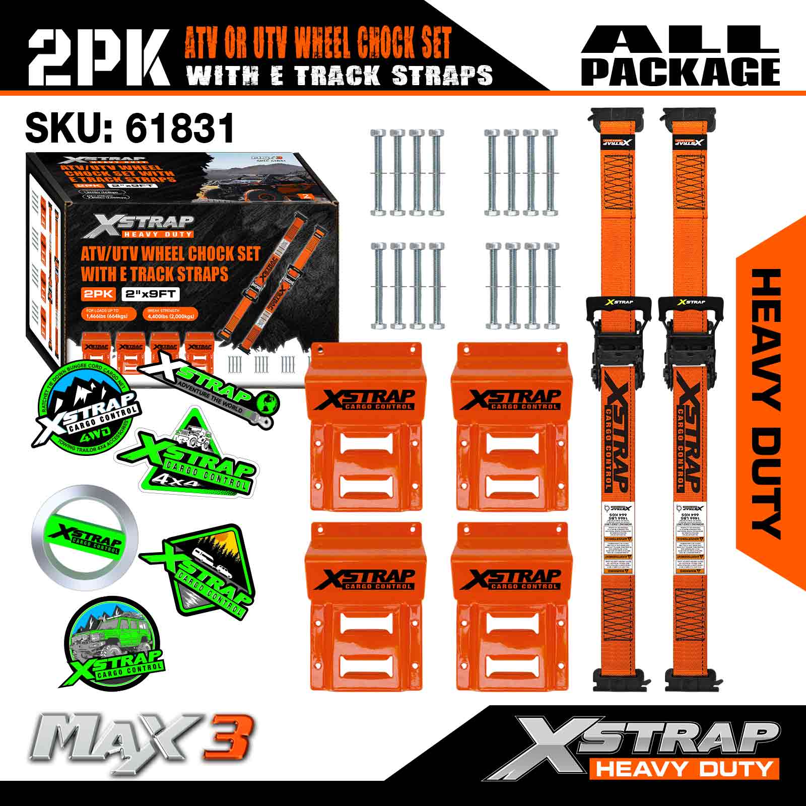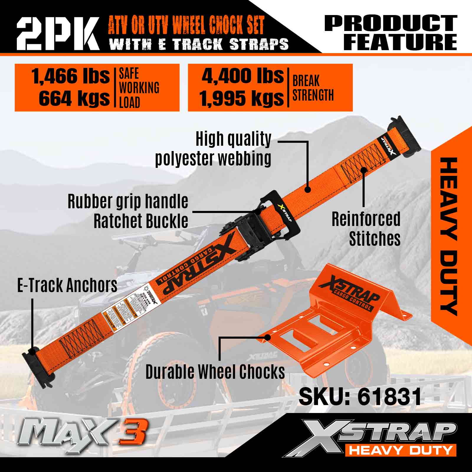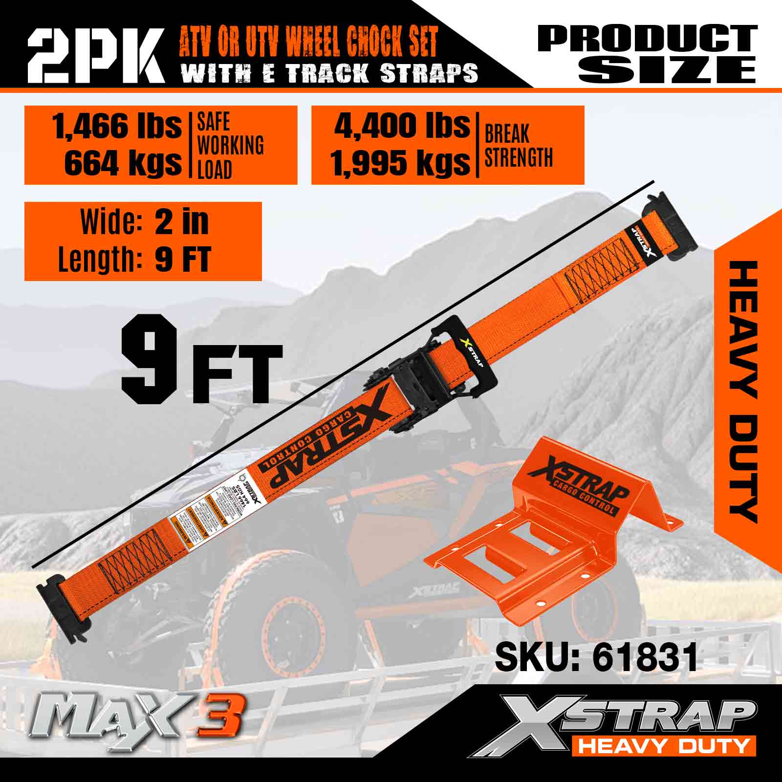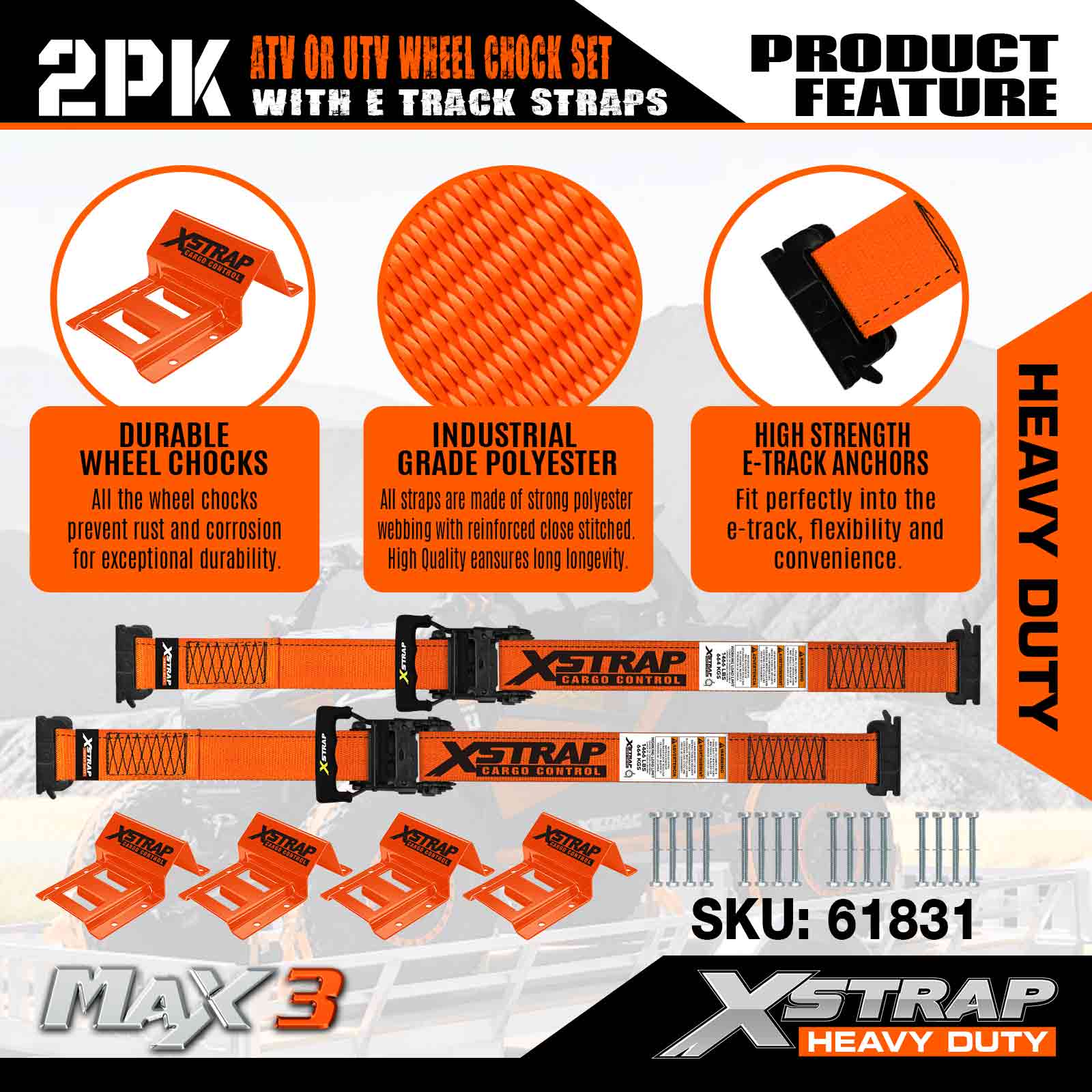 Xstrap UTV Wheel Chock Tie Down Kit 4,400lb Kekuatan Pecah (4) Treler Tugas Berat Tali Tire Ratchet (8) Wheel Chock - Sistem E Track untuk ATV, UTV, Mesin Pemotong Rumput Empat Roda - Jingga