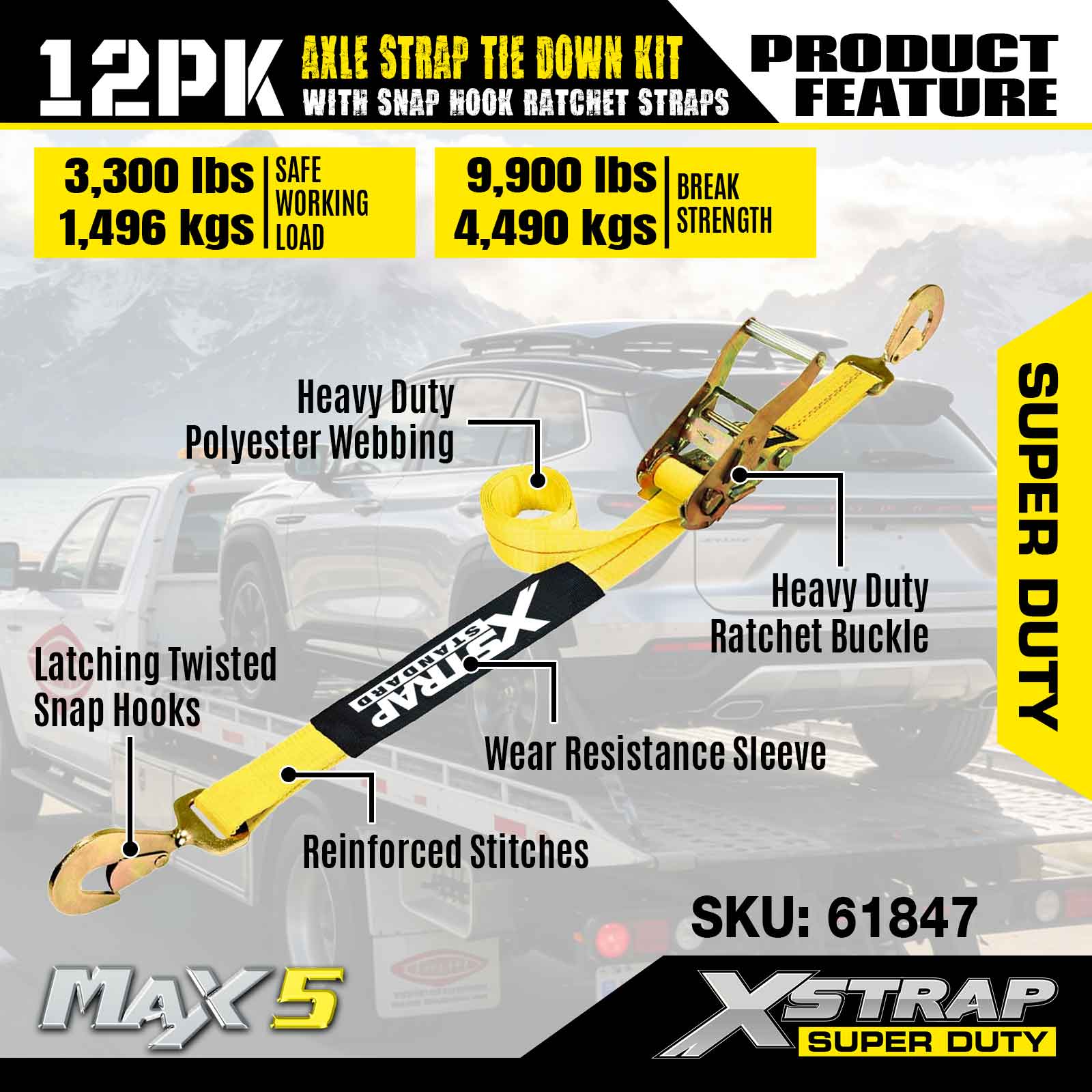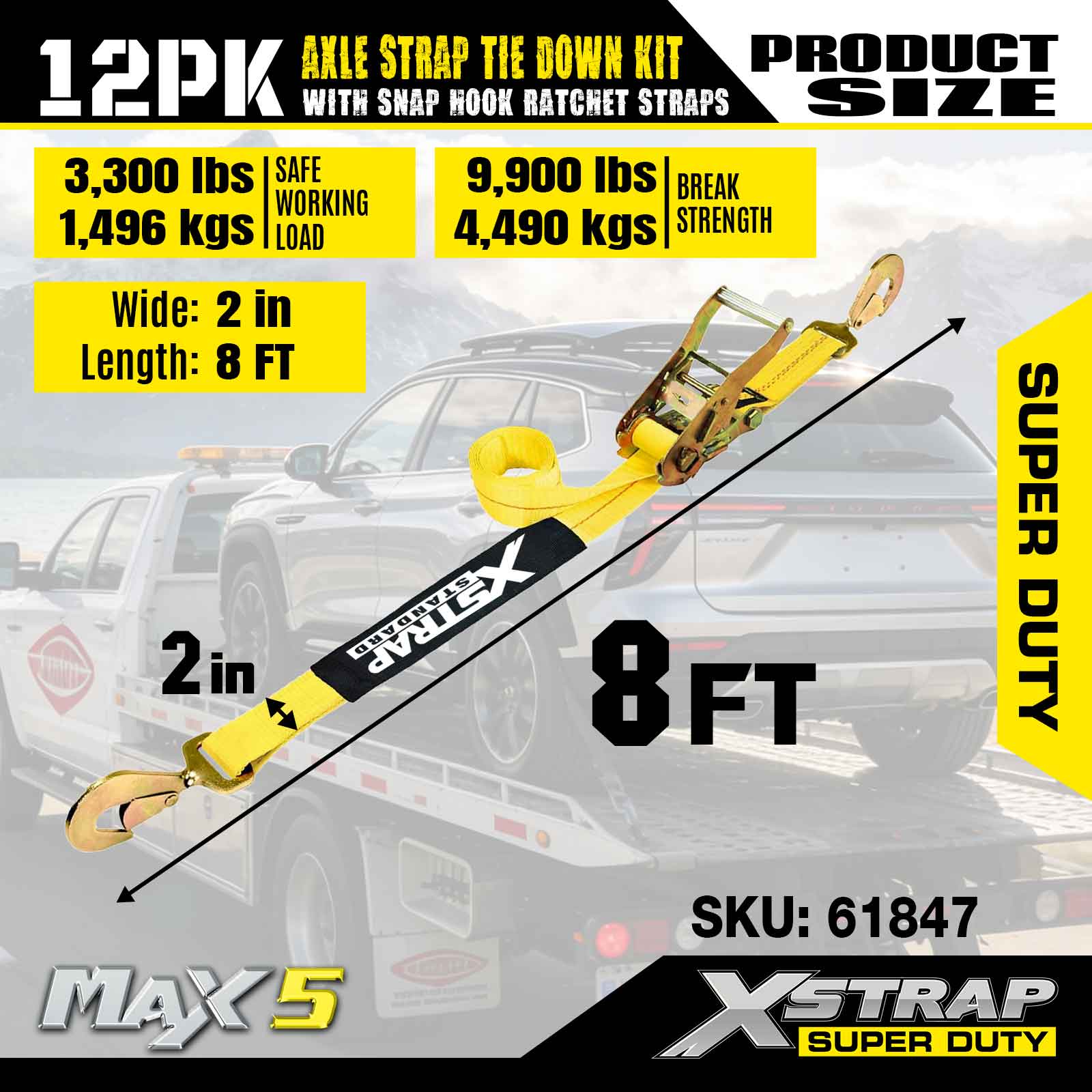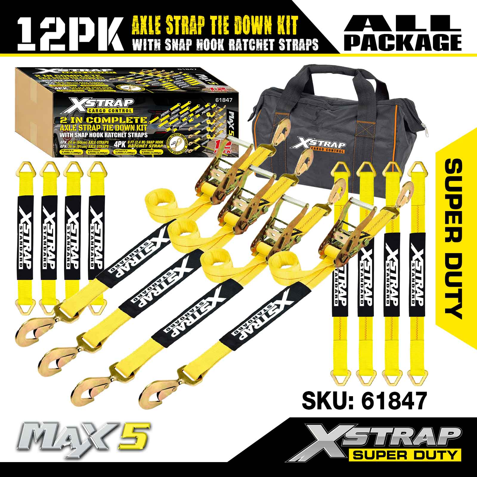 Kit Pengikat Tali Gandar 12PK Xstrap (dengan Tali Ratchet Cangkuk Snap) – Tugas Super. Ia mempunyai beban kerja yang selamat sebanyak 3,300LBS (1,496KGs) dan kekuatan pecah 10,000LBS (4,490KGs).