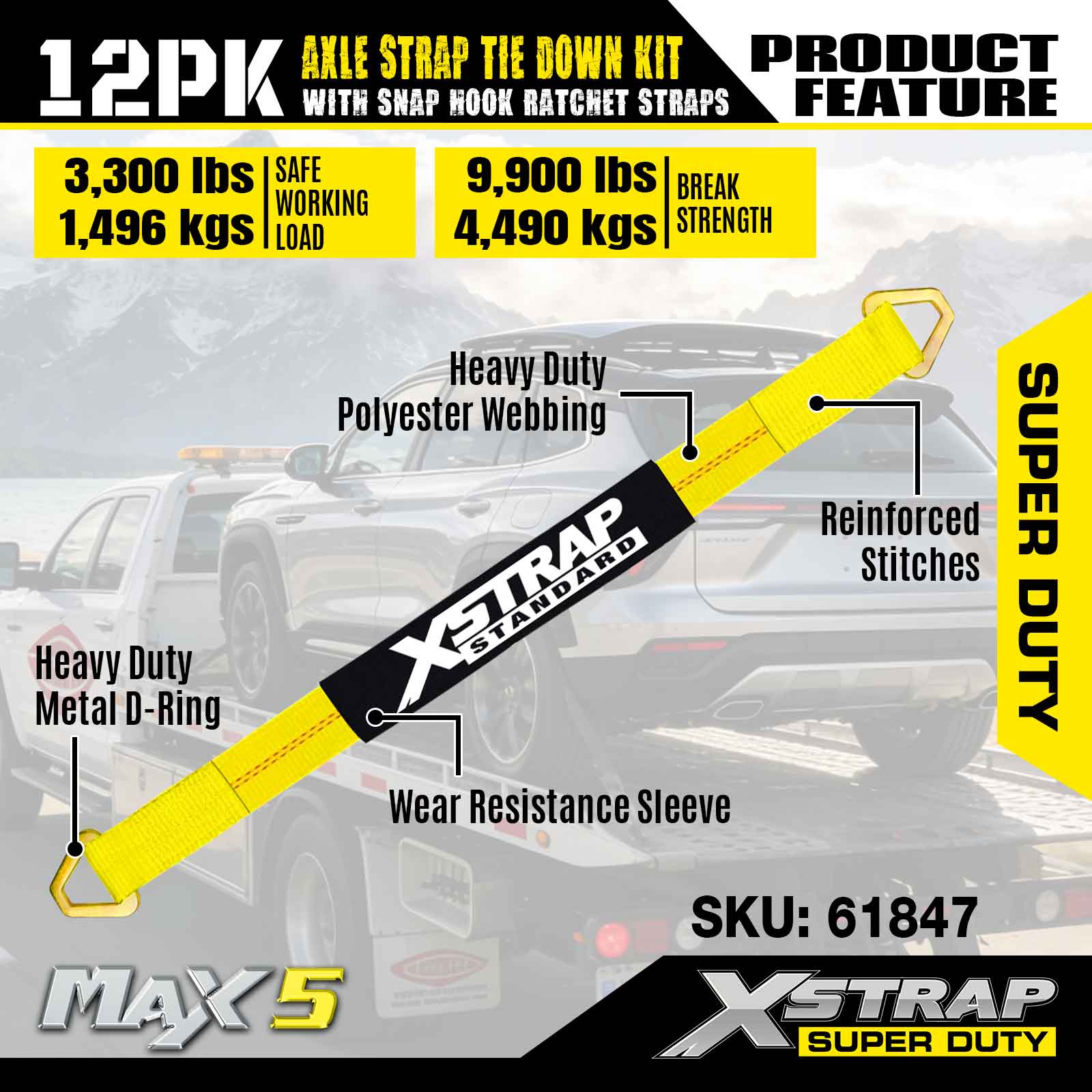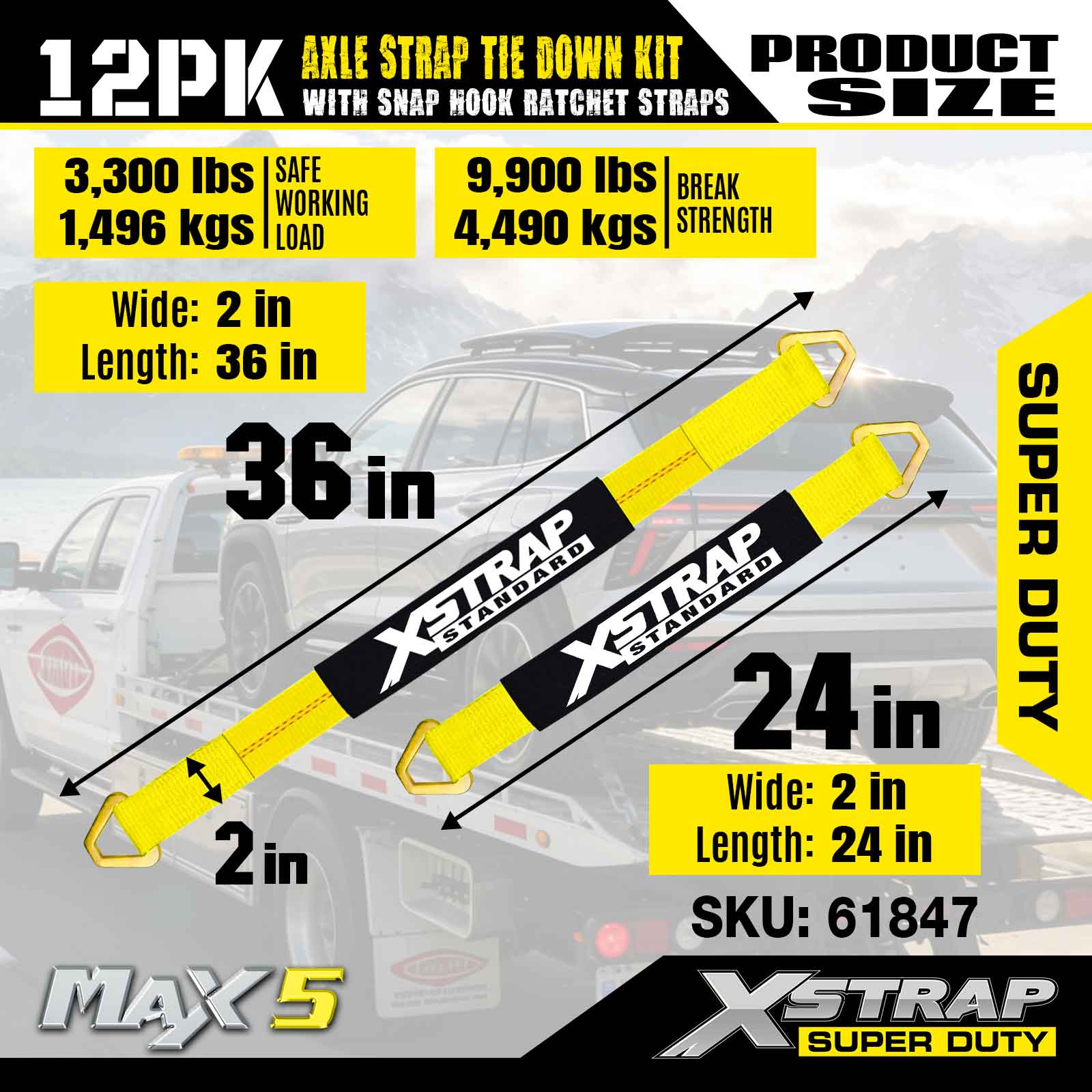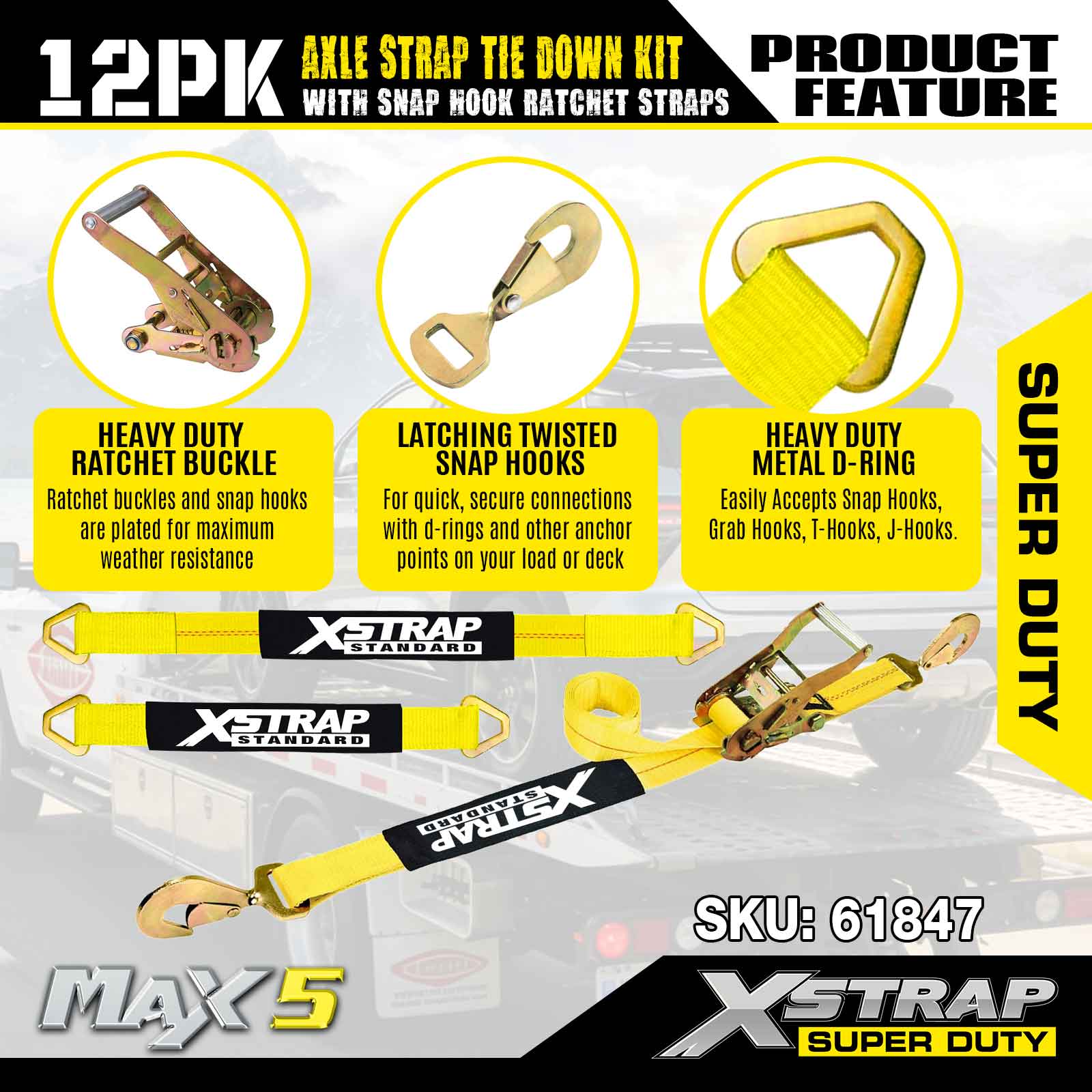 Kit Pengikat Tali Gandar 12PK Xstrap (dengan Tali Ratchet Cangkuk Snap) – Tugas Super. Ia mempunyai beban kerja yang selamat sebanyak 3,300LBS (1,496KGs) dan kekuatan pecah 10,000LBS (4,490KGs).