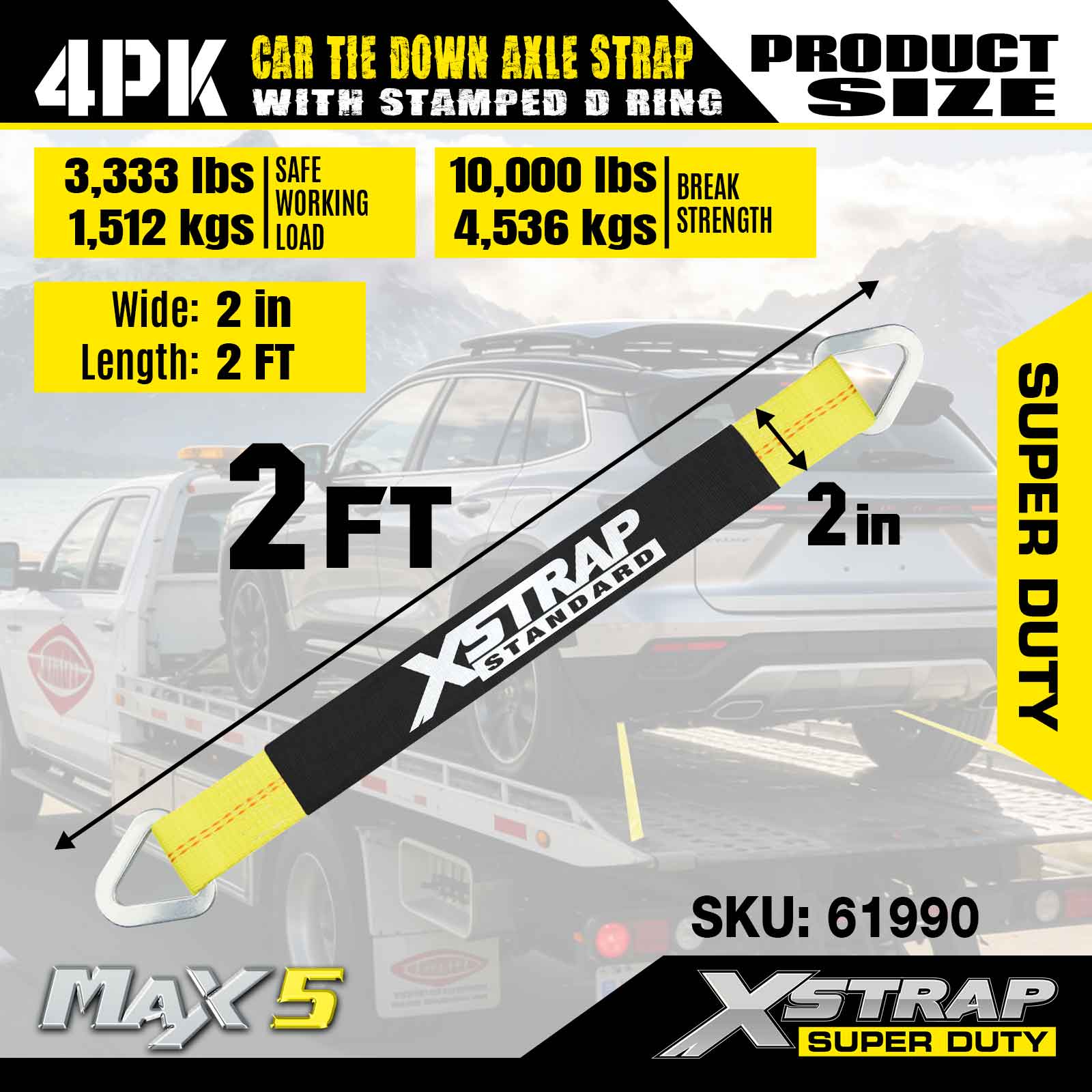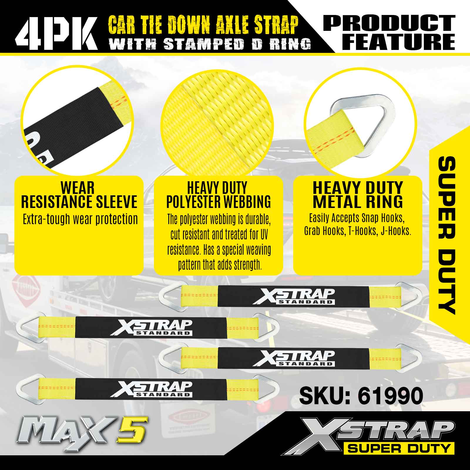 Xstrap 4PK Car Tie Down Axle Strap (dengan Cop D-Ring) – Super Duty. Ia mempunyai beban kerja yang selamat sebanyak 3,333LBS (1,512KGs) dan kekuatan pecah 10,000LBS (4,536KGs).
