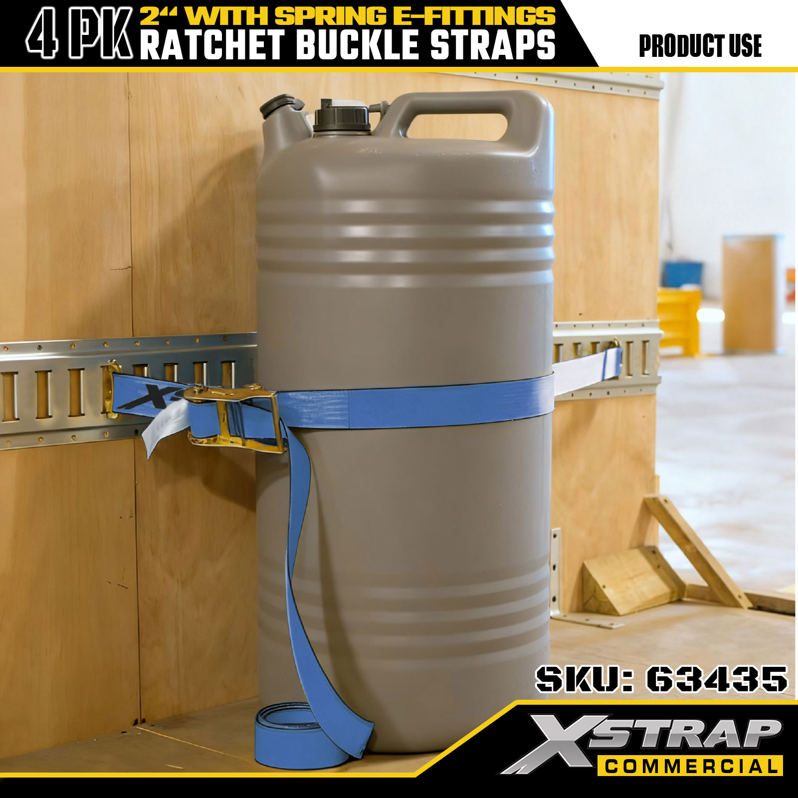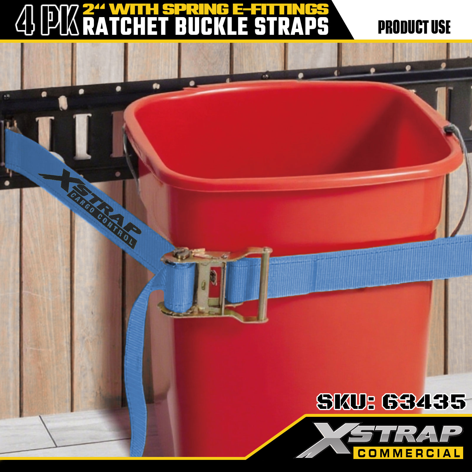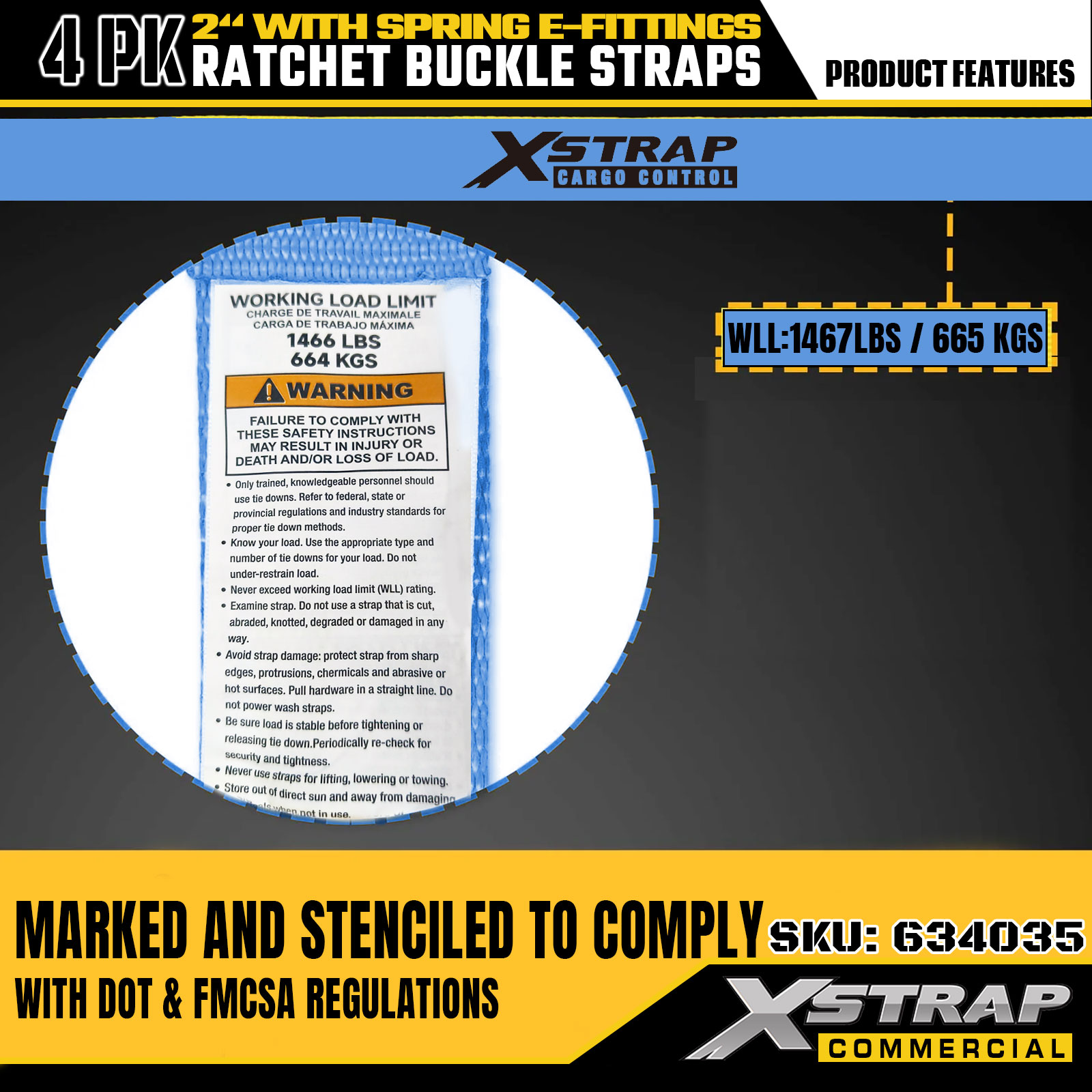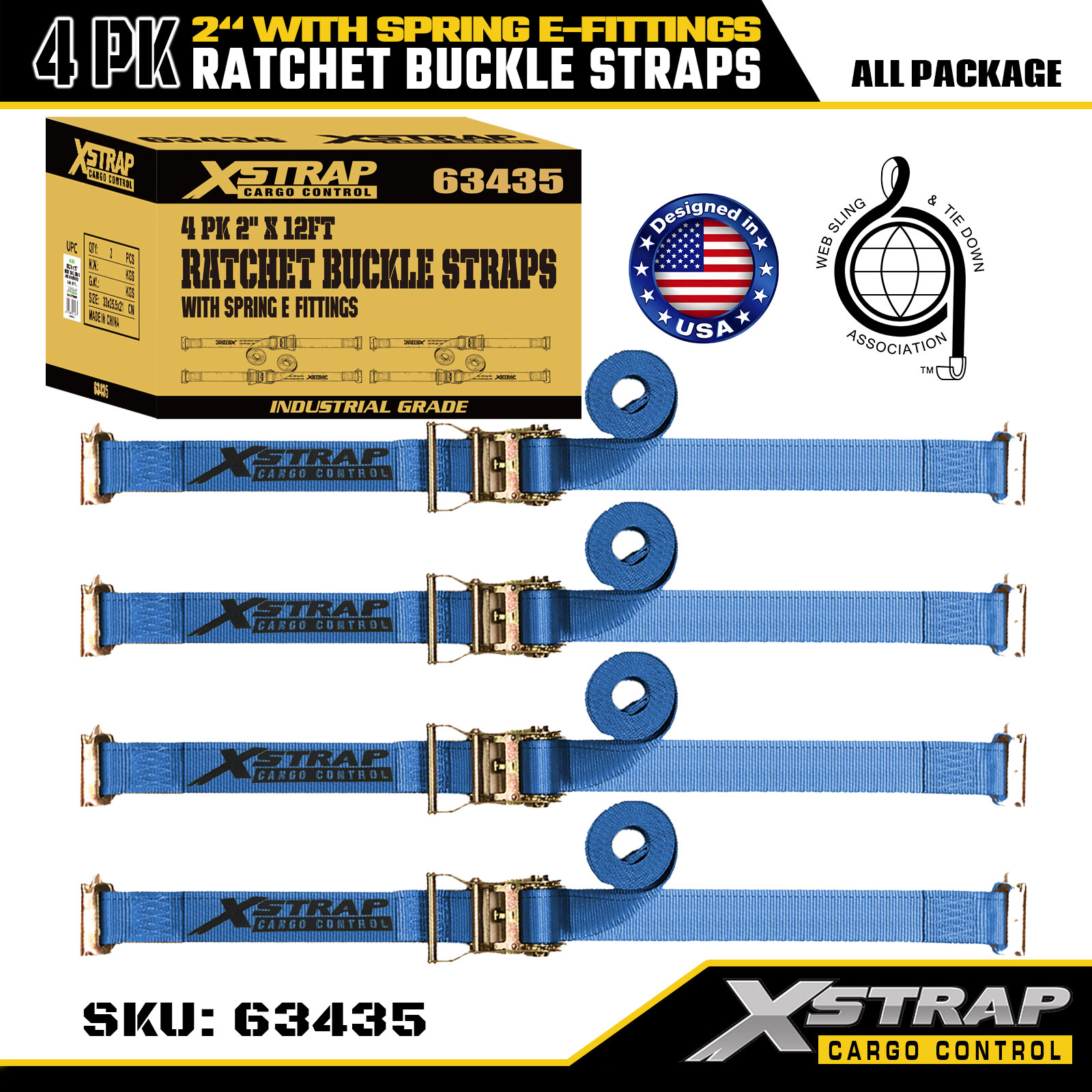 Xstrap 4 Pack Ratchet Tie-Down Straps, Tali Pengaman Kargo Poliester 2" x 12' dengan Spring E-Fittings, 1467 lbs Safe Working Load (SWL) & 4401 lbs Breaking Strength, untuk Lori, Mesin Pemotong, ATV