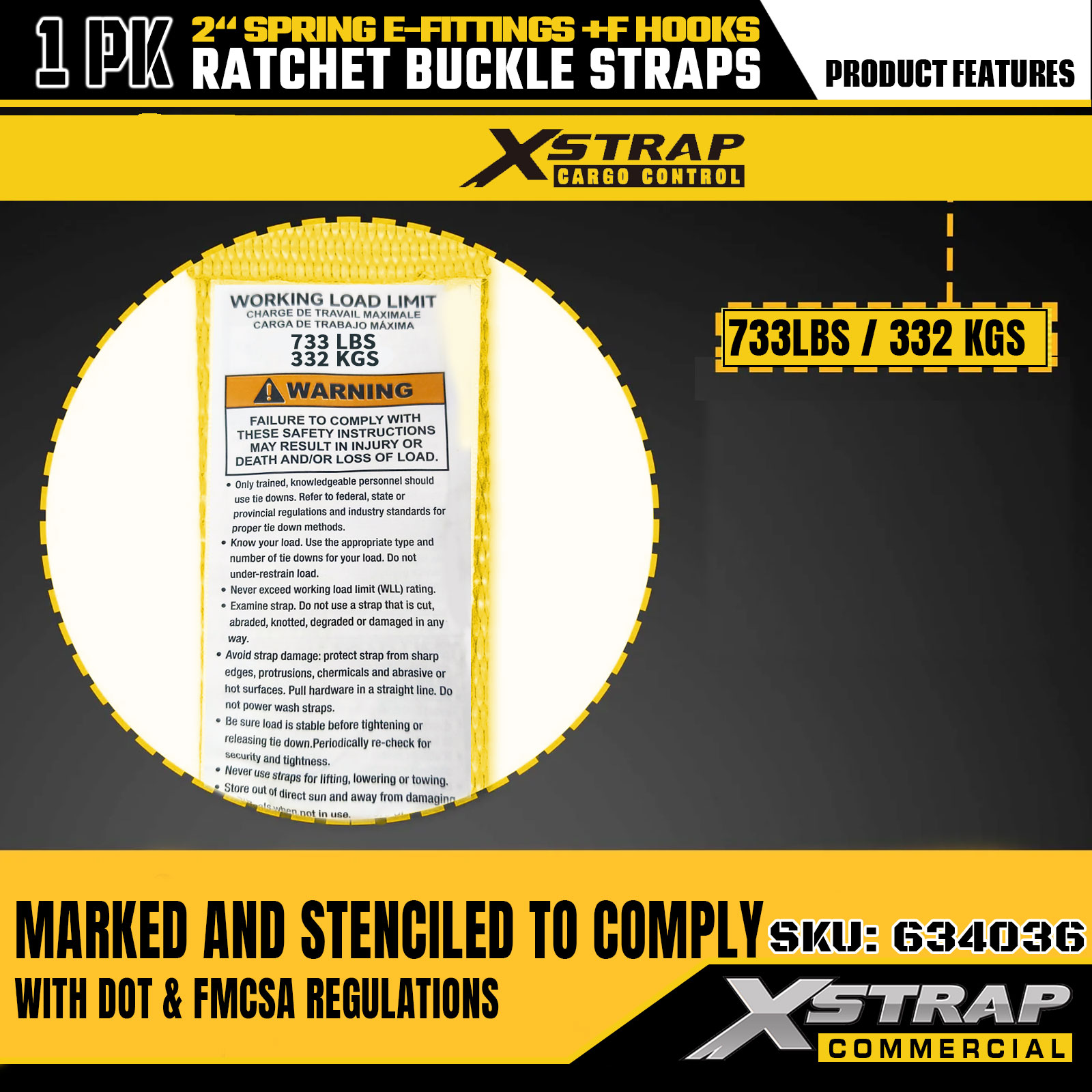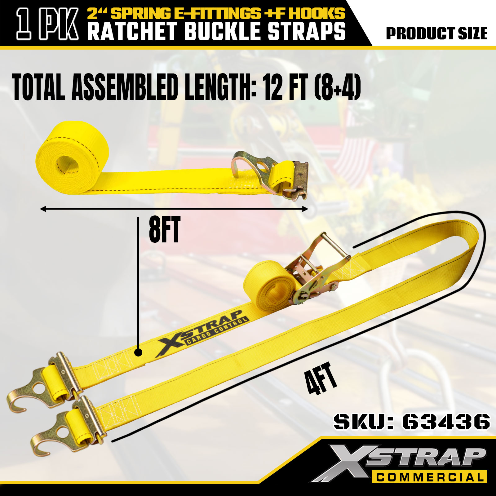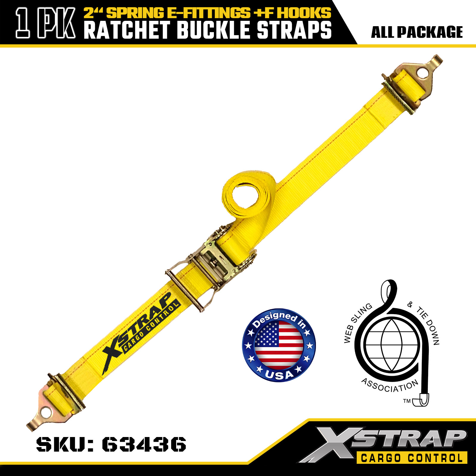Tali Ratchet Tie-Down 1 Pek Xstrap, Pengikat Kargo Tugas Berat 2" x 12' dengan E-Fitting Spring dan Cangkuk F (Kuning), Kapasiti 733 lbs untuk Pengaman Treler, Lori, Van & Motosikal