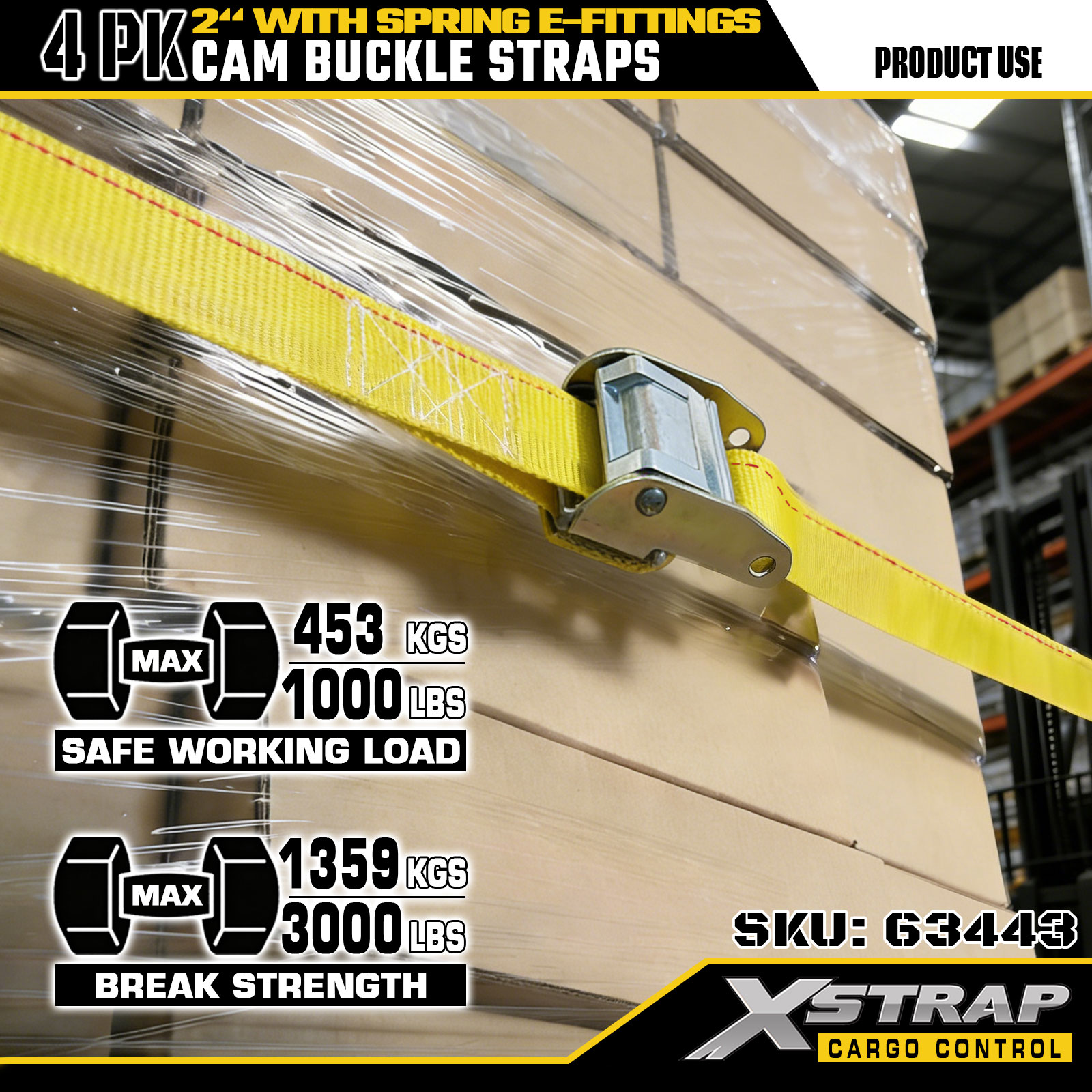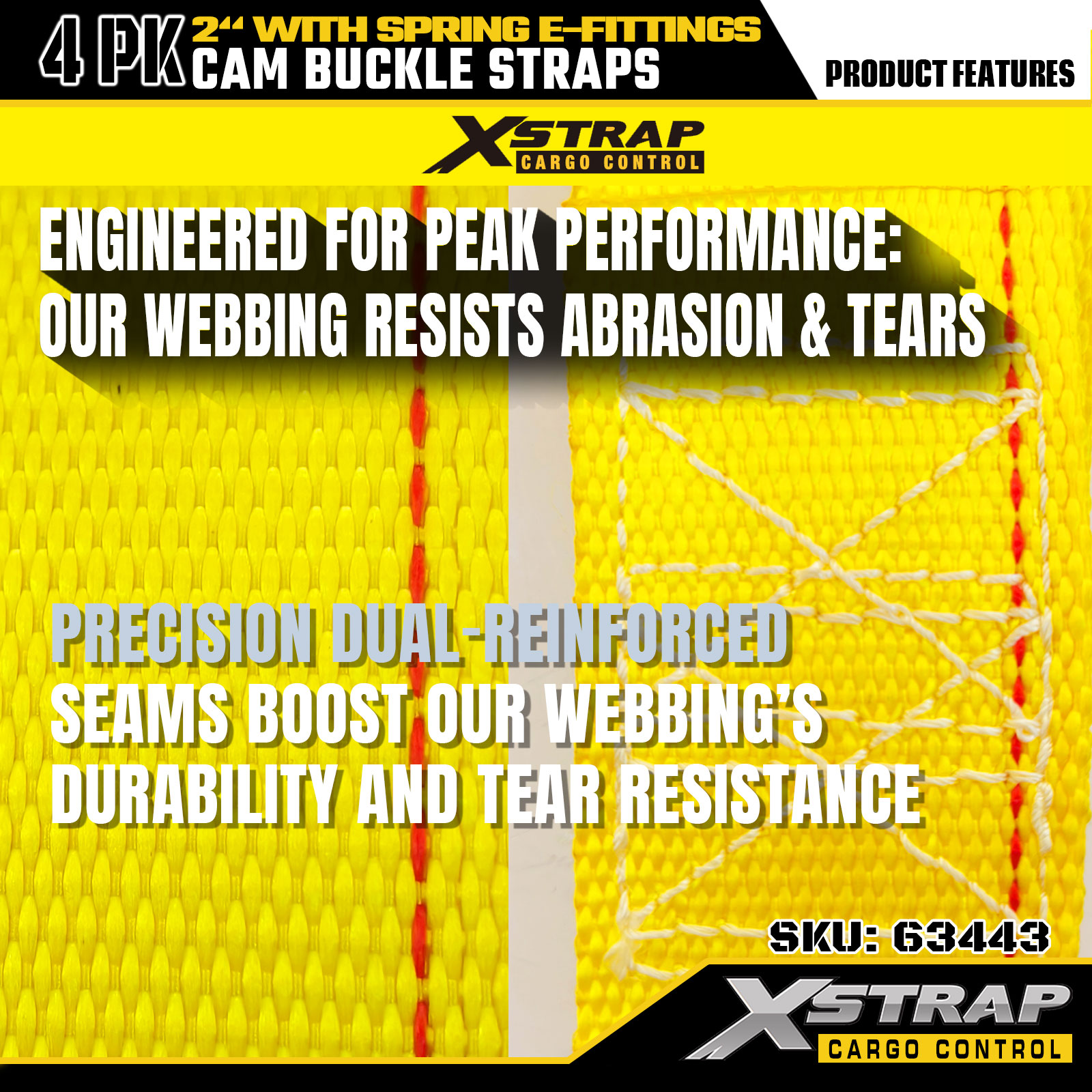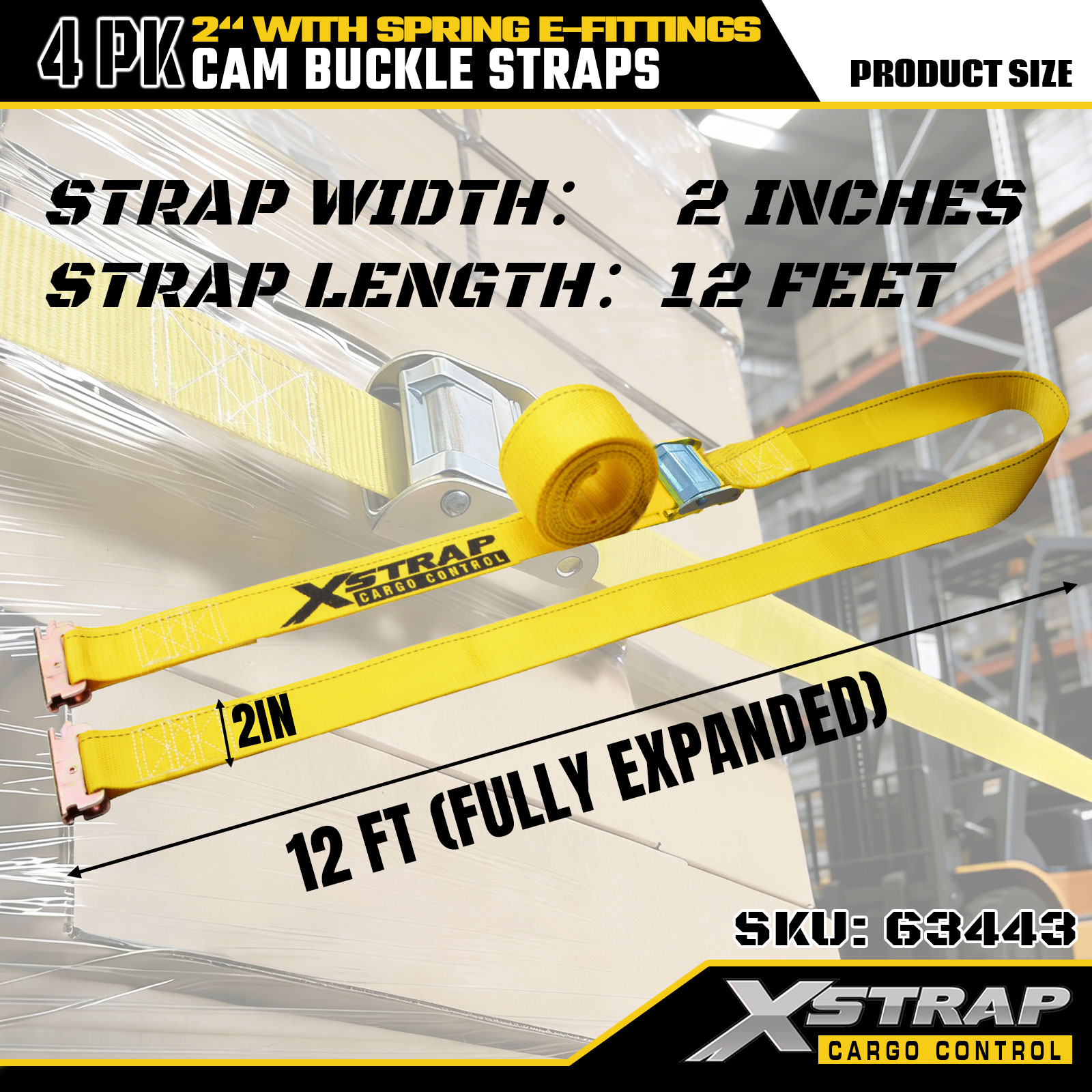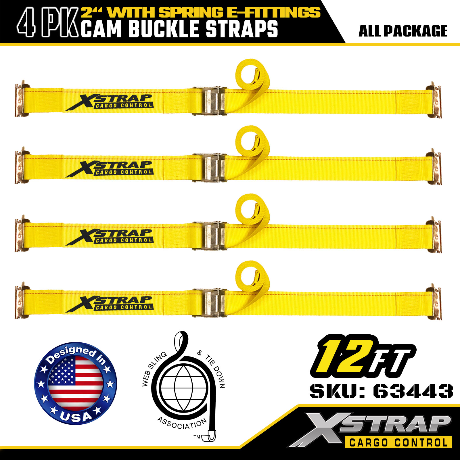 Xstrap 63443 4 Pek 2" x 12' Tali Gancu Cam Kuning dengan E-Fitting Spring, 1000 lbs SWL & 453 lbs Kekuatan Pecah untuk Pengendalian Kargo, Penempatan Semula & Transit