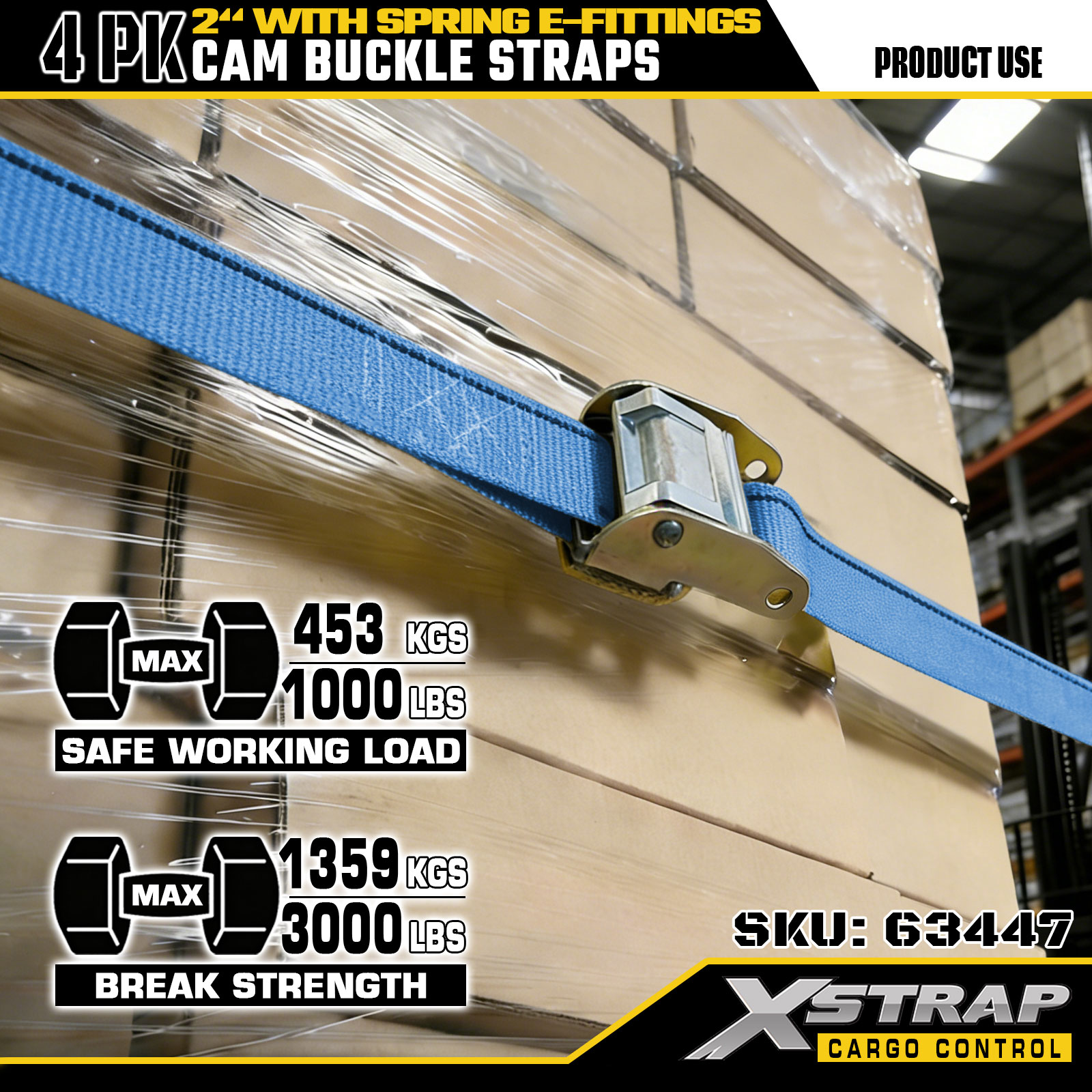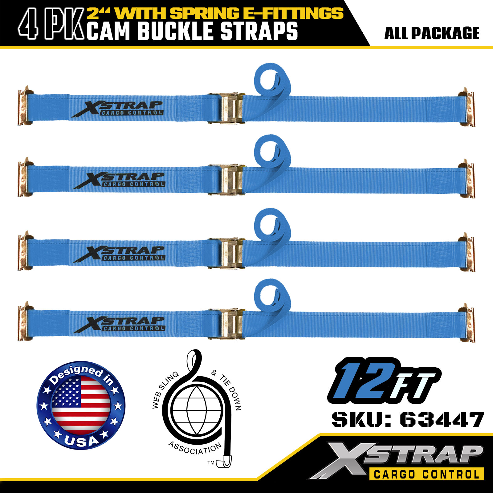 Xstrap 63447 4 Pek Tali Ratchet Biru 2" x 12' dengan E-Fitting Spring & Cangkuk F, 733 lbs SWL & 332 lbs Kekuatan Pecah untuk Kawalan Kargo, Pergerakan & Pengangkutan