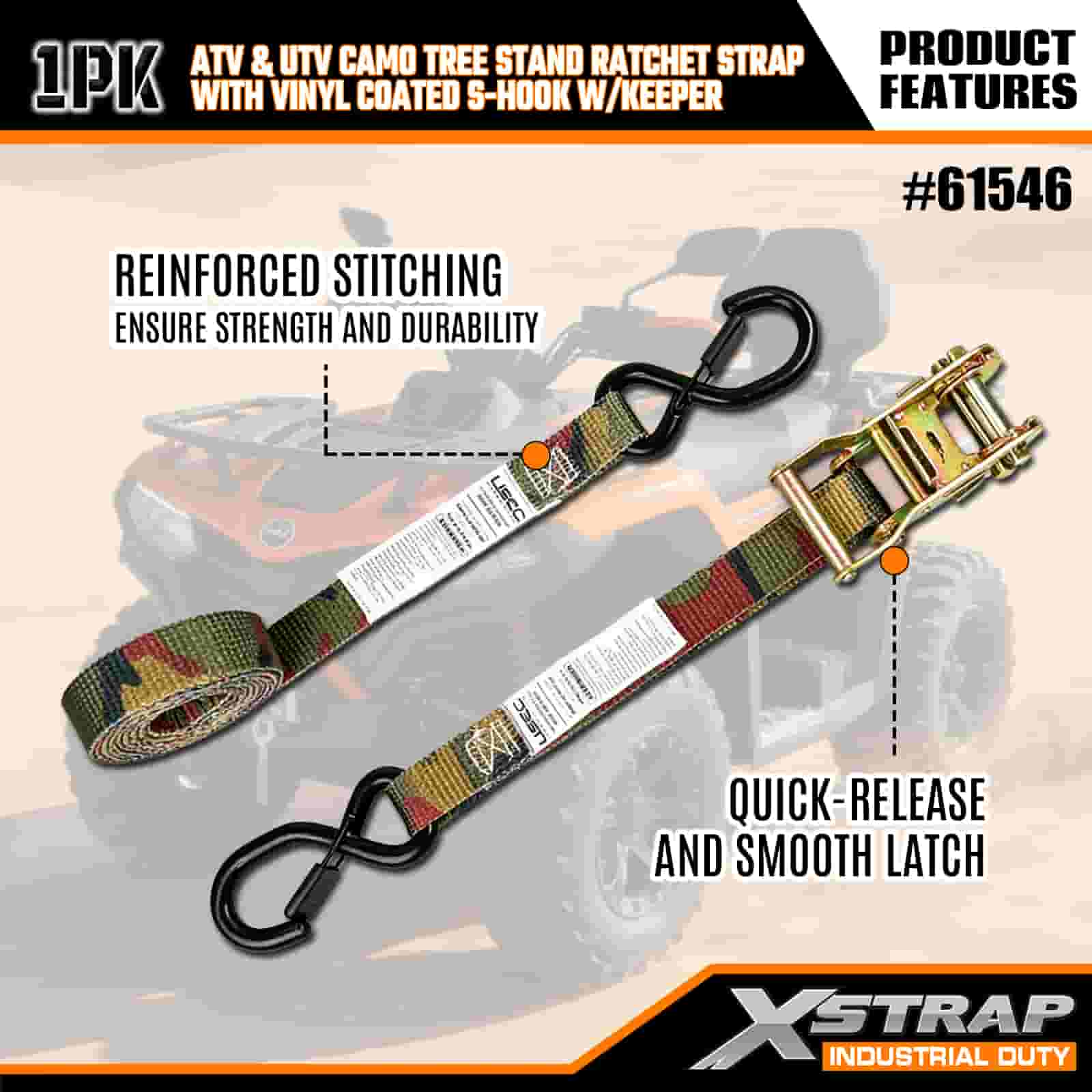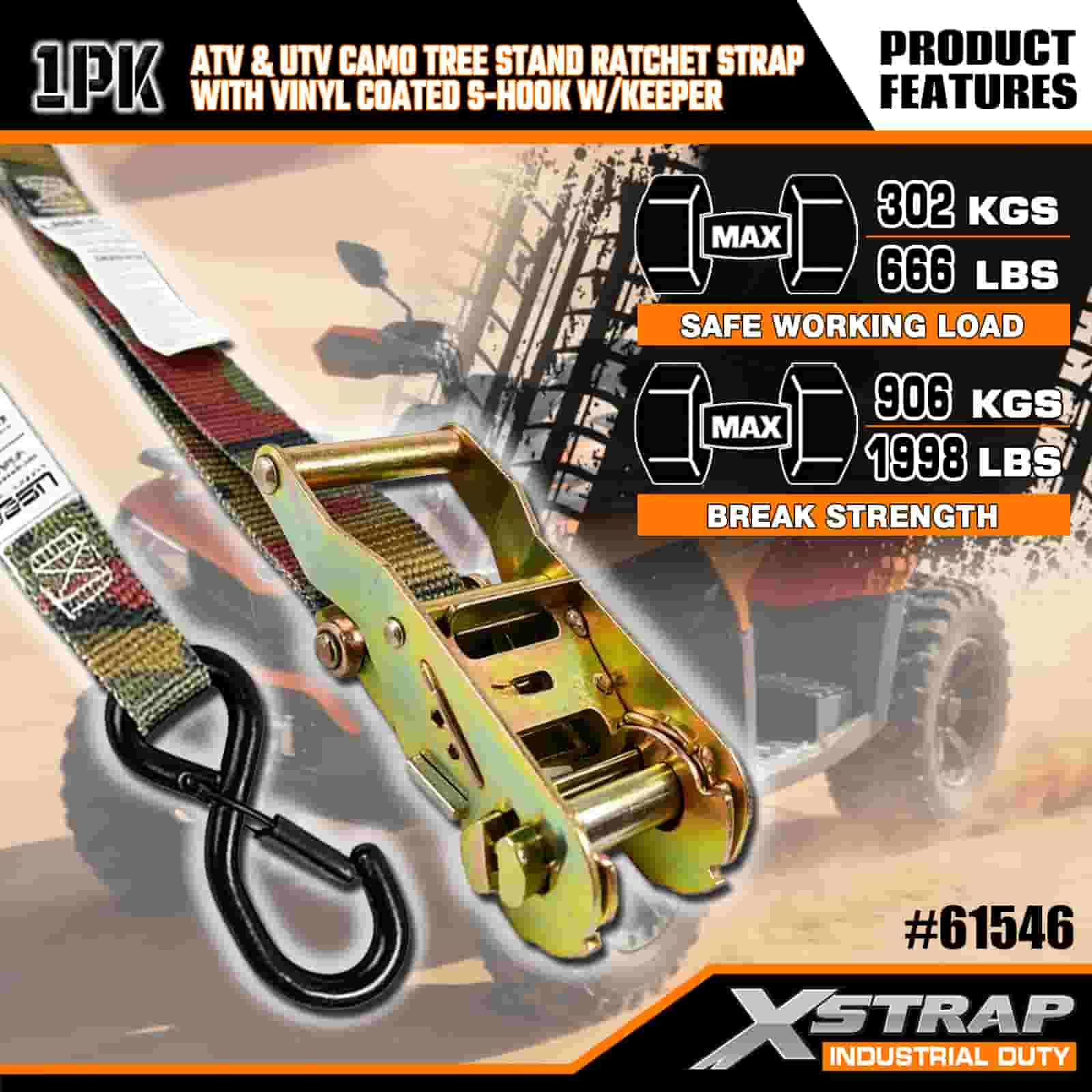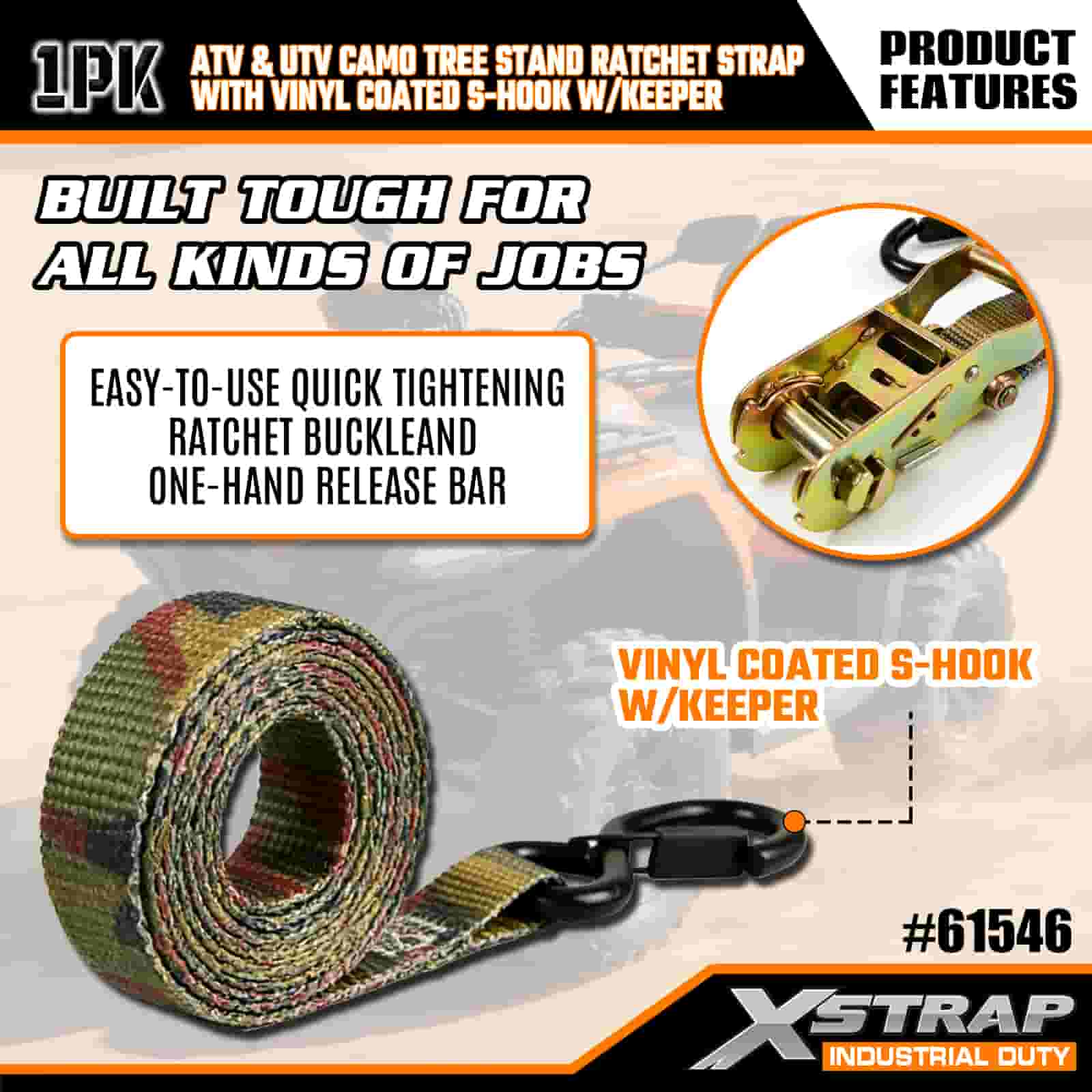 - Ketahanan Hunt-Proof:Kait S bersalut vinil menghalang calar pada kenderaan atau dirian pokok anda, manakala ratchet kalis kakisan tahan terhadap hujan, lumpur dan lembapan. Webbing camo tahan terhadap kerosakan dan kerosakan UV, jadi ia kekal kuat musim demi musim.