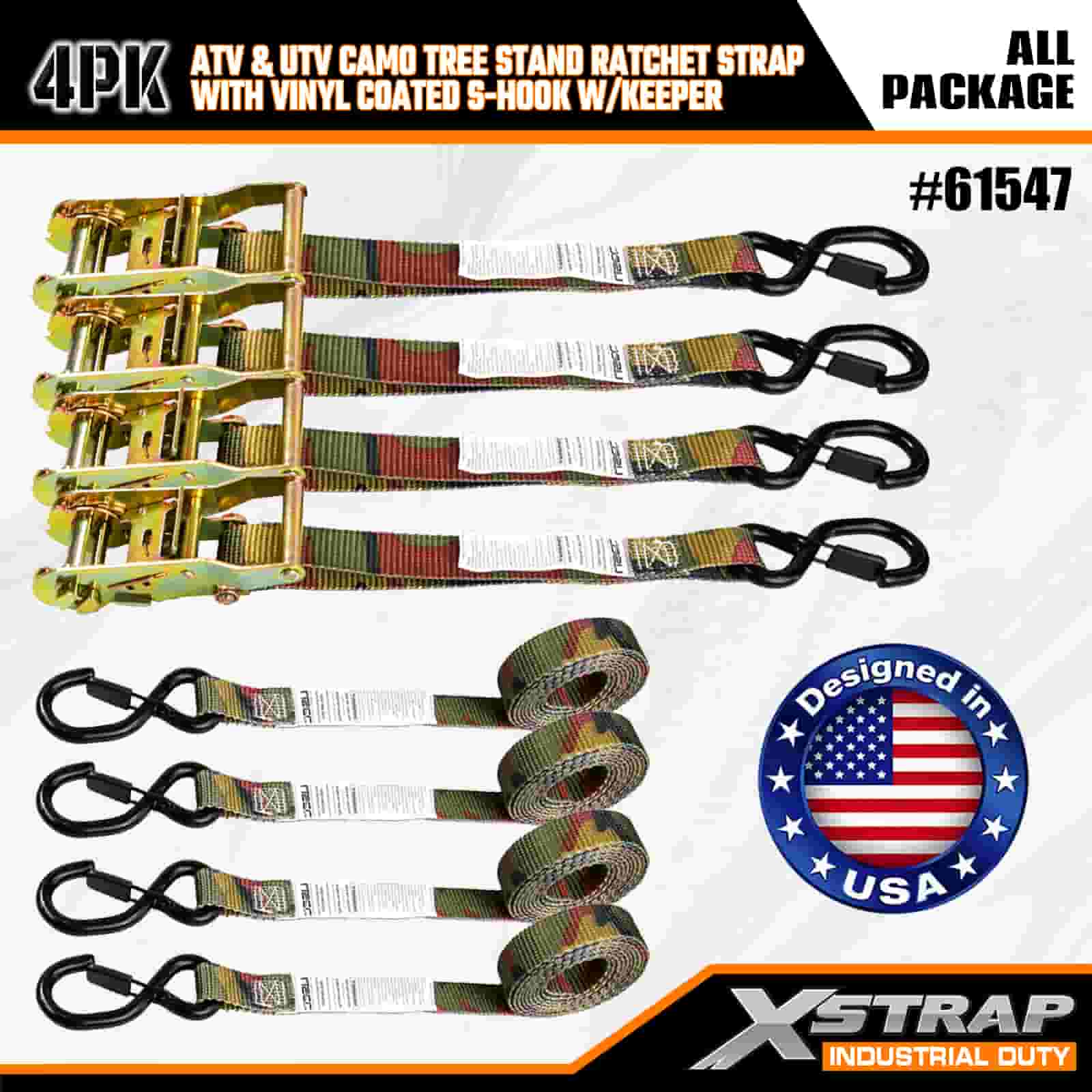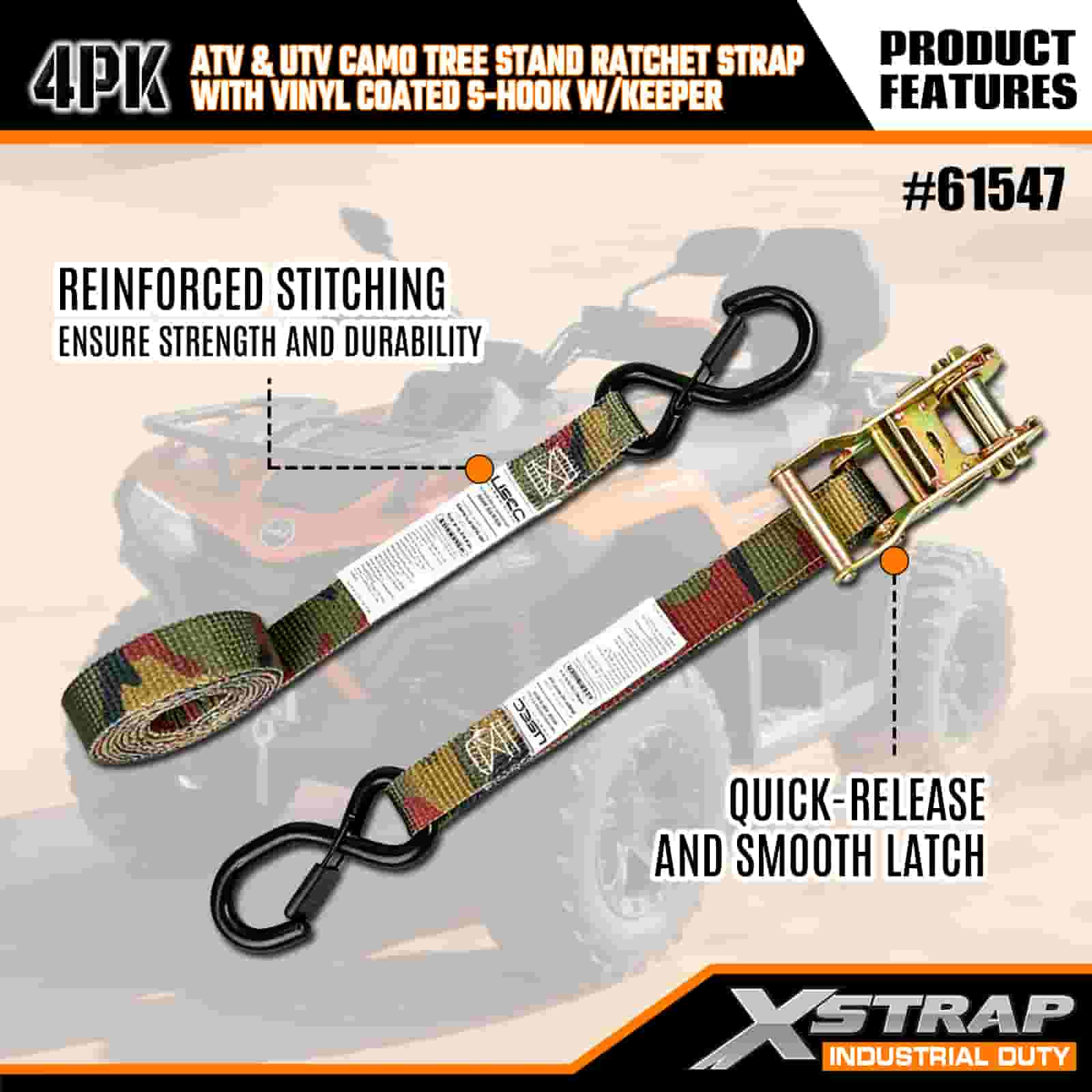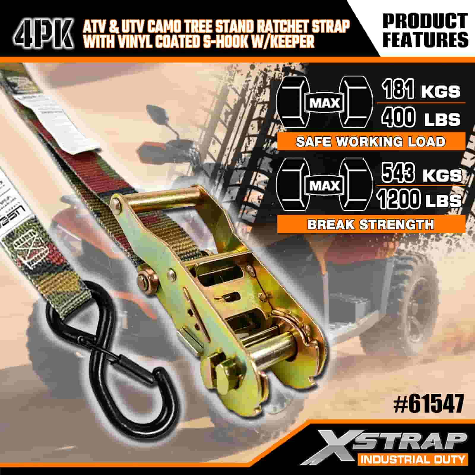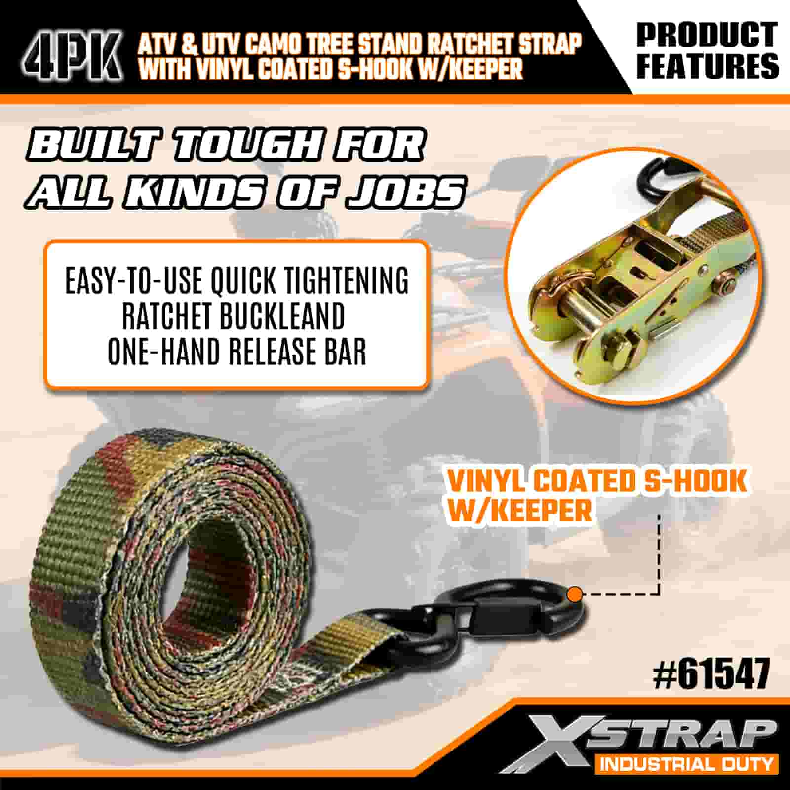 - Kalis Cuaca & Tahan Gores: Cangkuk S bersalut vinil menghalang calar pada kenderaan atau diri pokok anda, manakala ratchet kalis kakisan tahan terhadap hujan, salji dan lembapan. Webbing camo menahan kerosakan UV dan berjumbai, jadi ia kekal kuat musim demi musim.