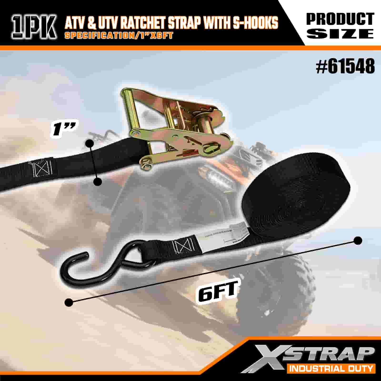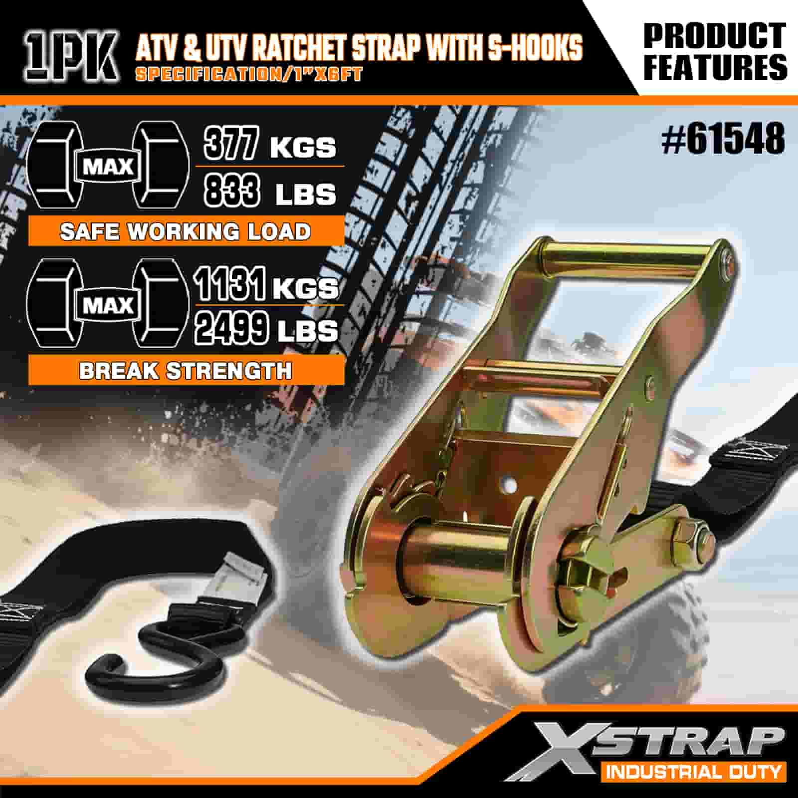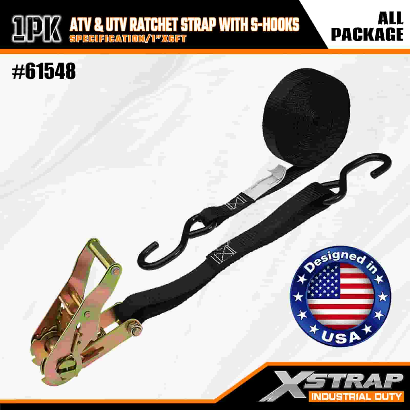 Xstrap ATV & AUV Ratchet Strap dengan S Cangkuk, 1” x 6’ Poliester Tie Down Strap Ratchet Strap, 833lbs Kapasiti Kargo Lashing Tali Pengaman dengan S Cangkuk untuk Trailer, Bot Ski Treler Katil Rata, Kereta Kecil, Peralatan Berat.