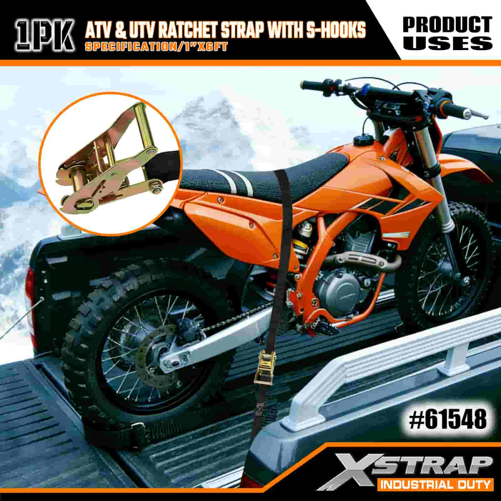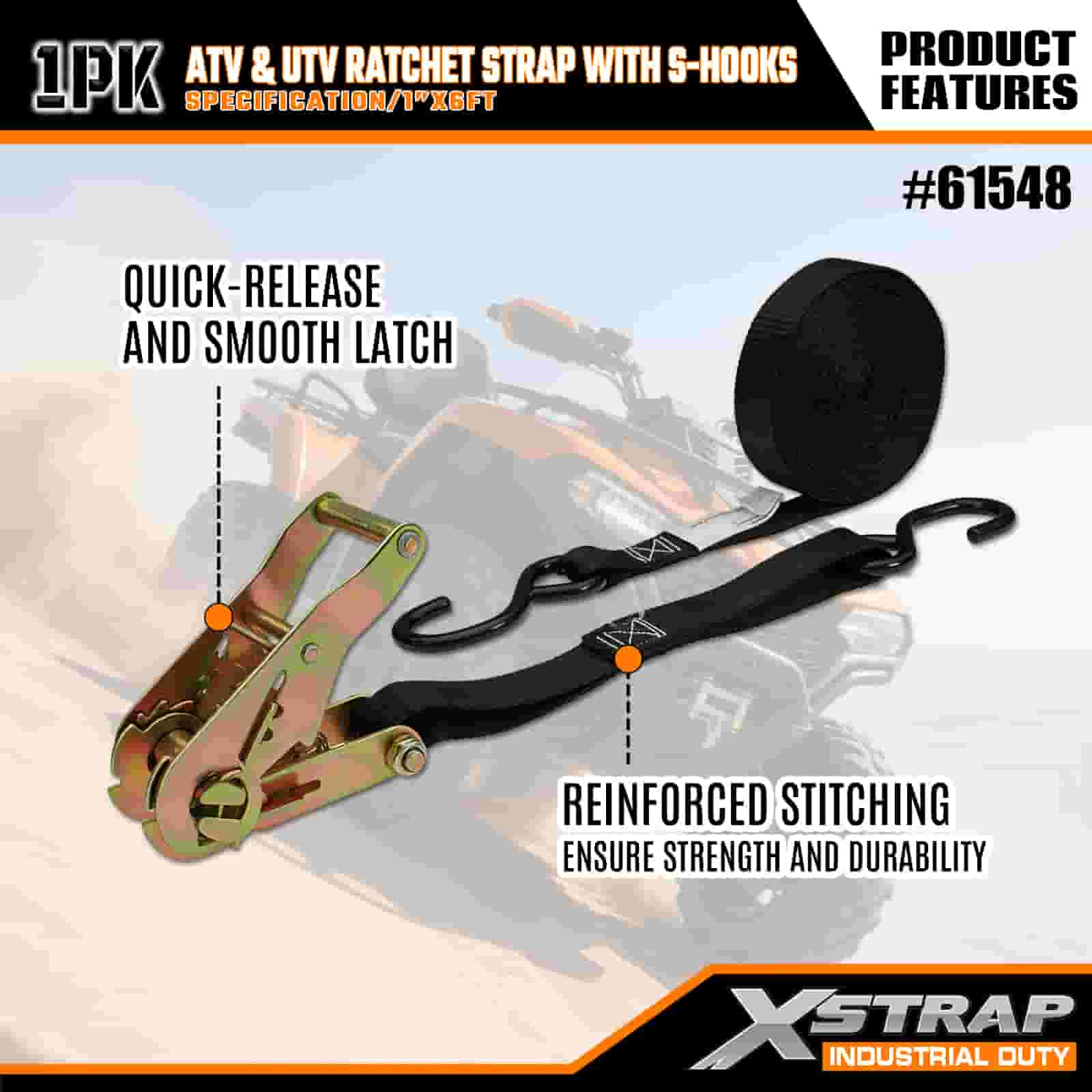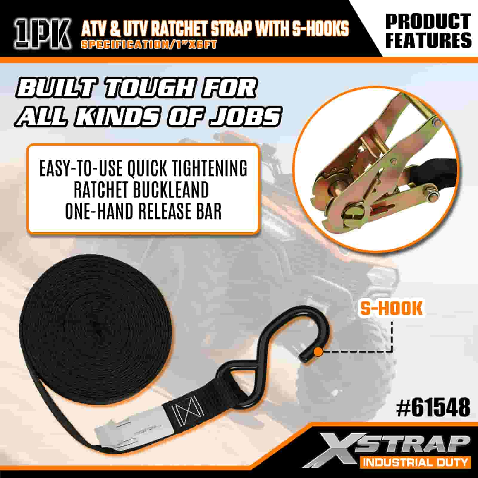 Xstrap ATV & AUV Ratchet Strap dengan S Cangkuk, 1” x 6’ Poliester Tie Down Strap Ratchet Strap, 833lbs Kapasiti Kargo Lashing Tali Pengaman dengan S Cangkuk untuk Trailer, Bot Ski Treler Katil Rata, Kereta Kecil, Peralatan Berat.