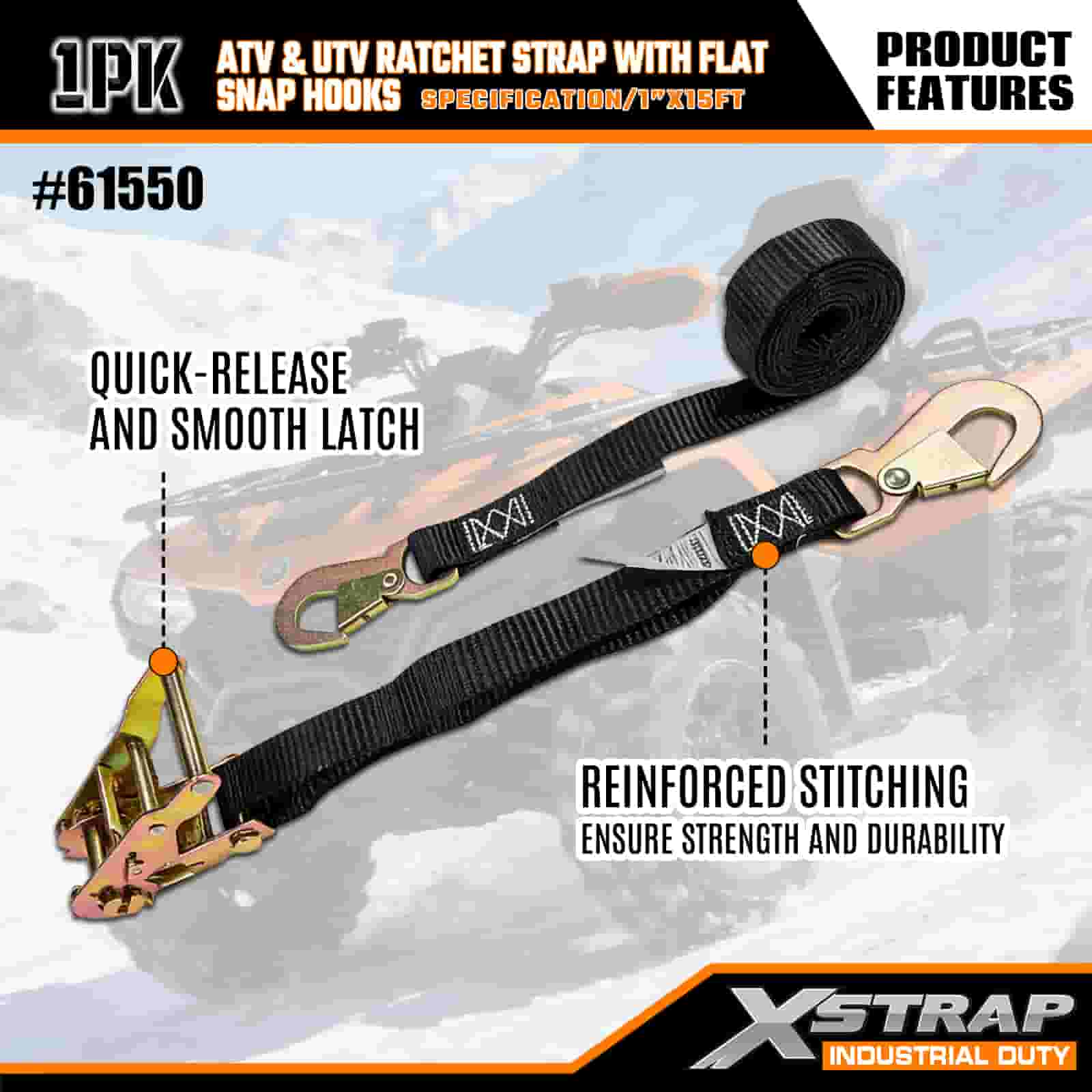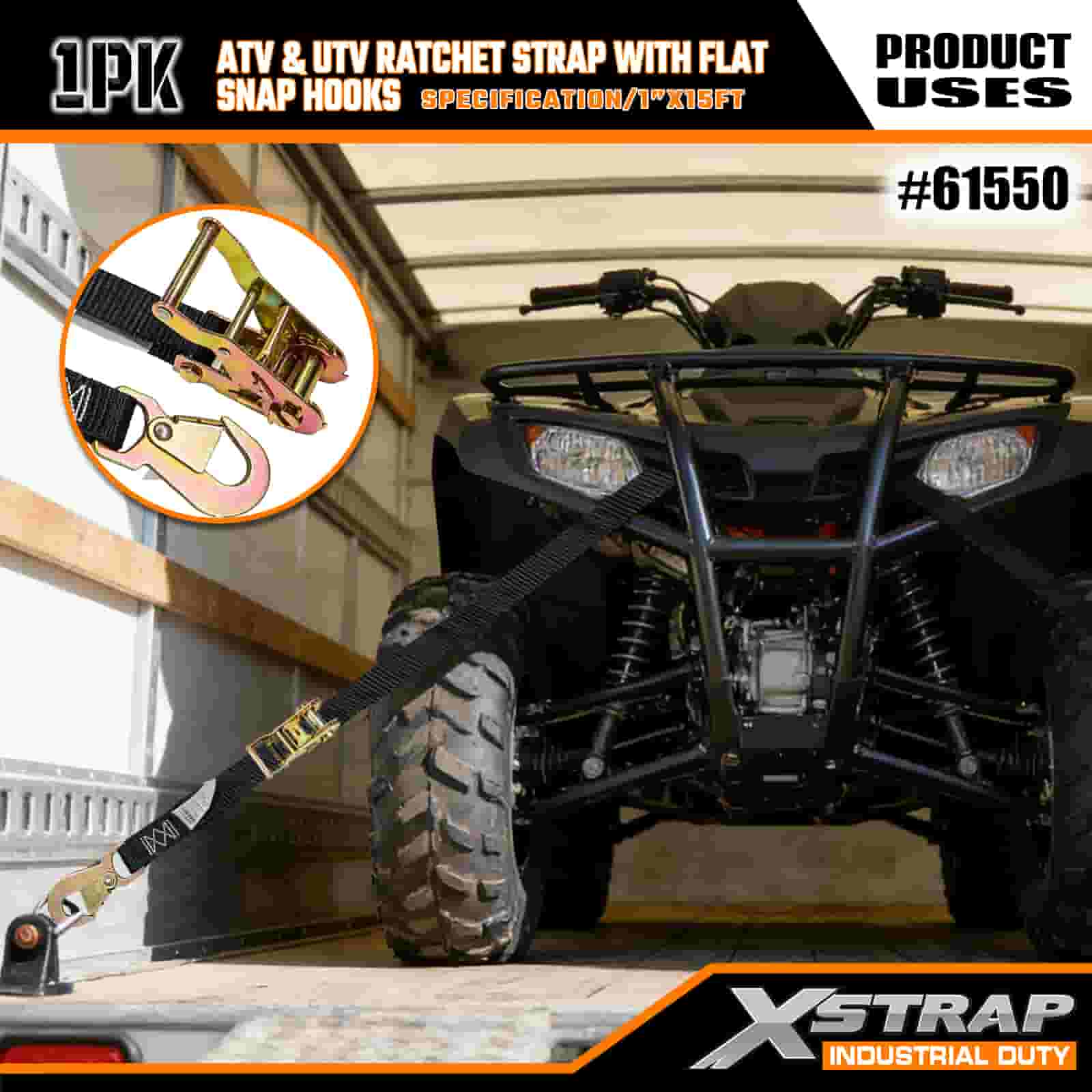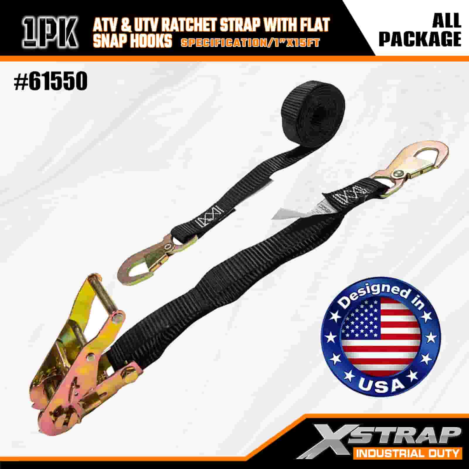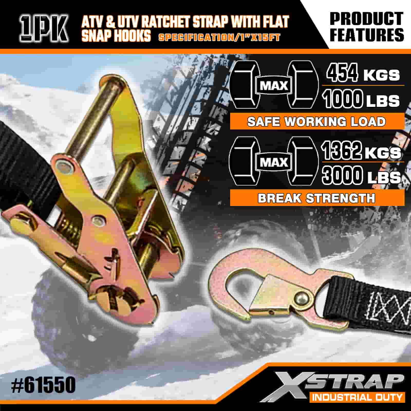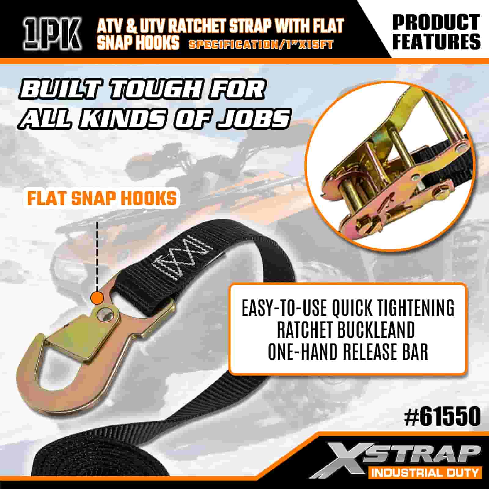 Xstrap ATV & AUV Ratchet Strap dengan Flat Snap Hooks, 1” x 15’ Poliester Tie Down Strap Ratchet Strap, 1000lbs Kapasiti Ikatan Kargo Tali Pengaman dengan Flat Snap untuk Trailer, Bot Ski Treler Katil Rata, Kereta Kecil, Peralatan Berat.