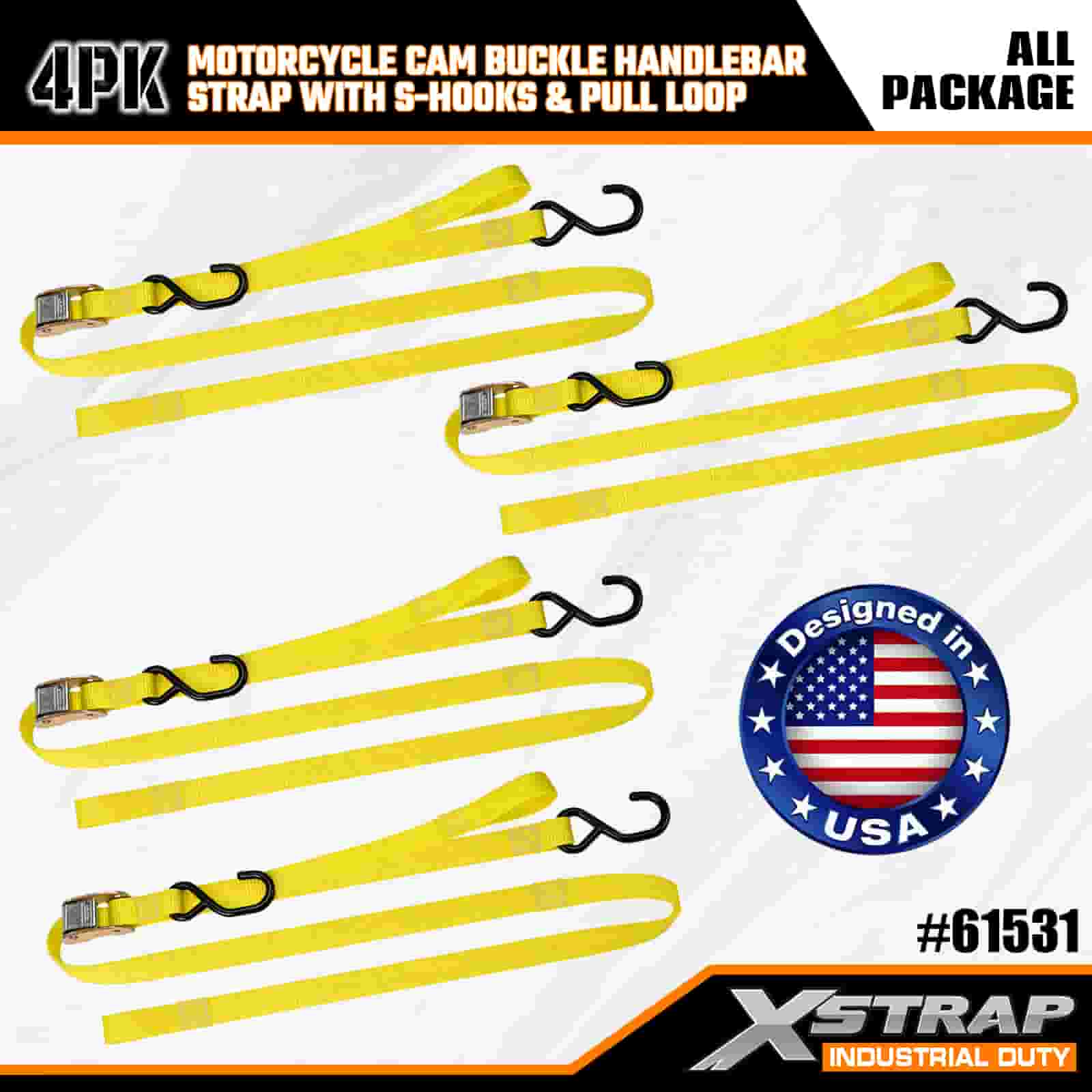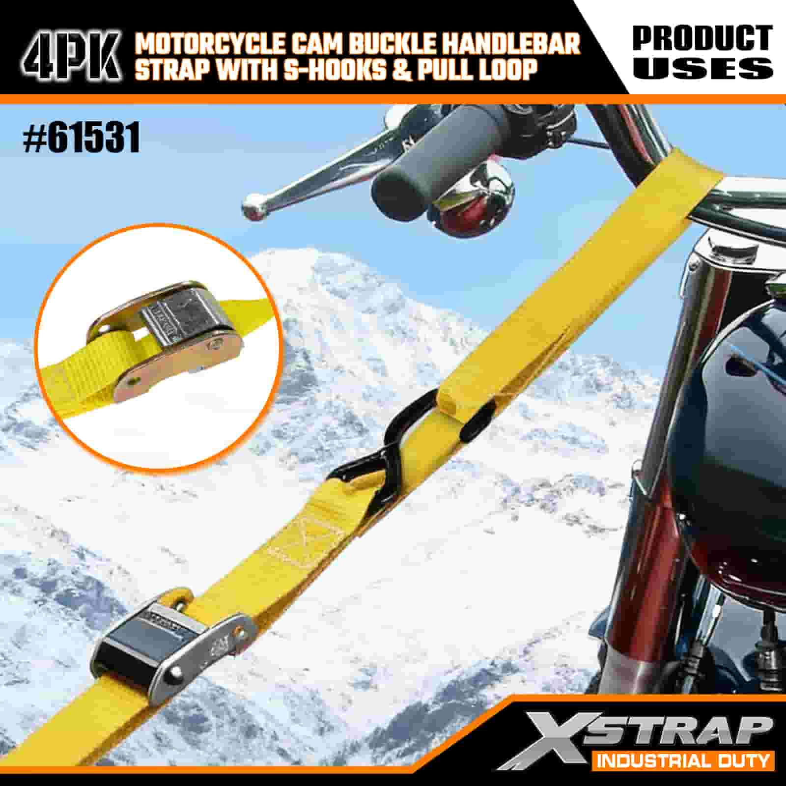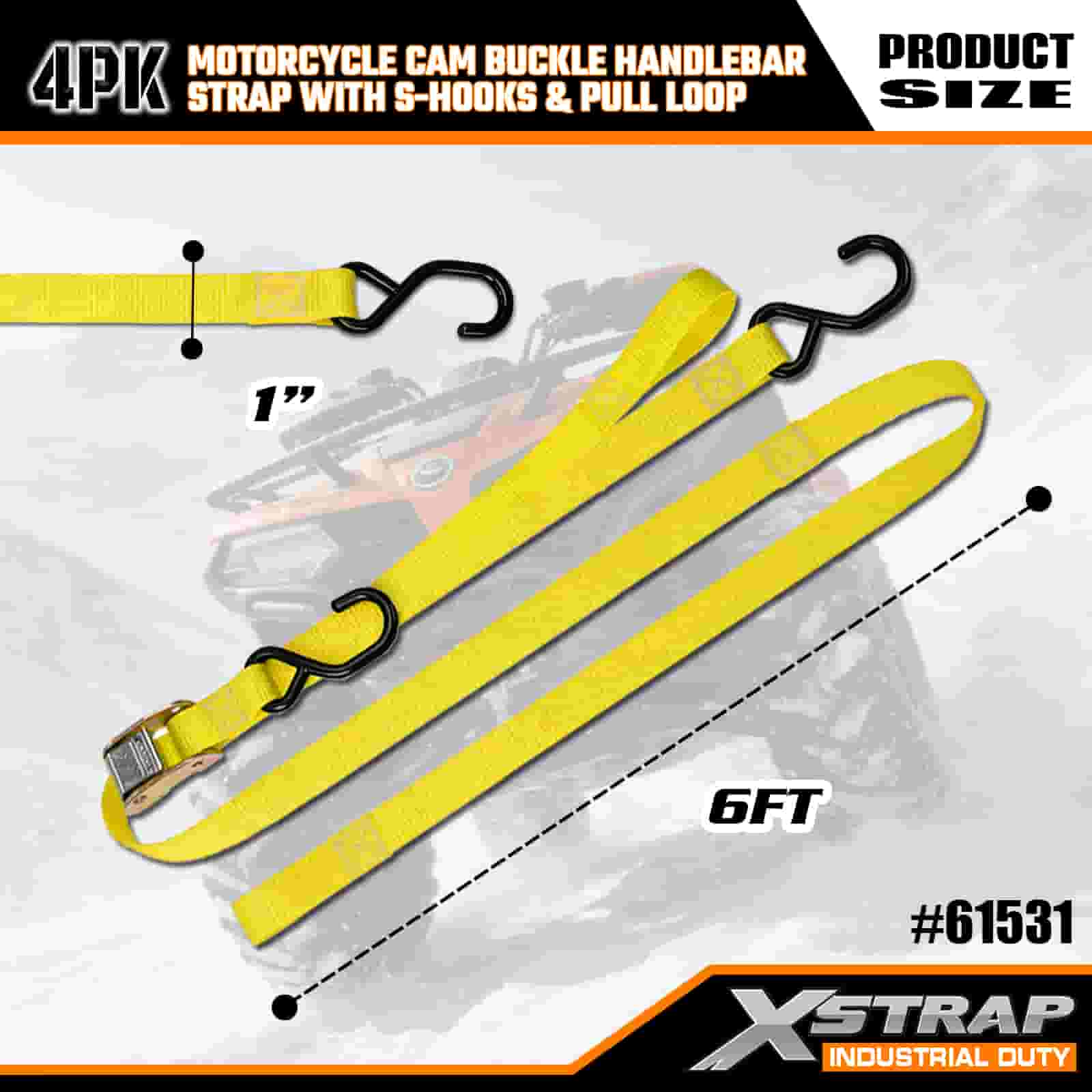 - Tali 4-Pek 6FT untuk Kegunaan Motosikal: Dijual sebagai set 4-tali (1 inci lebar × 6 kaki panjang), sesuai untuk mengamankan motosikal, bar hendal dan peralatan kecil di atas katil trak atau semasa pengangkutan.