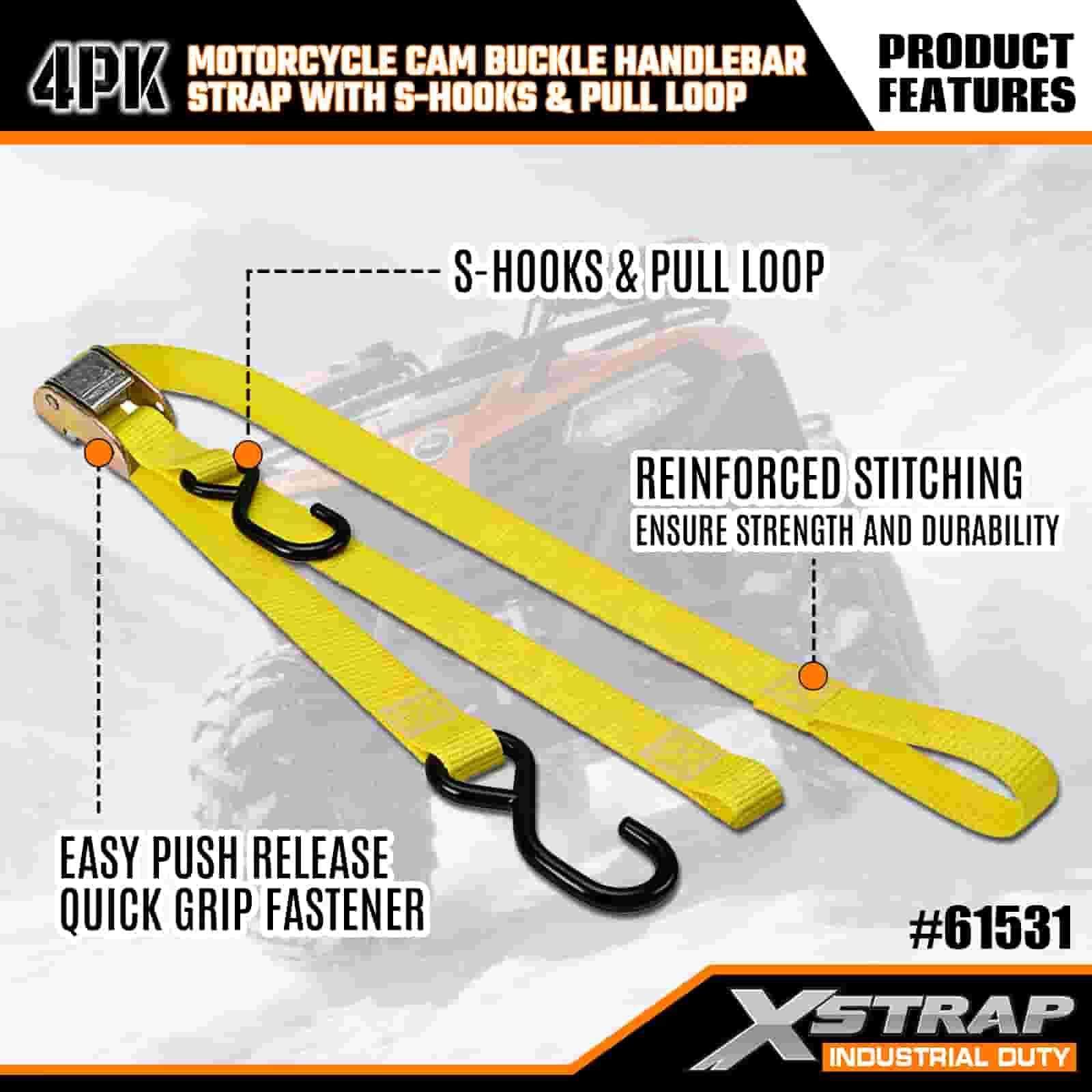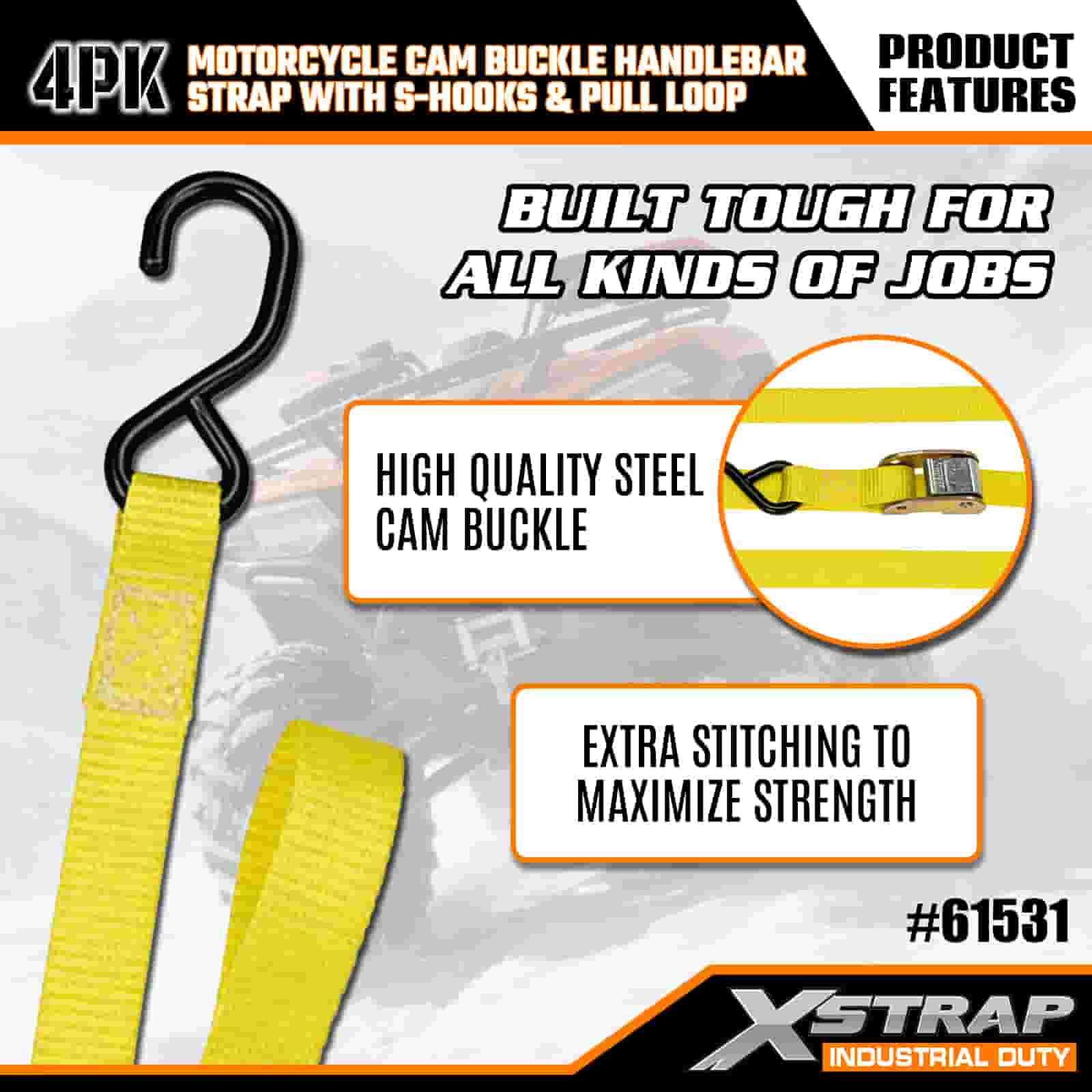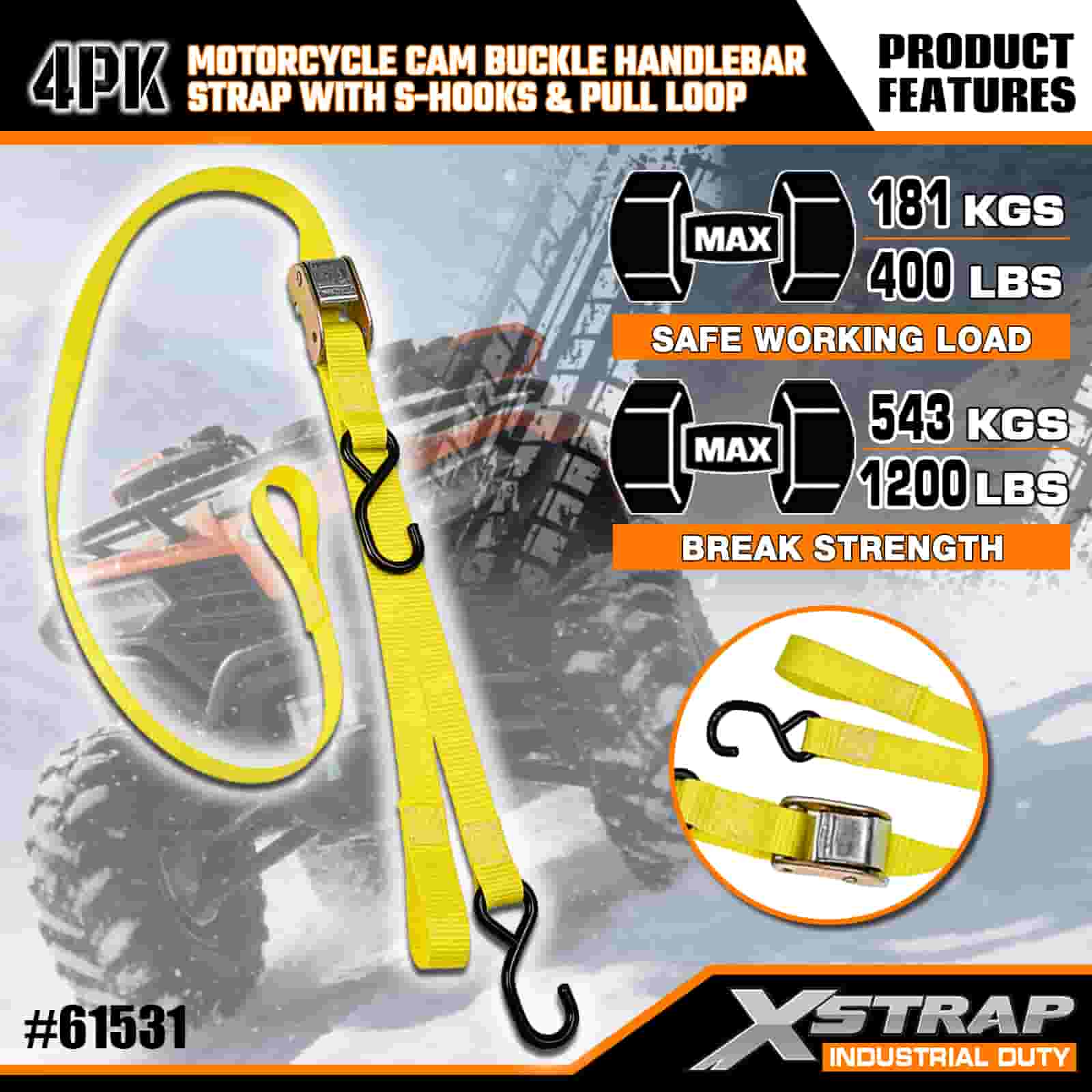 Tali Hendal Cam Motosikal Xstrap 4PK dengan Cangkuk S & Gelung Tarik, Tali Pengikat Poliester 1” x 6’ Ke Bawah Tali Gancu Cam Tarik, Tali Pengaman Kargo Berkapasiti 400lbs dengan Cangkuk S untuk Treler Kargo yang Serius untuk Melindungi Treler Kargo, Treler Katil Rata, Bot Ski, Kereta Kecil.