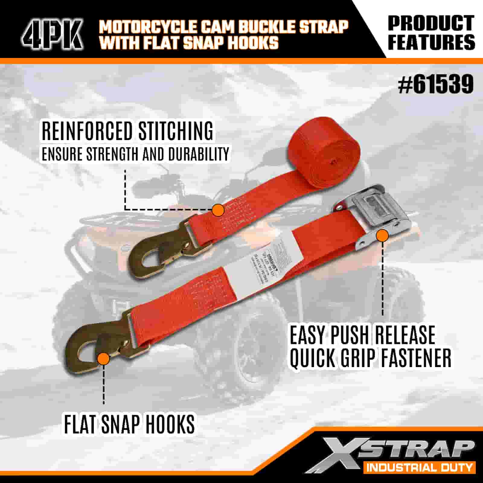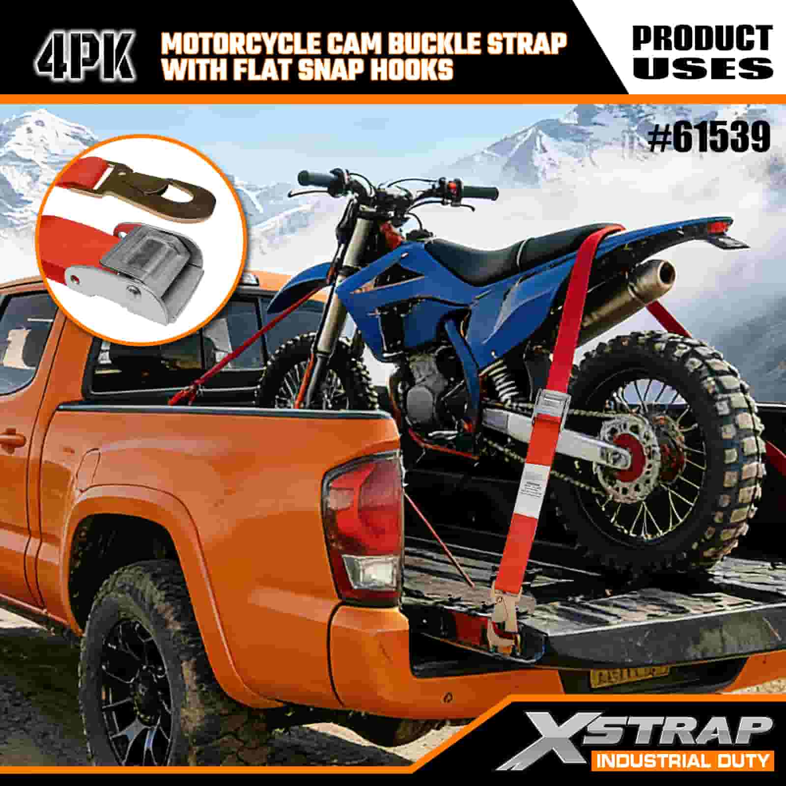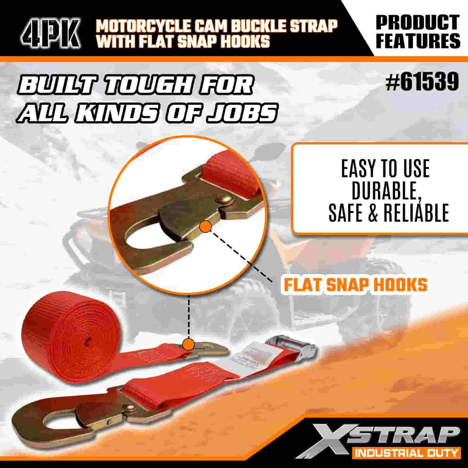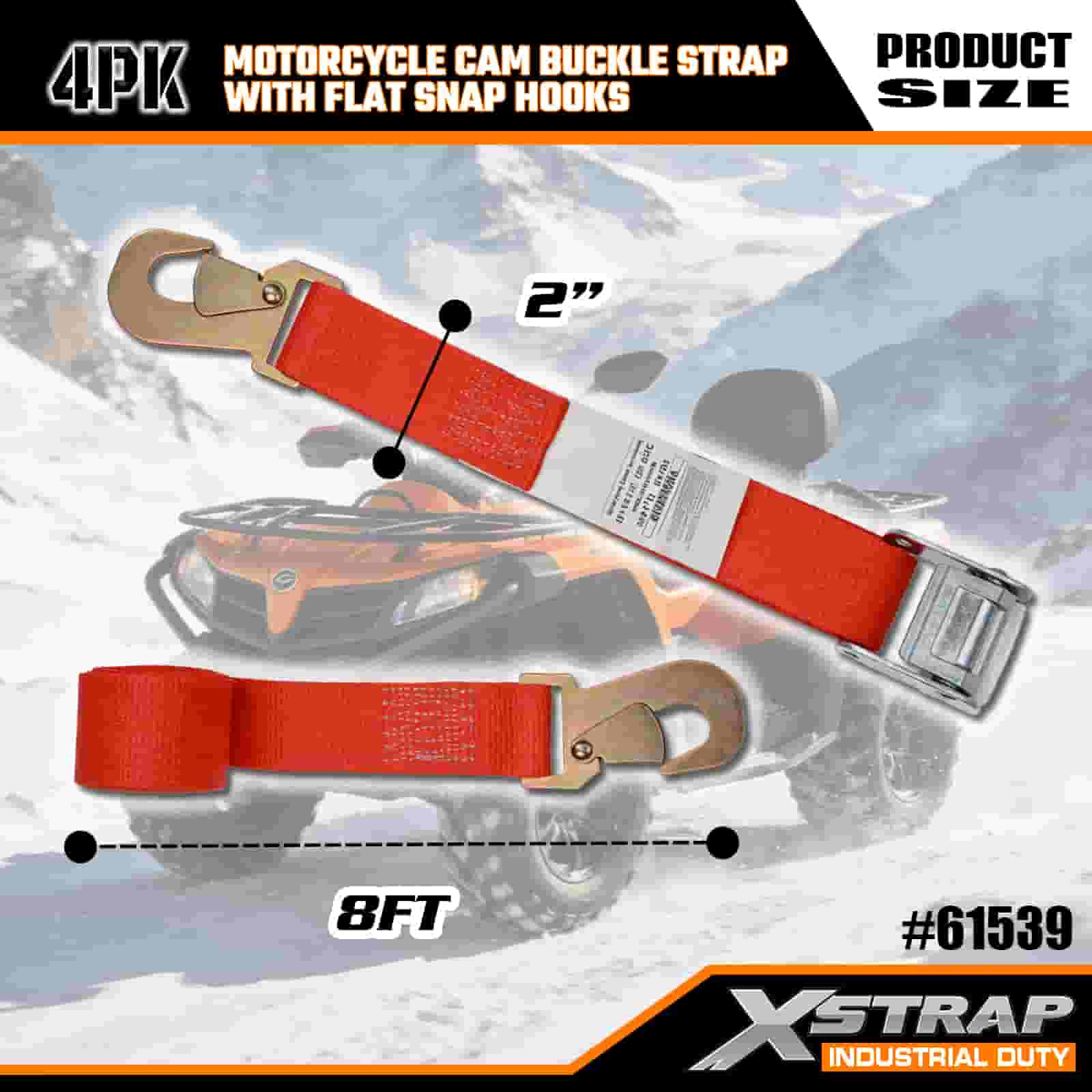 Tali Gancu Cam Motosikal Xstrap 4PK dengan Cangkuk Snap Rata, Tali Pengikat Poliester 2” x 8’ Tali Bawah Tarik Ratchet Tali Gancu, Tali Pengaman Kargo Kapasiti 400lbs dengan Cangkuk Snap Rata untuk Treler Kargo Keselamatan Profesional yang Serius, Treler Katil Rata, Bot Ski, Kereta Kecil.