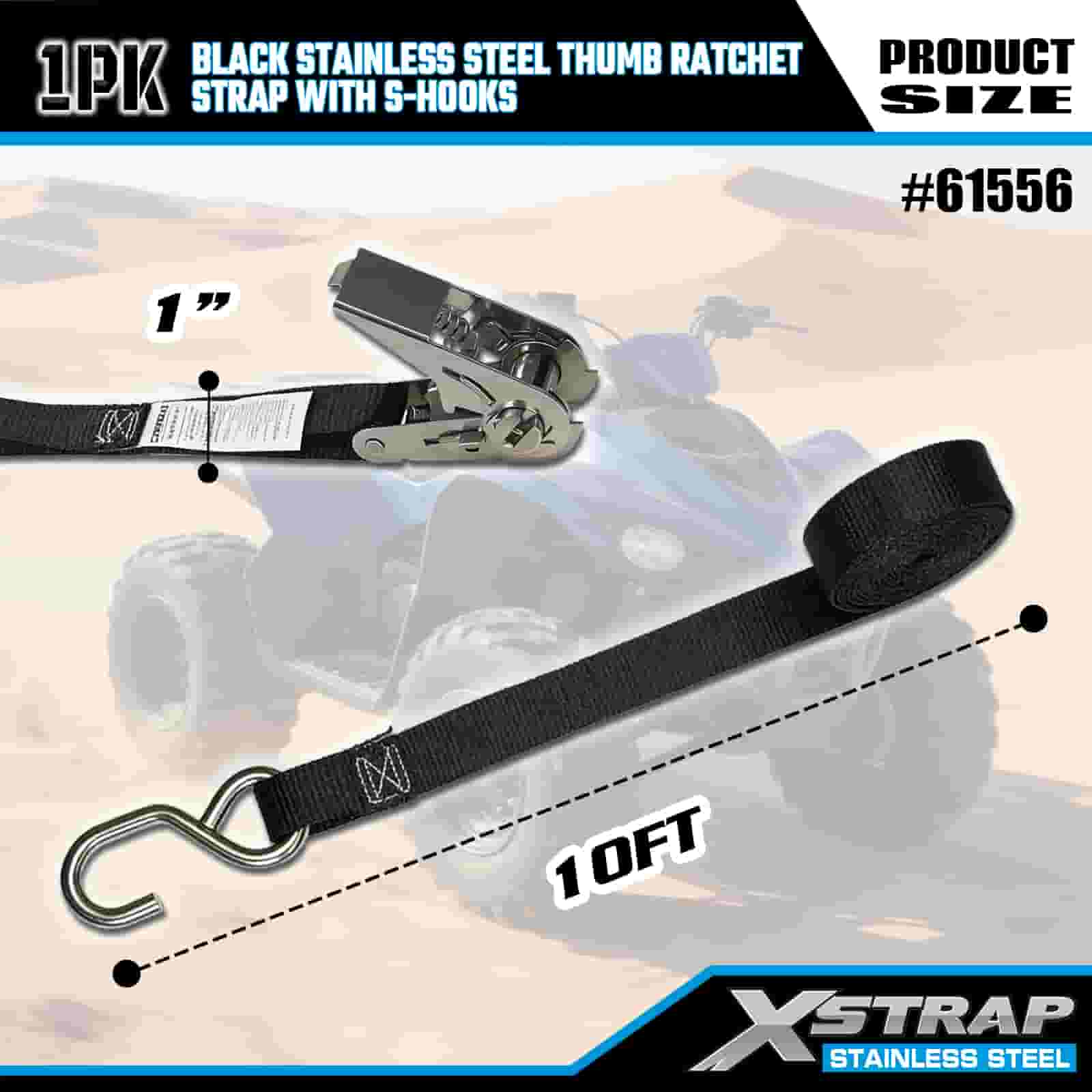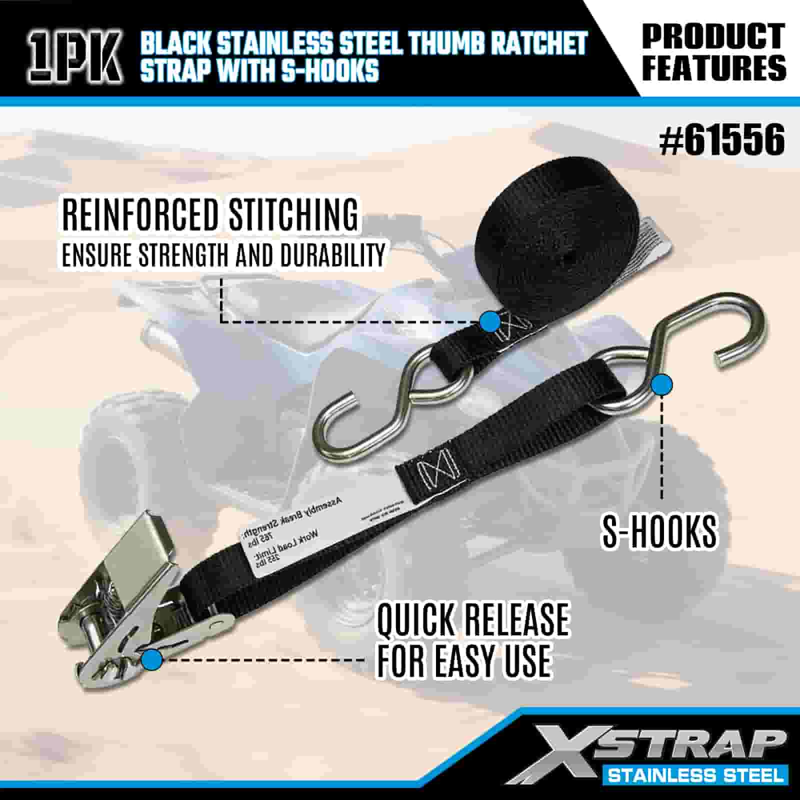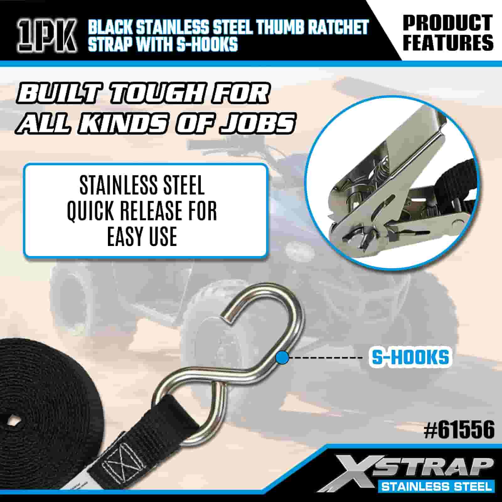 Xstrap Karat Ibu Jari Keluli Tahan Karat Hitam dengan Cangkuk S, 1” x 10’ Tali Pengikat Poliester ke Bawah Tali Ratchet, Tali Pengaman Kargo Kapasiti 255lbs dengan Cangkuk S untuk Trailer, Bot Ski Treler Katil Rata, Kereta Kecil, Peralatan Berat.