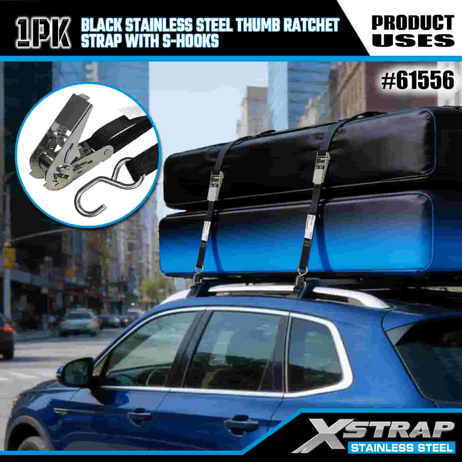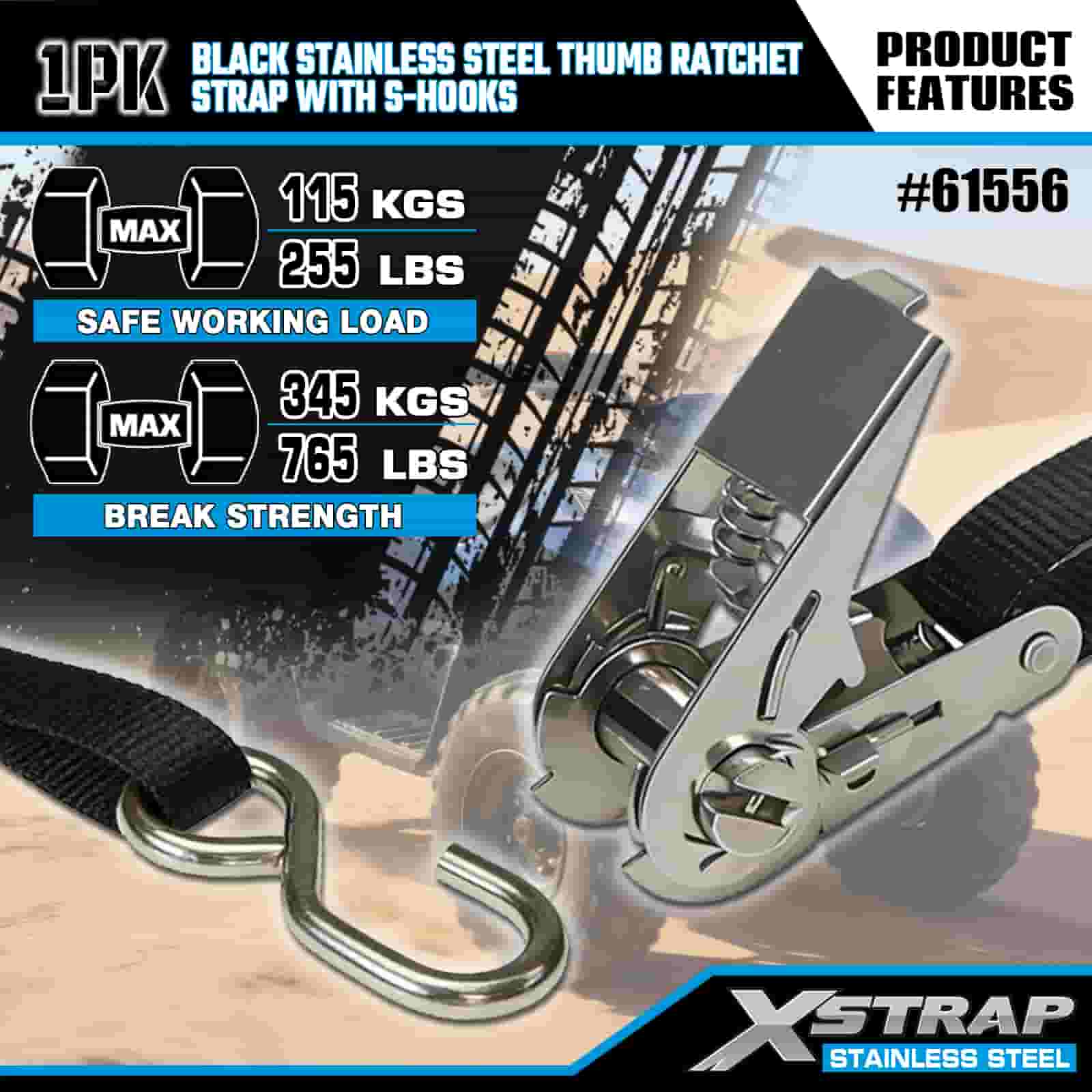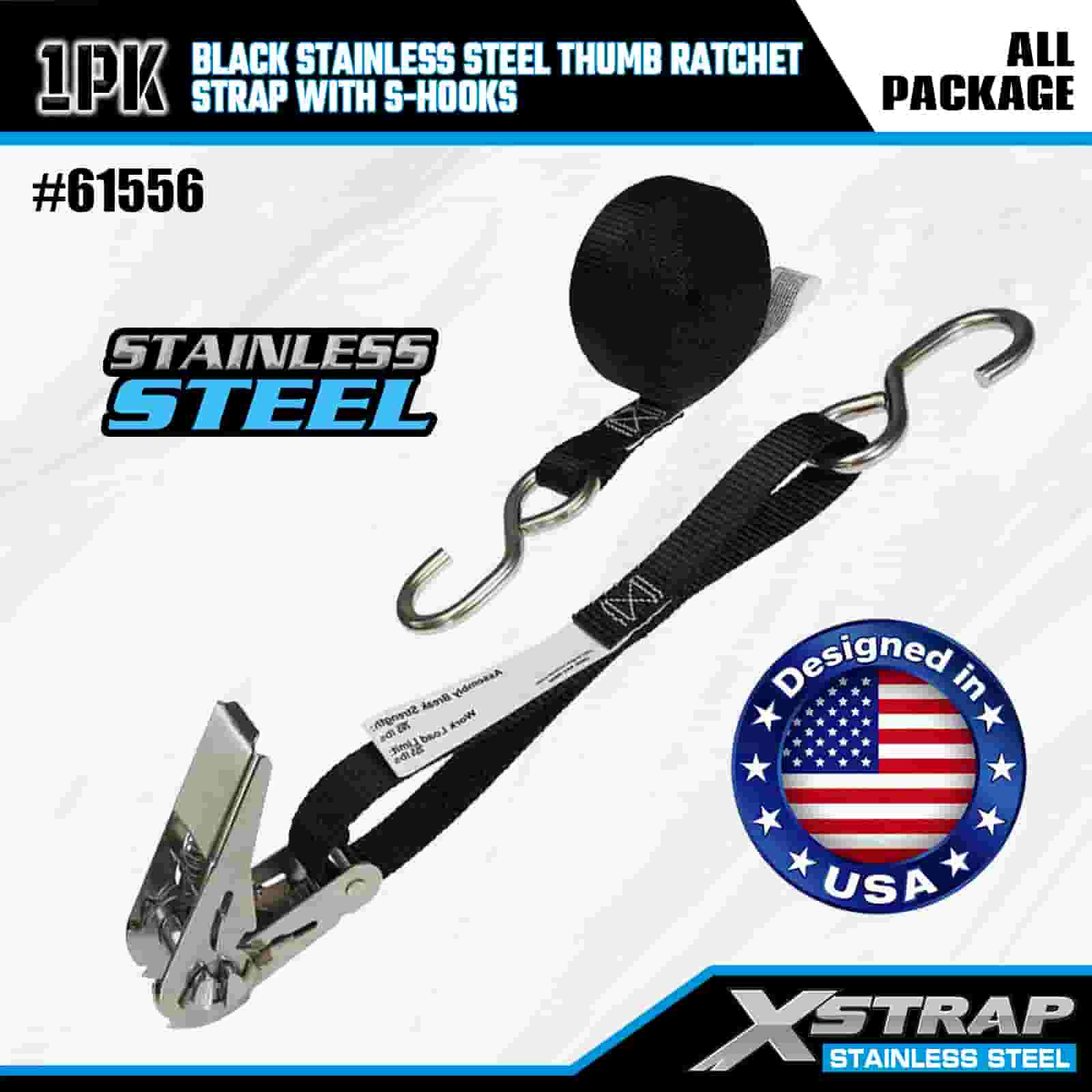 Xstrap Karat Ibu Jari Keluli Tahan Karat Hitam dengan Cangkuk S, 1” x 10’ Tali Pengikat Poliester ke Bawah Tali Ratchet, Tali Pengaman Kargo Kapasiti 255lbs dengan Cangkuk S untuk Trailer, Bot Ski Treler Katil Rata, Kereta Kecil, Peralatan Berat.