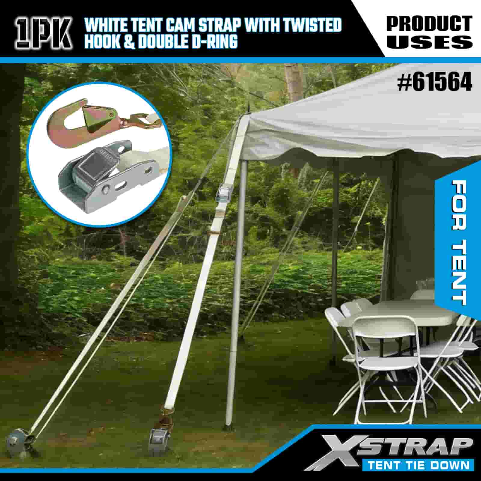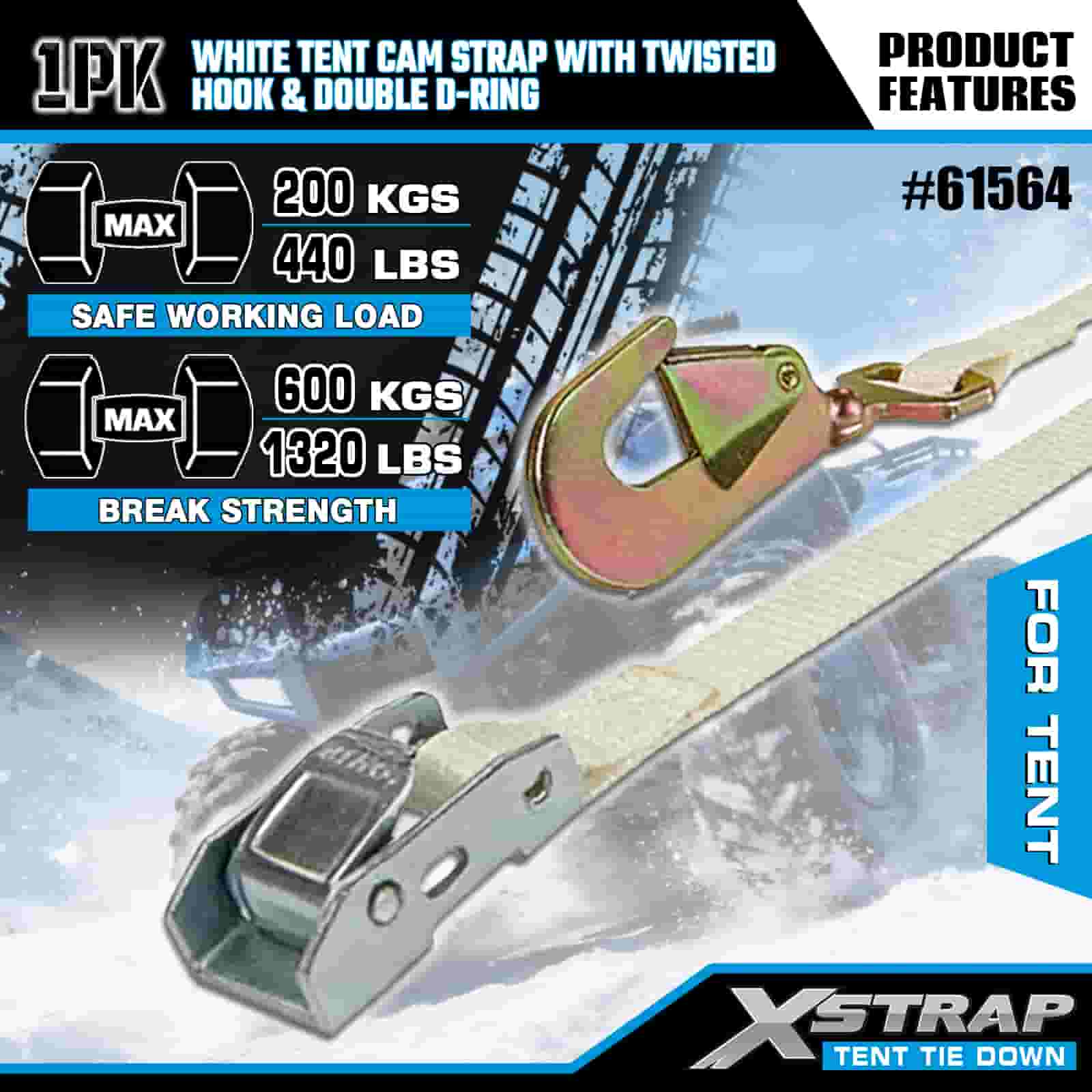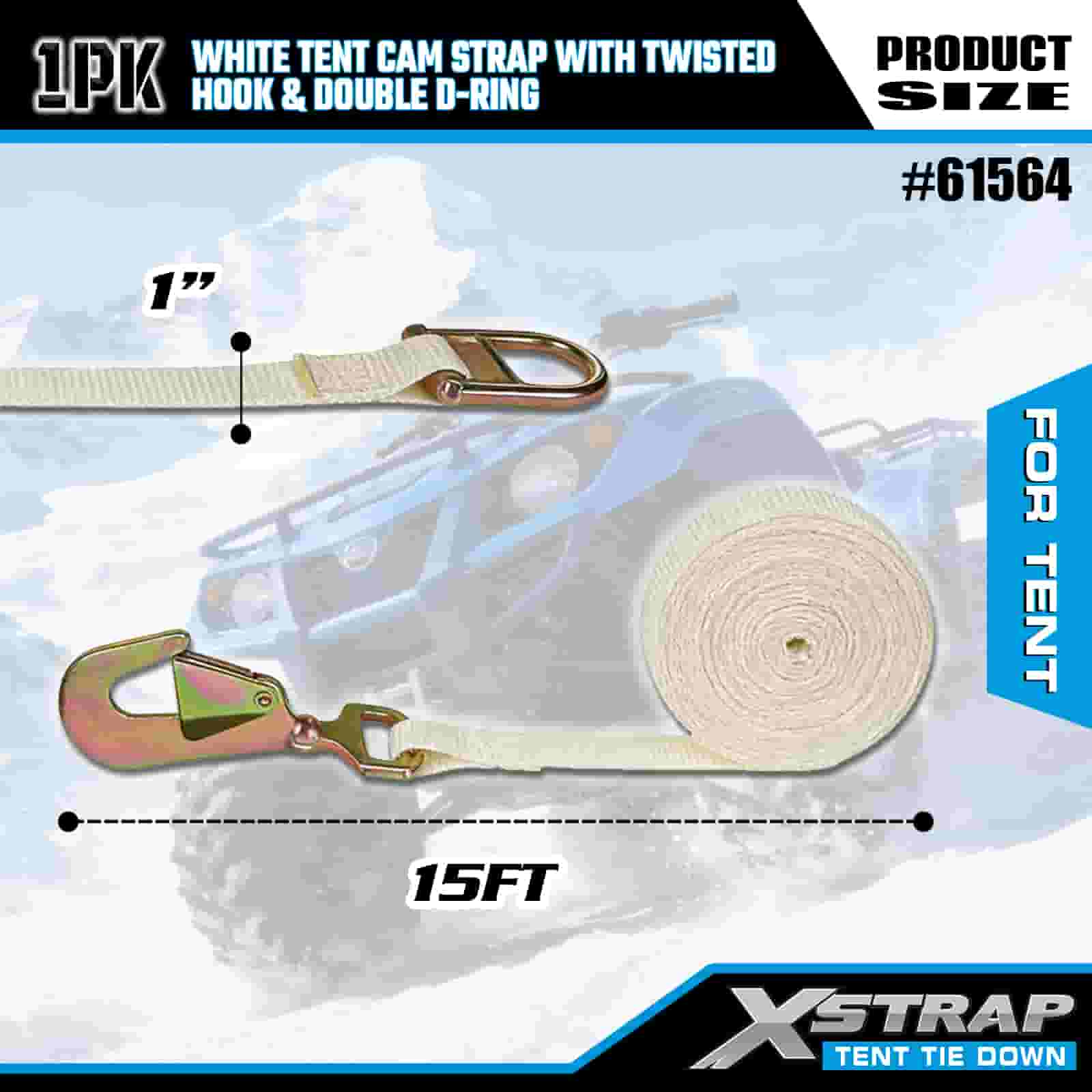 Tali Cam Khemah Putih Xstrap dengan Cangkuk Berpintal dan Cincin D Berganda, Tali Pengikat Poliester 1" x 15' Tali Ratchet, Tali Pengaman Kargo Kapasiti 440lbs dengan Cangkuk Dipintal dan Cincin D Berganda untuk Kawalan Kargo, pemasangan Khemah.