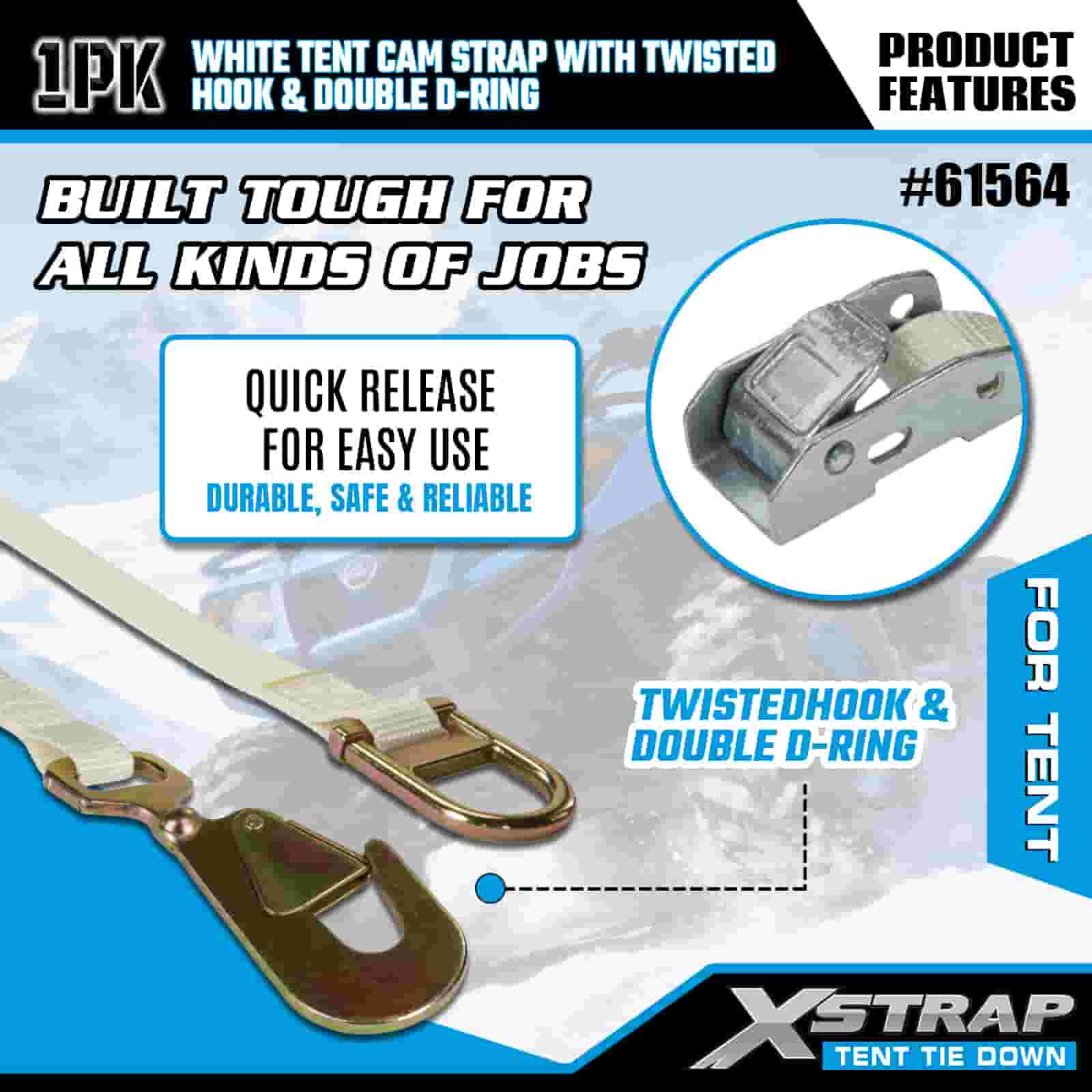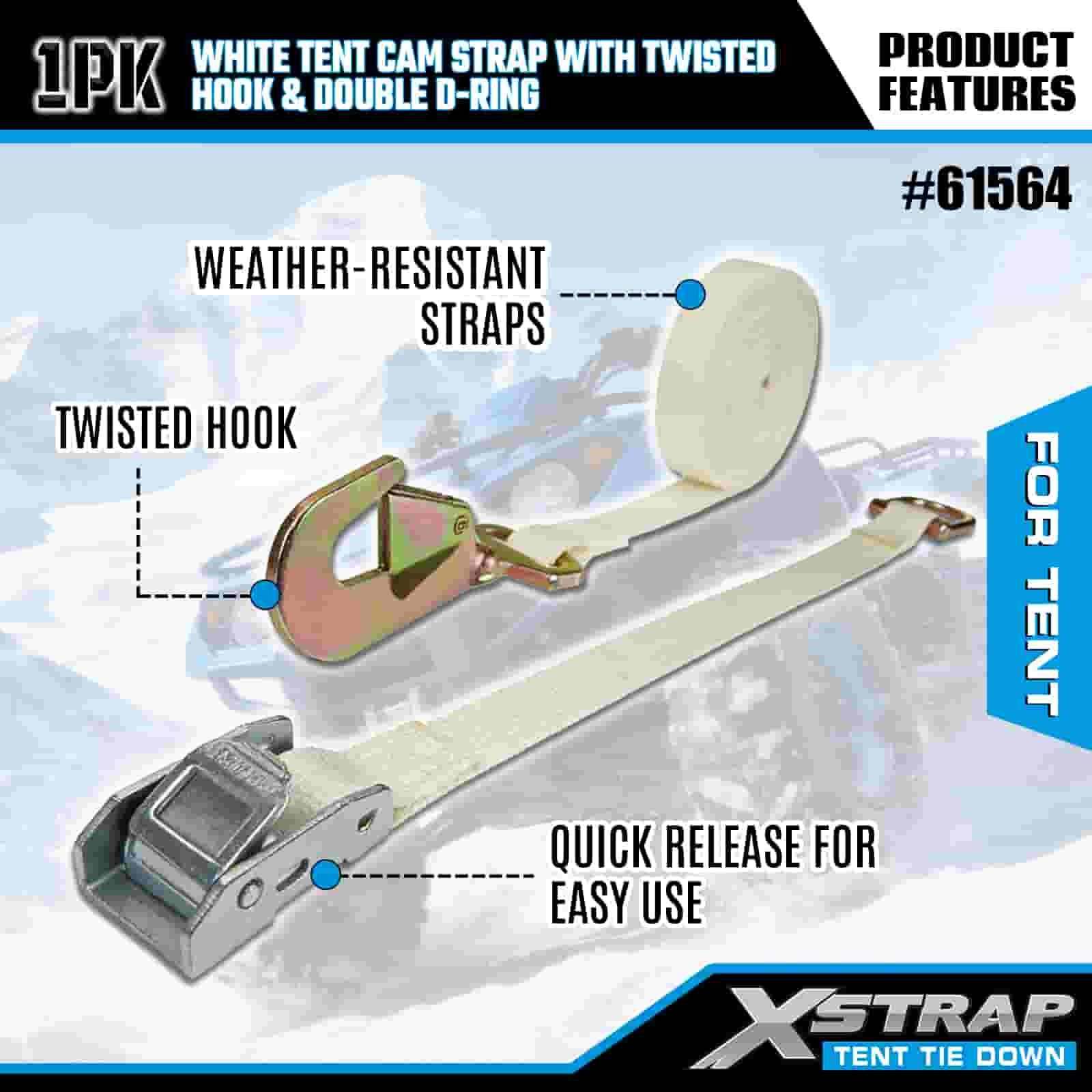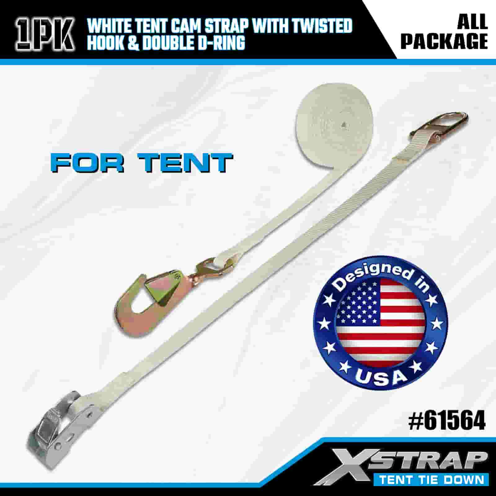Tali Cam Khemah Putih Xstrap dengan Cangkuk Berpintal dan Cincin D Berganda, Tali Pengikat Poliester 1" x 15' Tali Ratchet, Tali Pengaman Kargo Kapasiti 440lbs dengan Cangkuk Dipintal dan Cincin D Berganda untuk Kawalan Kargo, pemasangan Khemah.