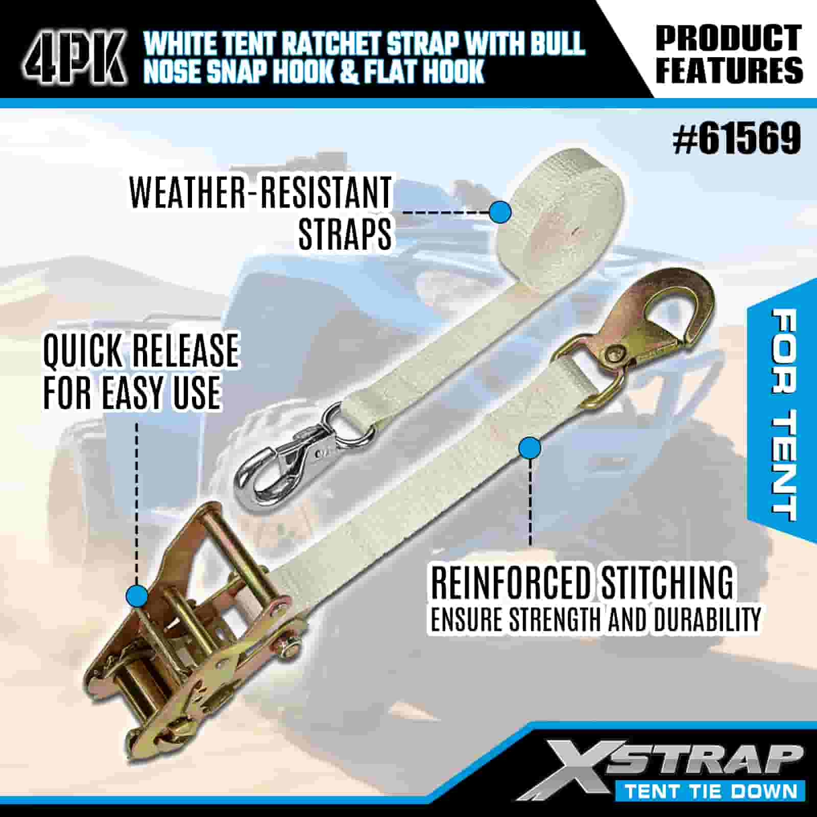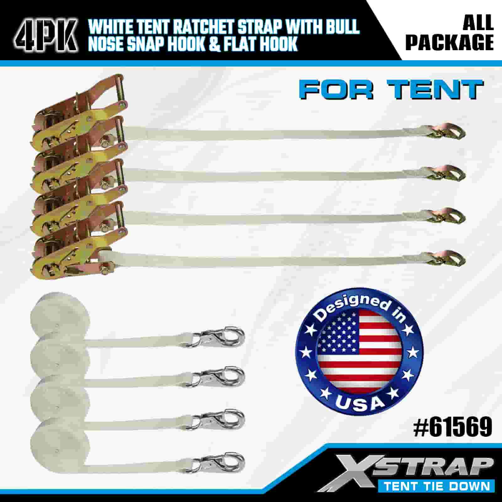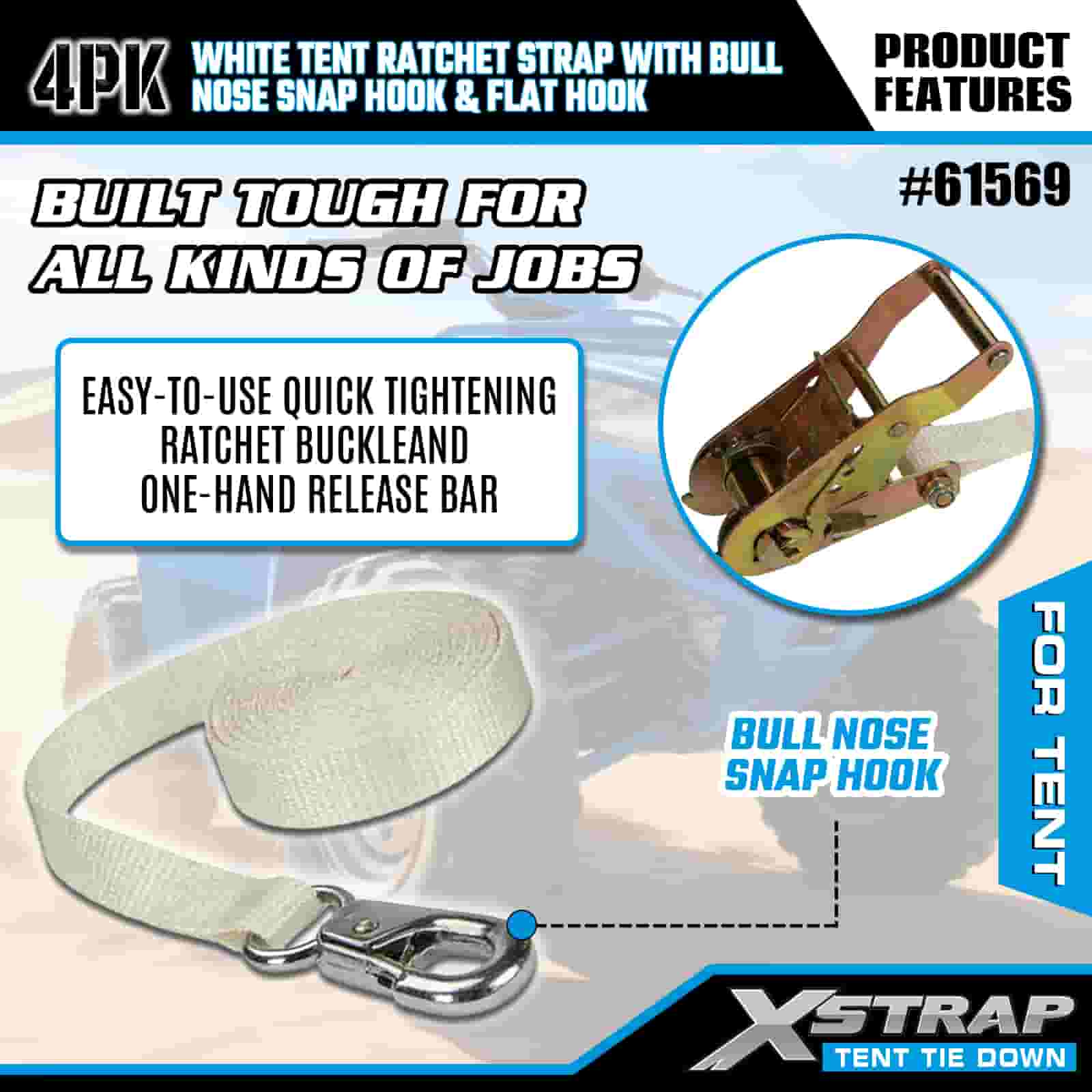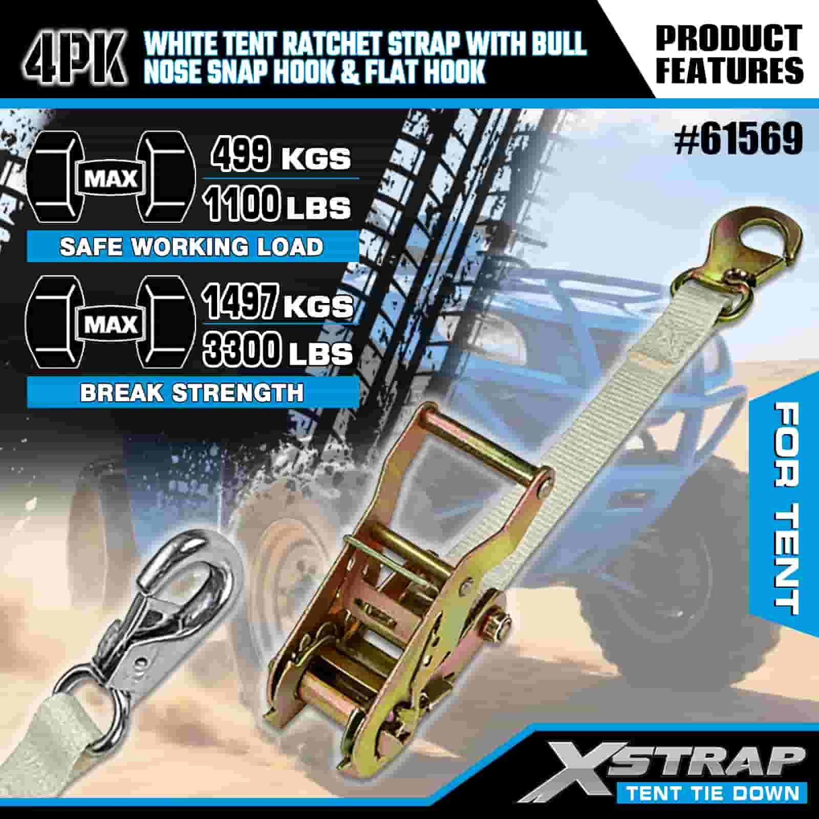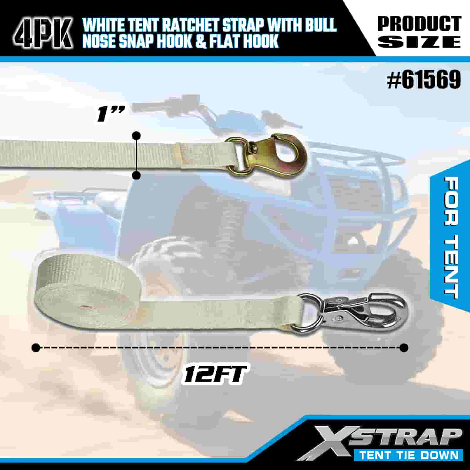 Tali Ratchet Khemah Putih Xstrap 4PK dengan Cangkuk Snap Hidung Lembu dan Cangkuk Rata, Tali Pengikat Poliester Ke Bawah Tali Ratchet 1” x 12’, Tali Pengaman Kargo Kapasiti 1100lbs dengan Cangkuk Snap Hidung dan Cangkuk Rata untuk Kawalan Kargo, Penetapan Khemah.