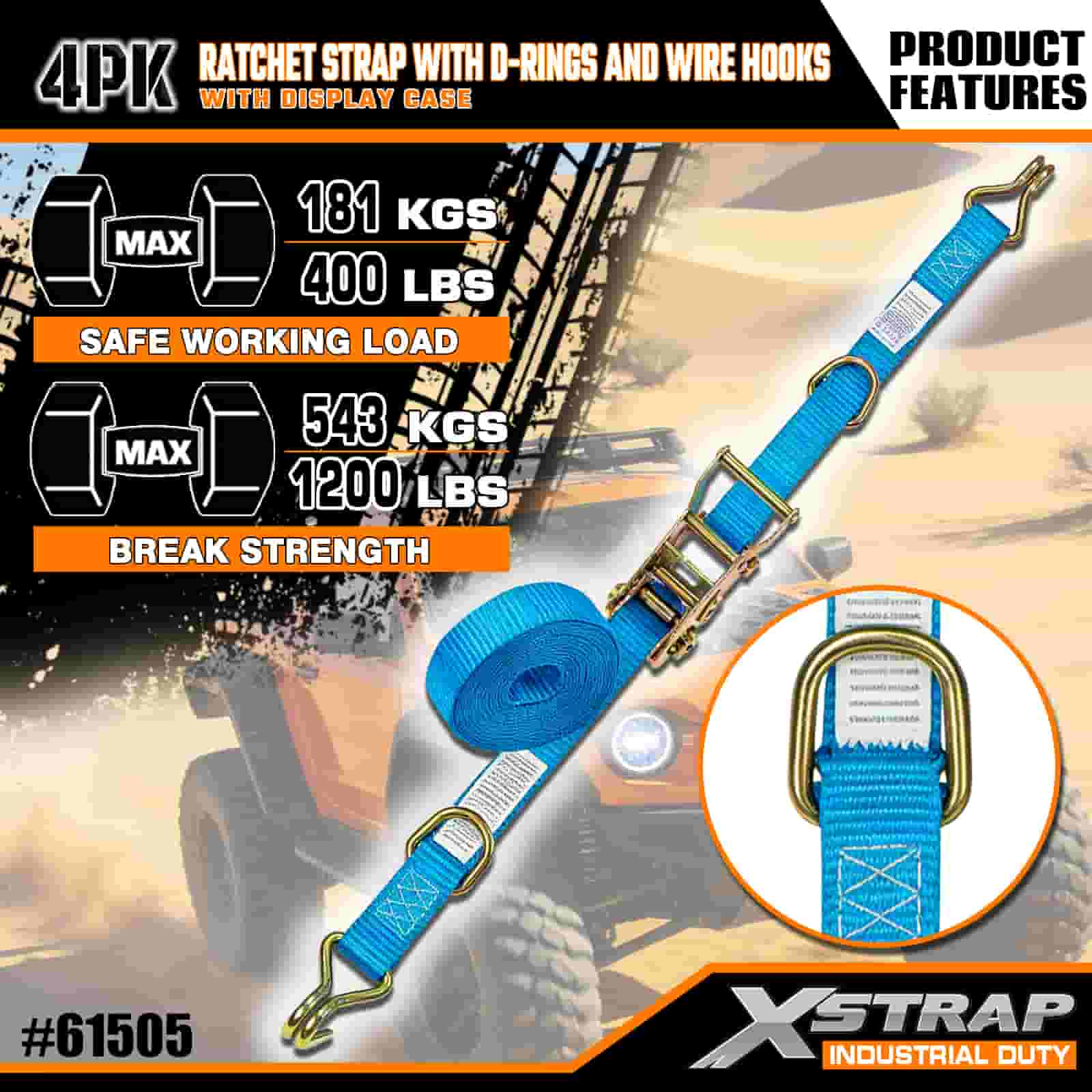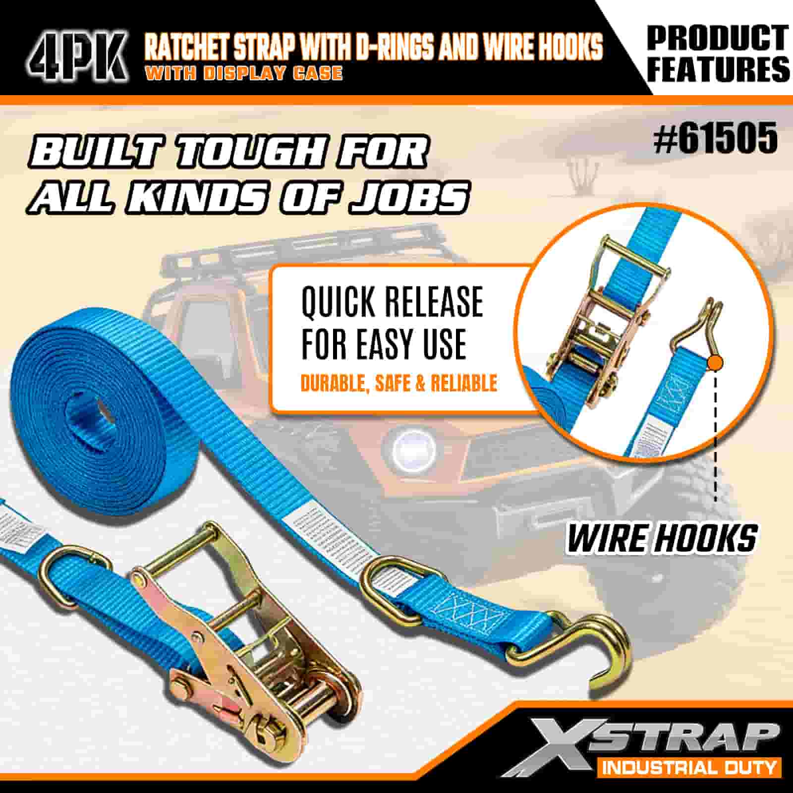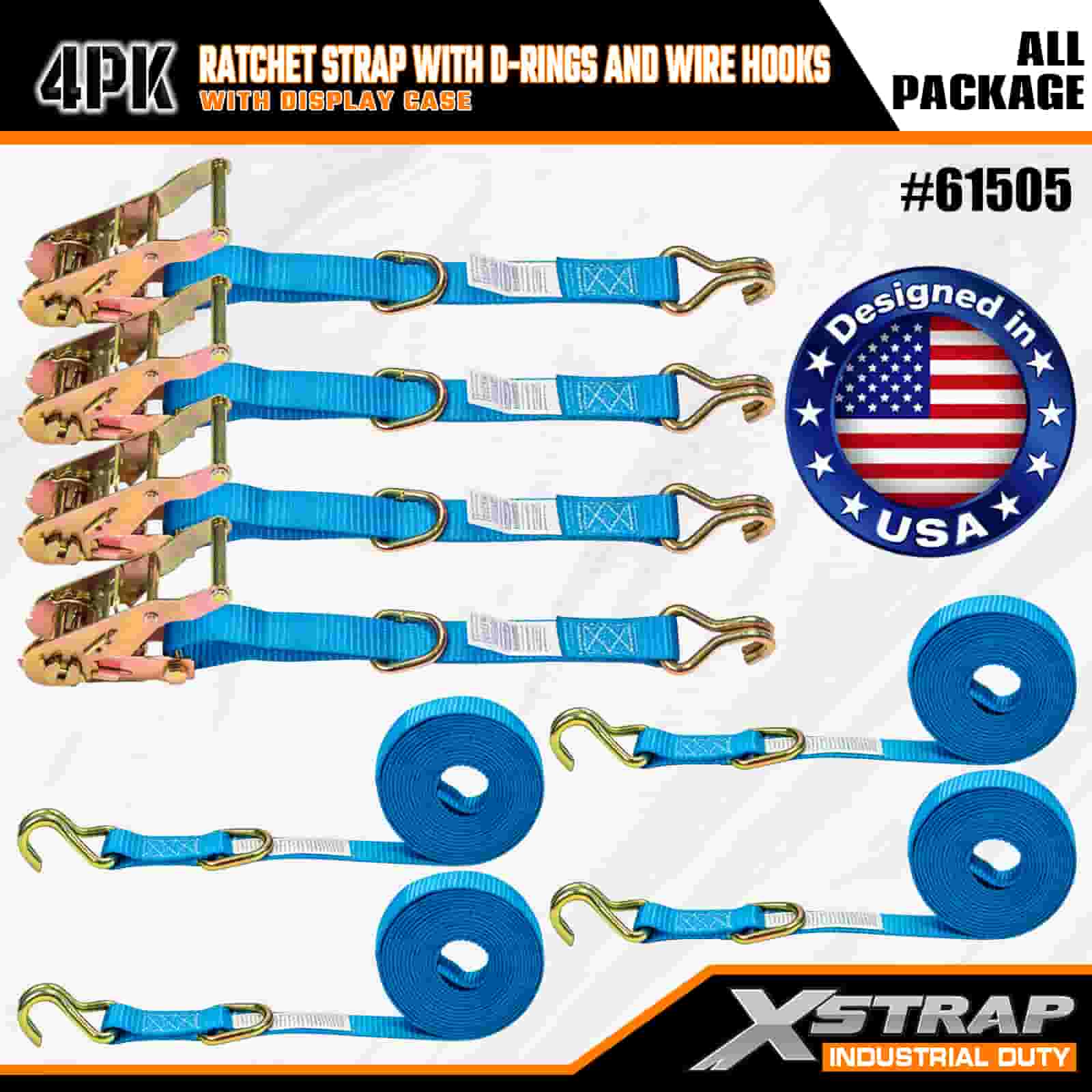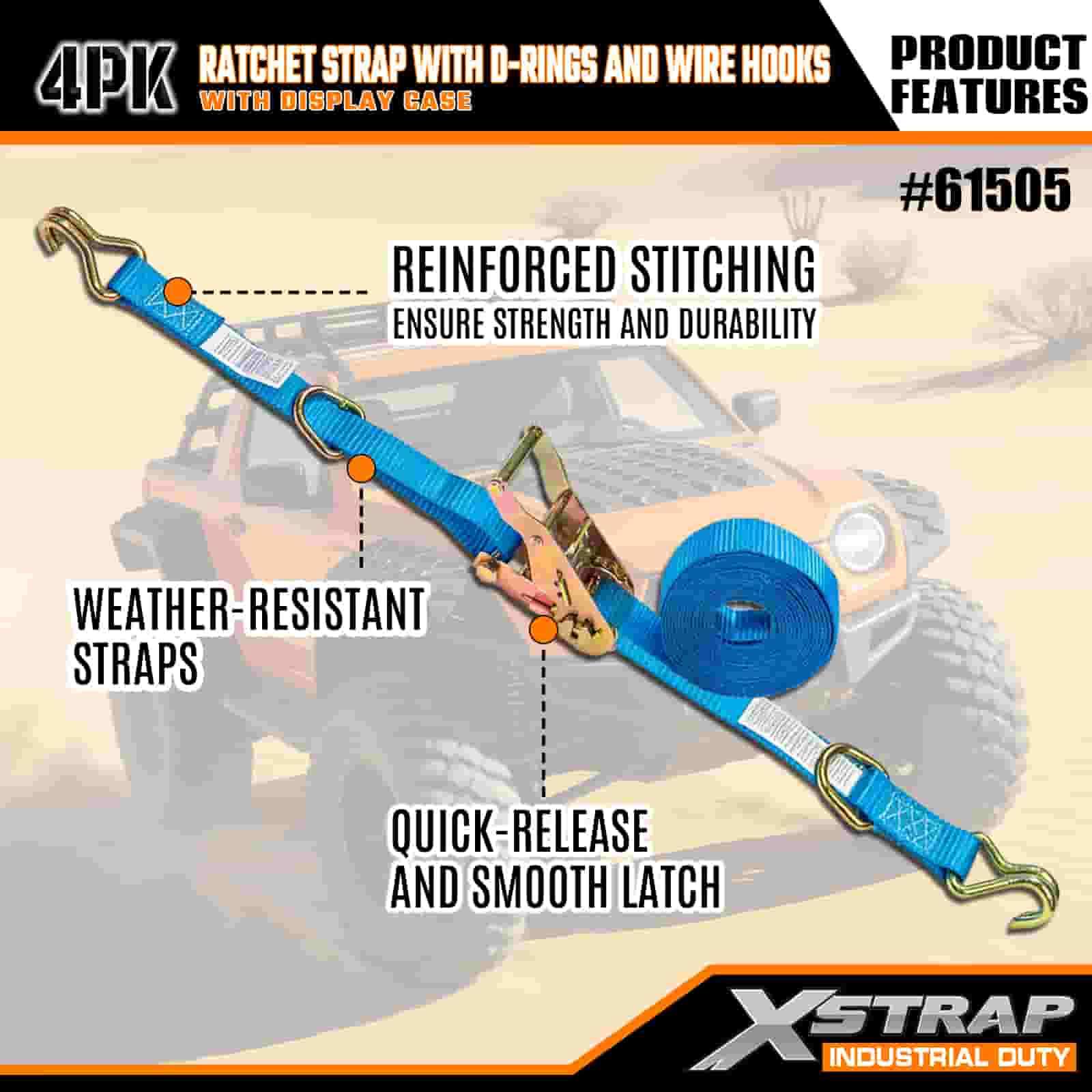Xstrap 4 Pack Cam Buckle Tie Down dengan D-Cincin dan Cangkuk Wayar, 1” x 15’ Poliester Tie Down Strap Tarik Ratchet Strap, 400lbs Kapasiti Ikatan Kargo Tali Pengaman dengan Cangkuk Wayar untuk Profesional Yang Serius untuk Melindungi Treler Kargo, Treler Katil Rata, Bot Ski, Kereta Kecil.