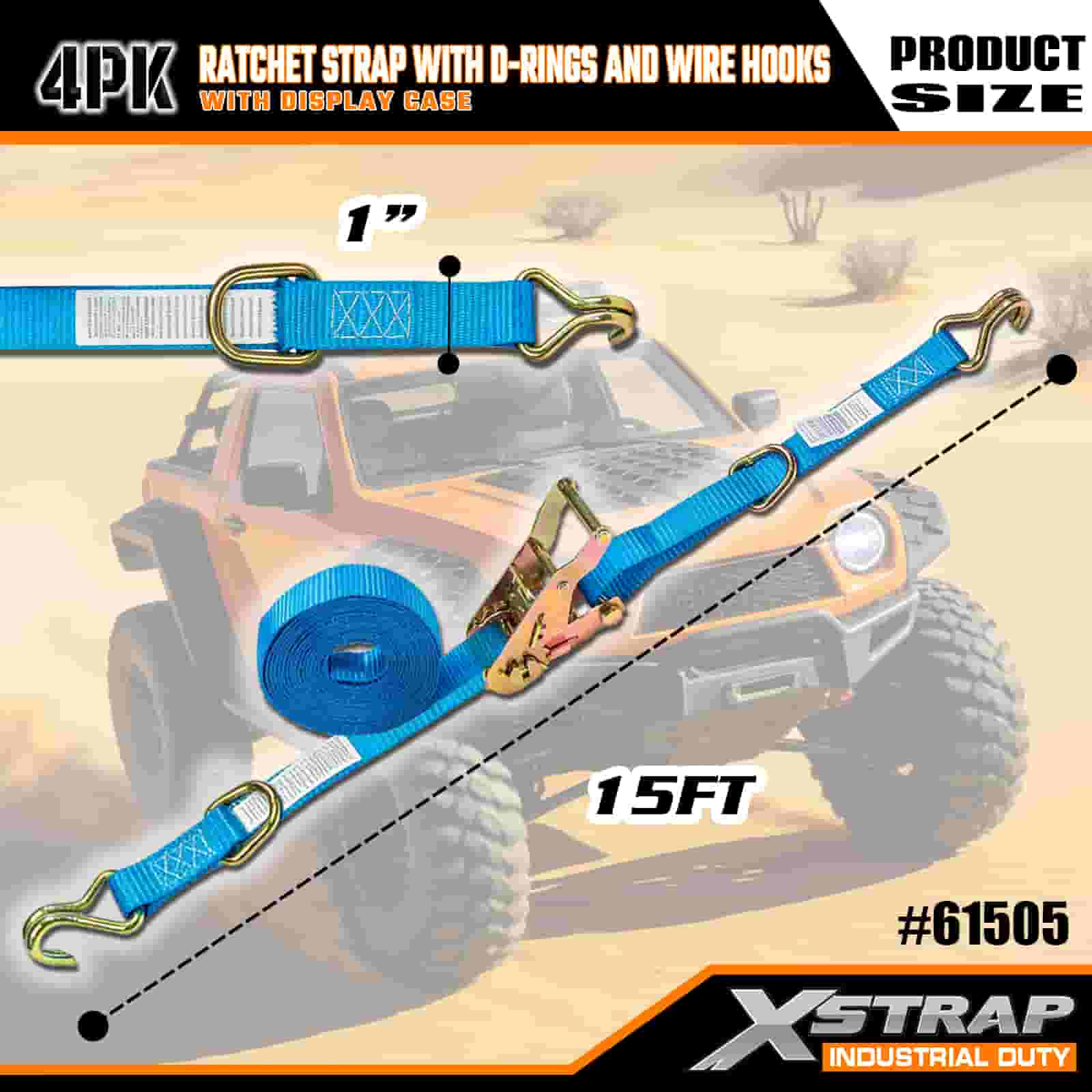 Tali Ratchet 1” x 15’ 4PK dengan Cincin D dan Cangkuk Wayar