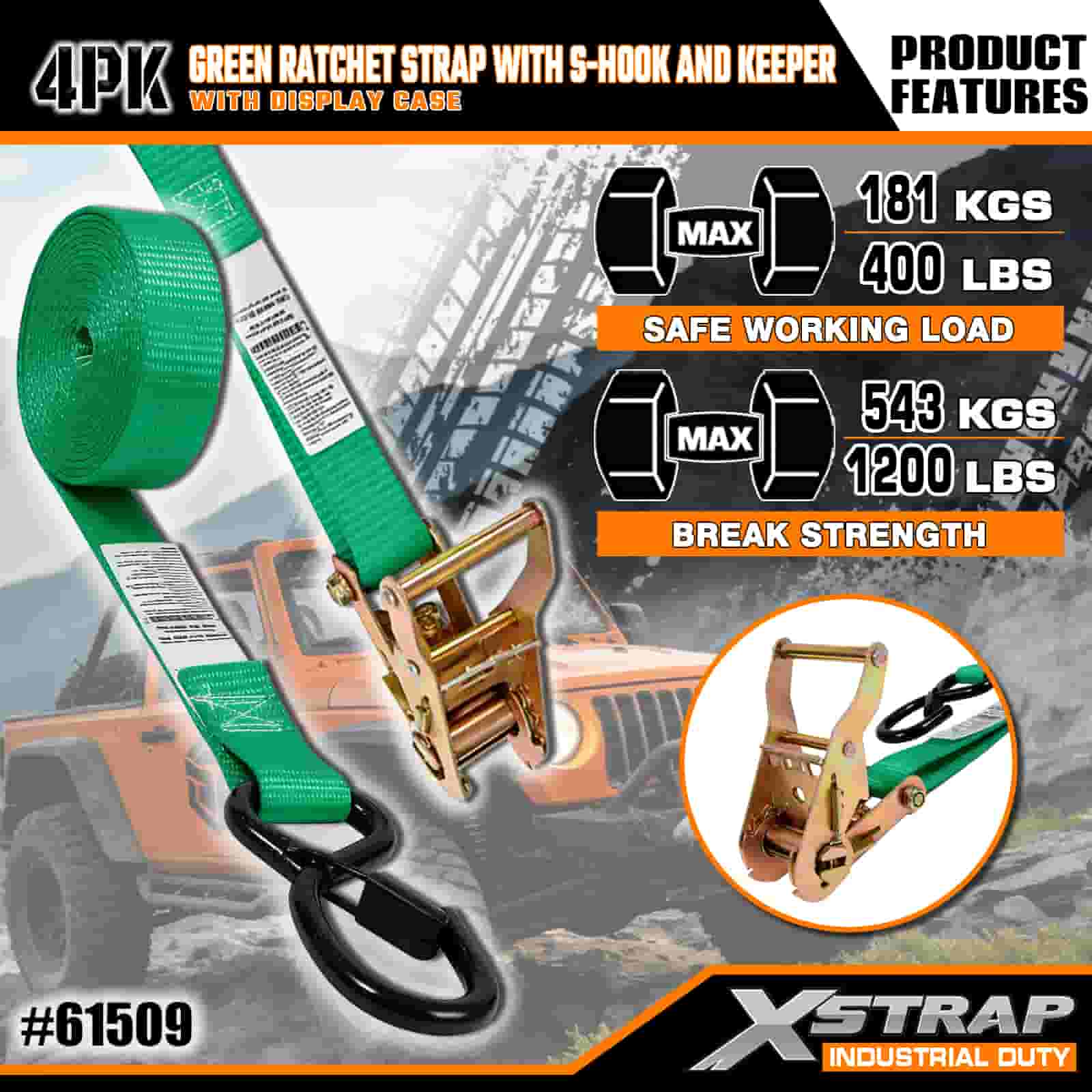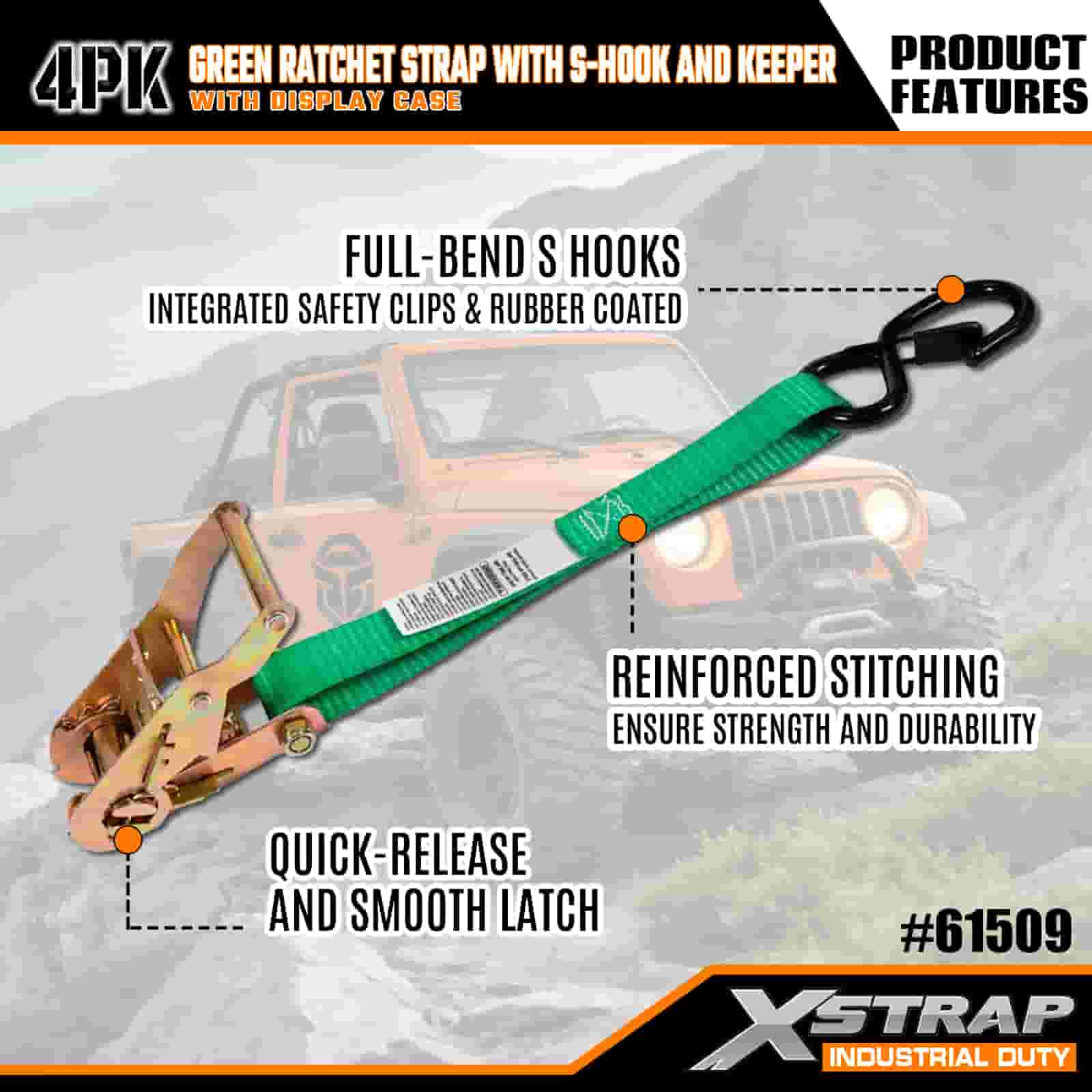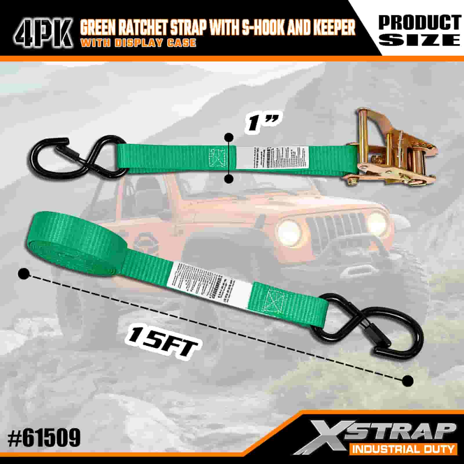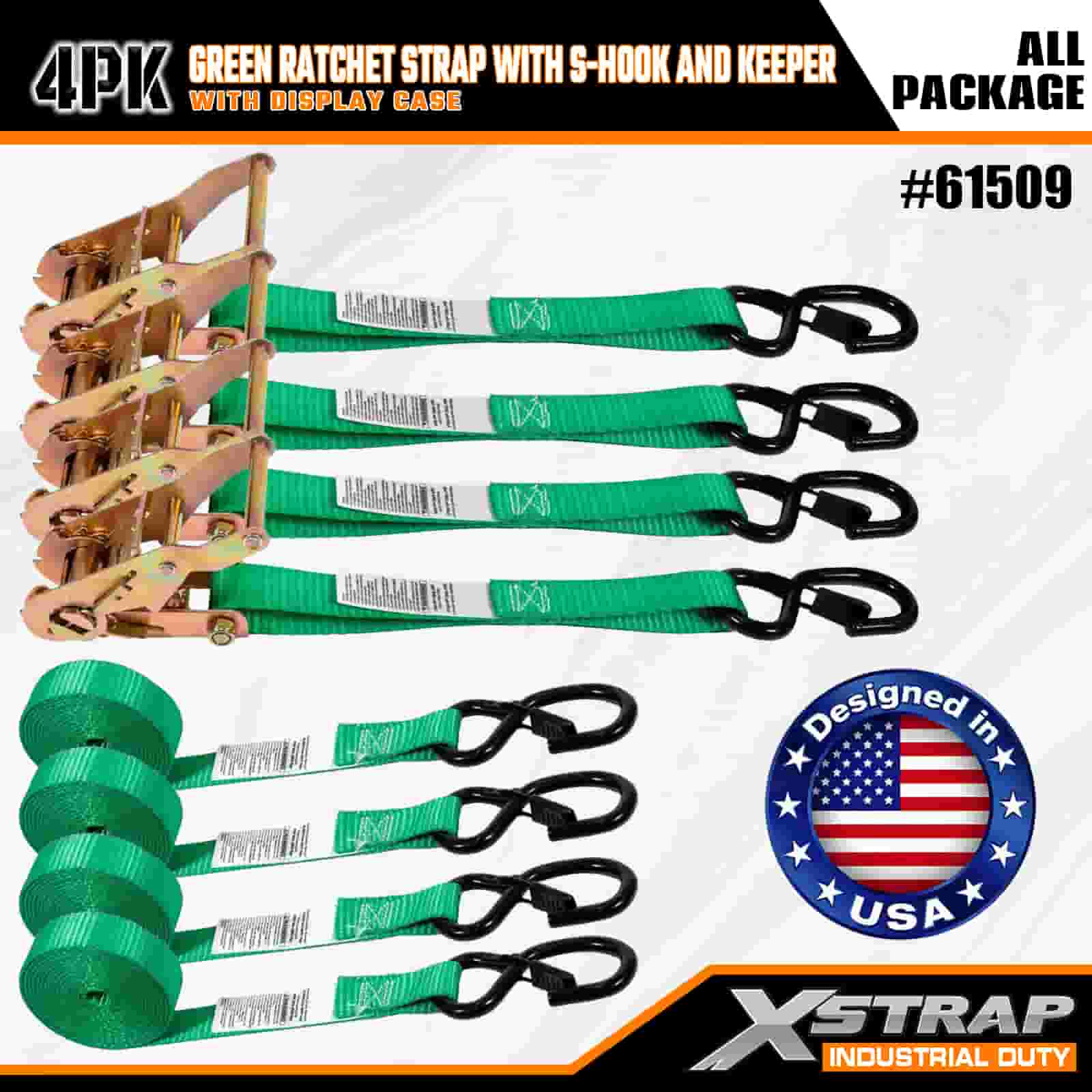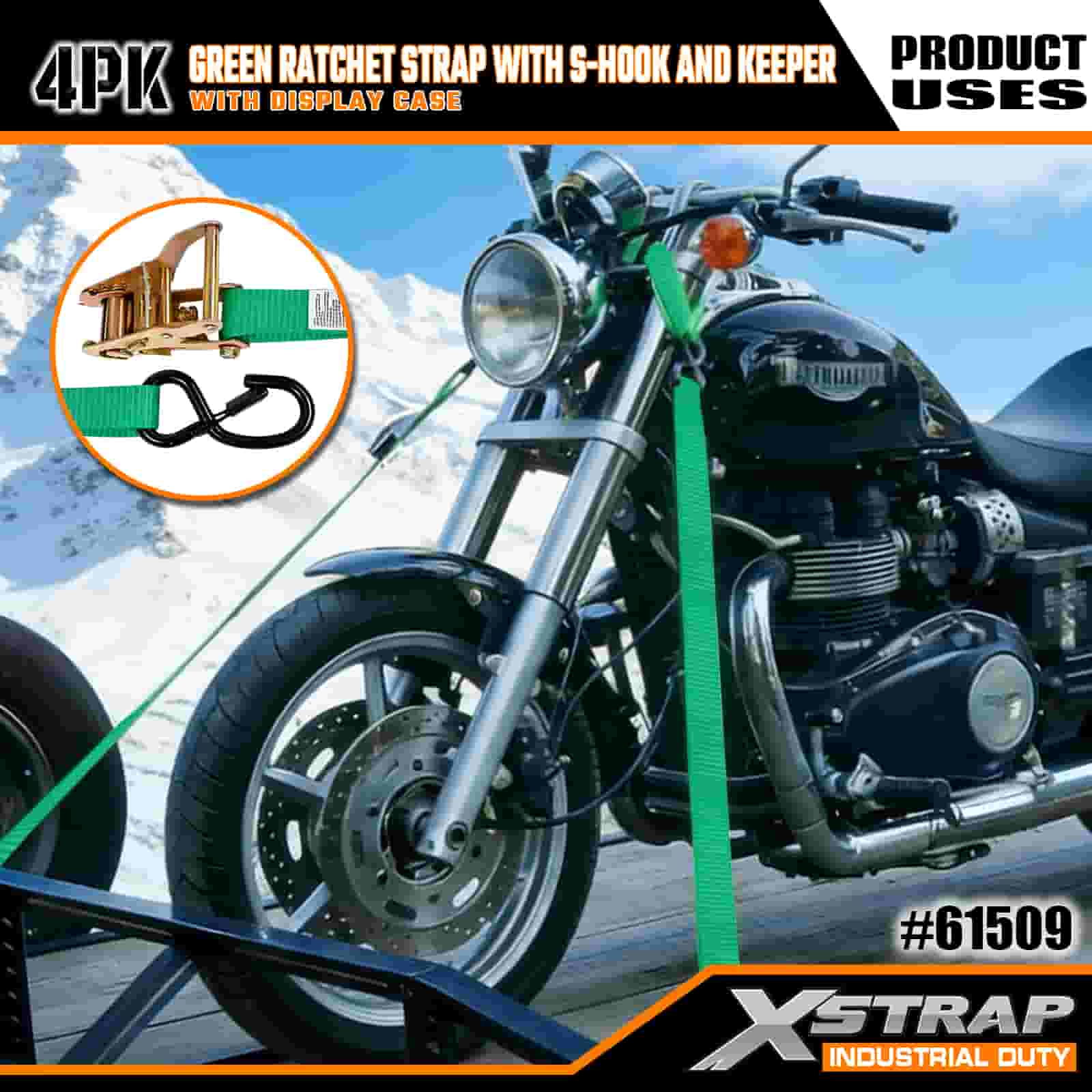 - 4-Pek dengan Storan Tersusun: Dijual sebagai set 4 tali (dalam pembungkusan paparan) dengan kili simpanan terbina dalam untuk penyimpanan kemas. Berukuran 1 inci lebar × 15 kaki panjang, ia sesuai untuk melindungi motosikal, peralatan luar dan kargo am.