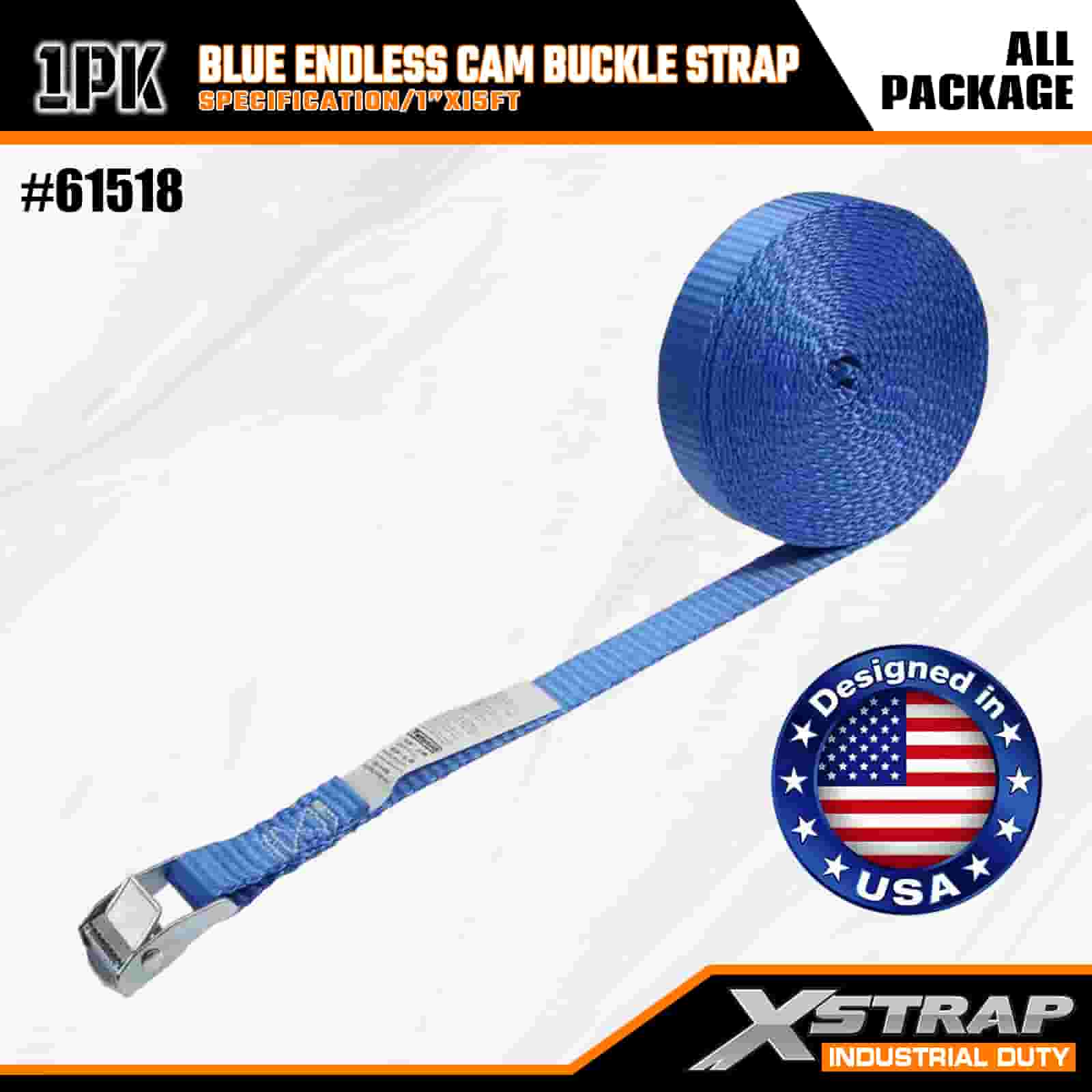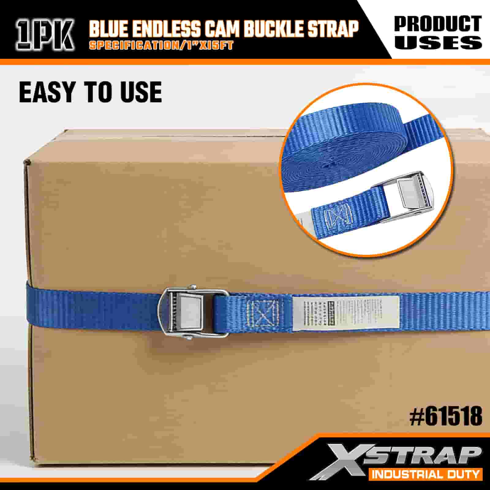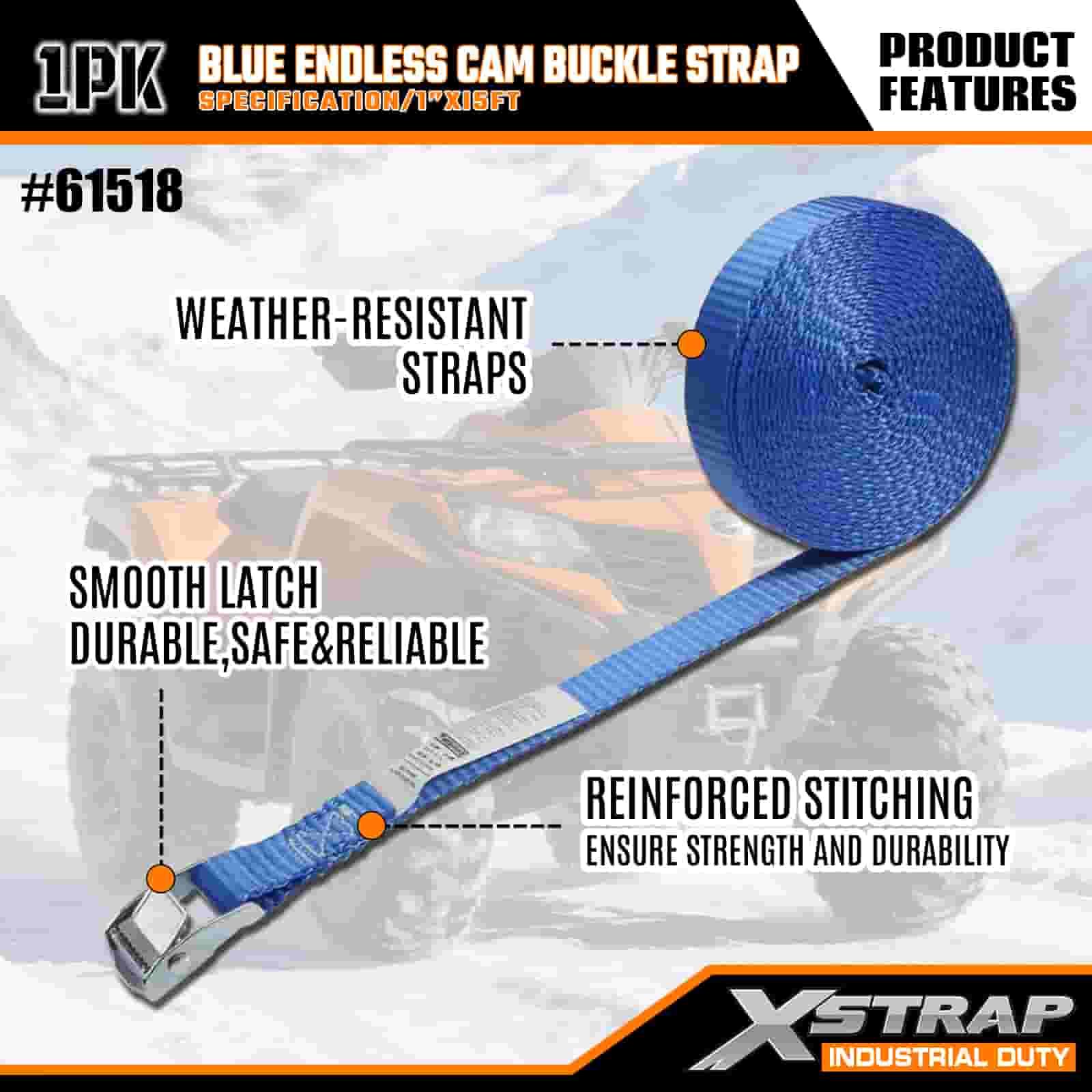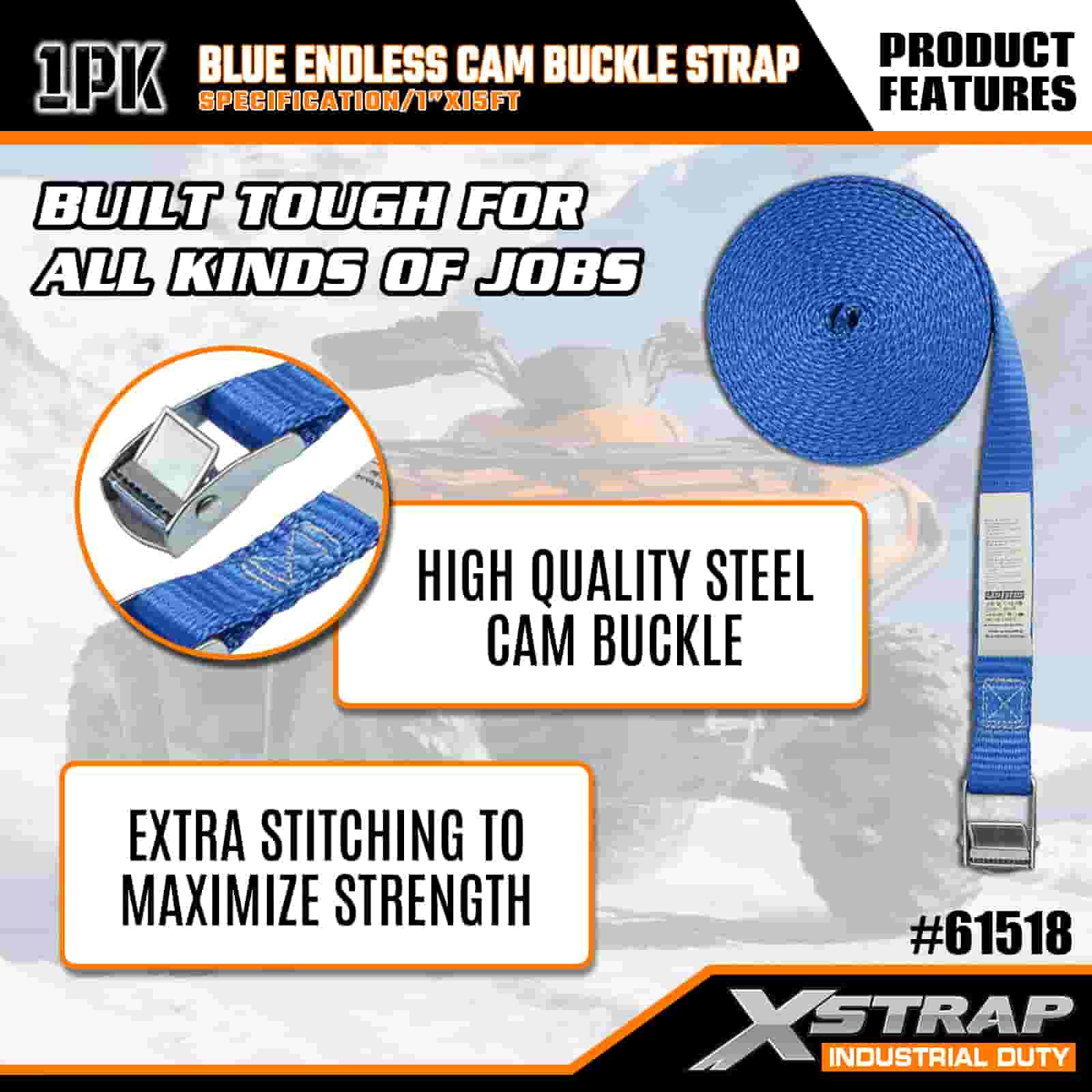 Xstrap Biru Endless Cam Buckle Strap, 1” x 15’ Poliester Tie Down Strap Tarik Ratchet Strap, 166lbs Kapasiti Ikatan Kargo Tali Pengaman untuk Profesional Yang Serius untuk Melindungi Treler Kargo, Treler Katil Rata, Bot Ski, Kereta Kecil.