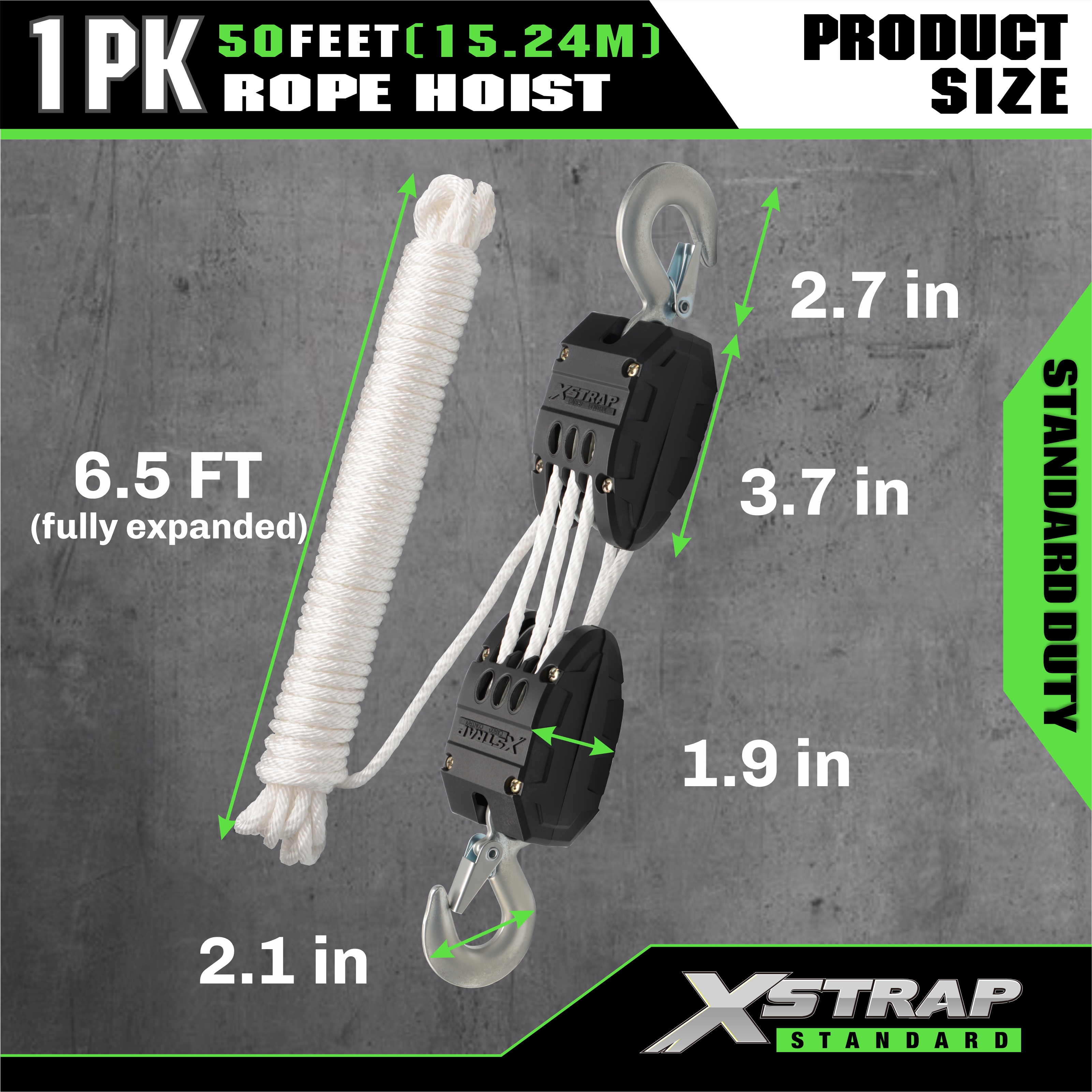 Ini ialah Sistem Pulley Hoist Rope Standard Xstrap. Kapasiti ialah 1000 paun, kekuatan pecah ialah 2000 paun. 5:1 Kuasa Mengangkat Blok Takal Tugas Berat 50 kaki untuk Memburu, Mengangkat Objek Berat dengan Sarung Tangan Kerja Anti-Slip, 2 keping Gelung Lembut.