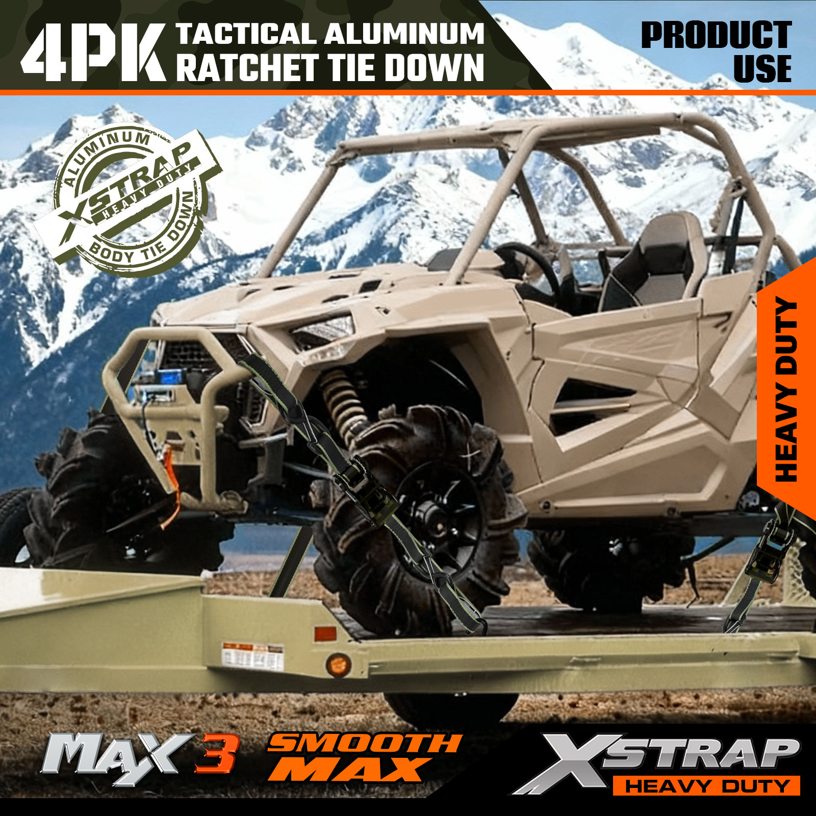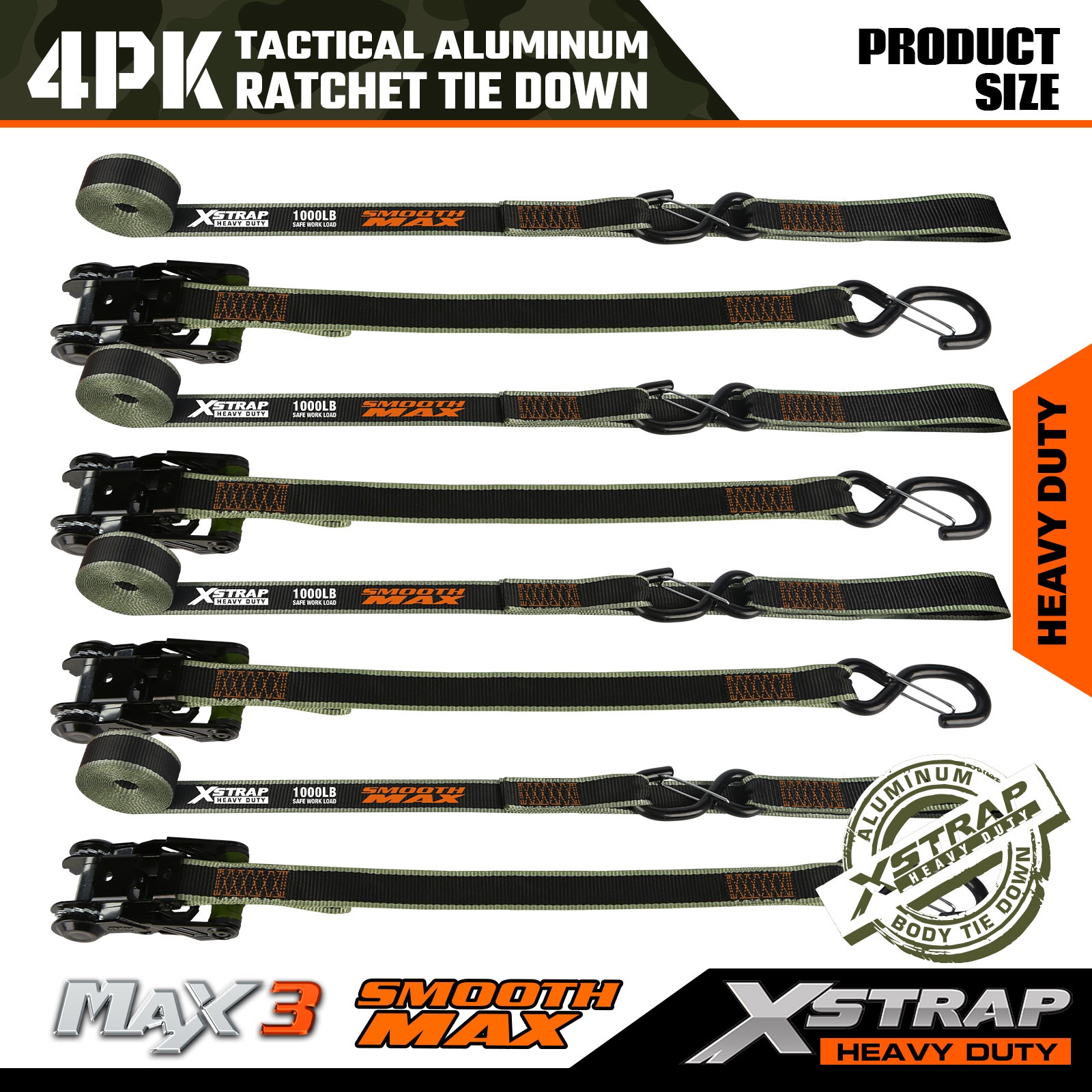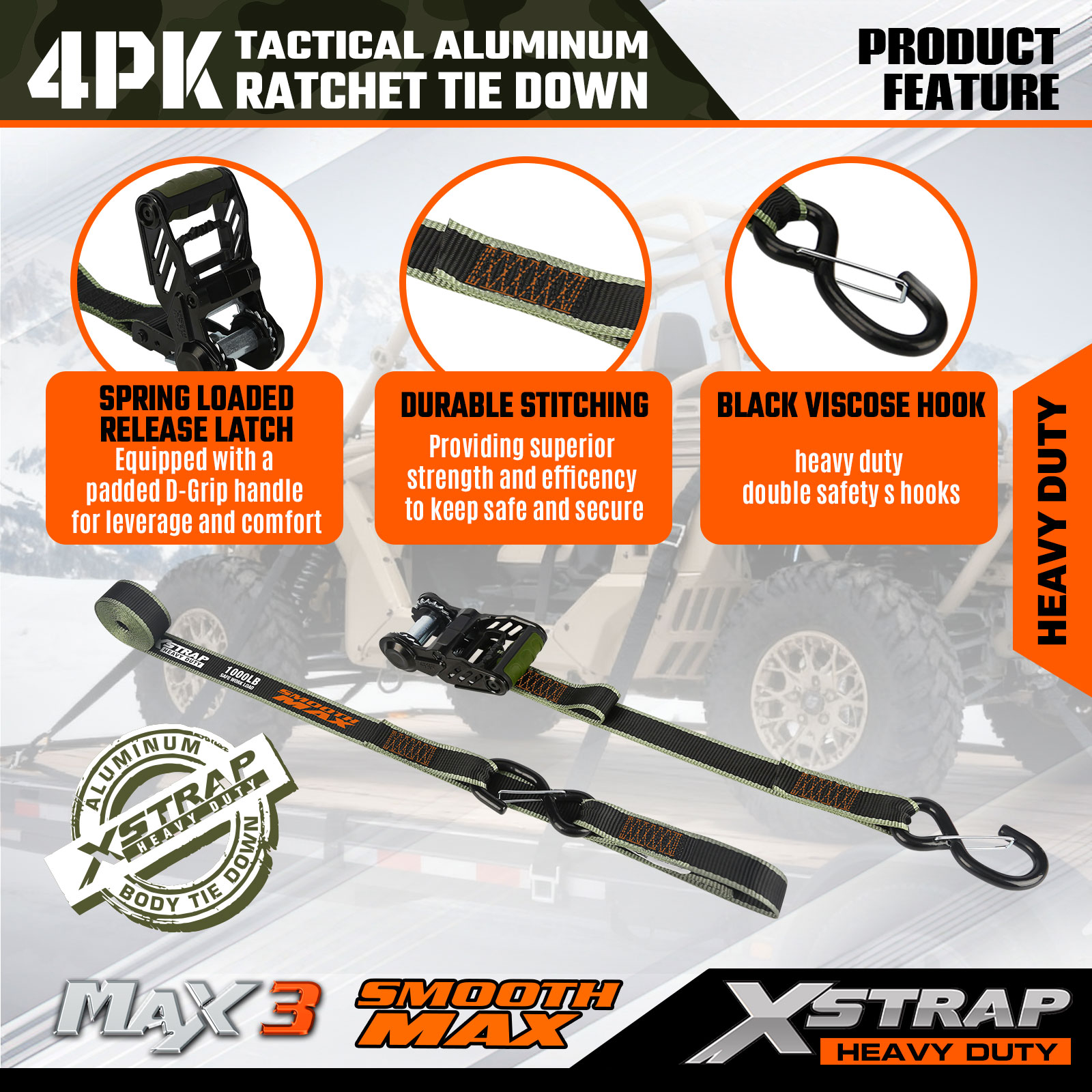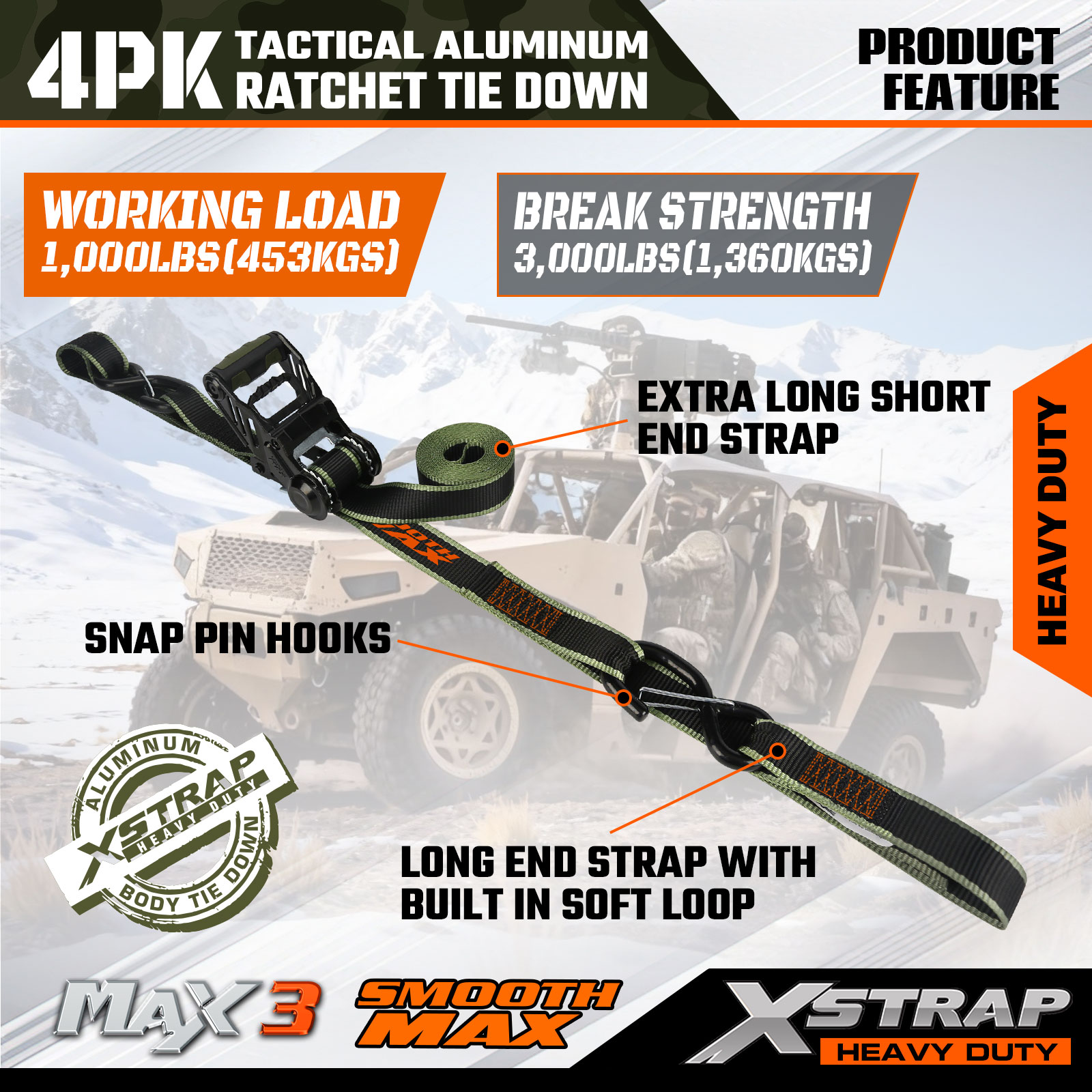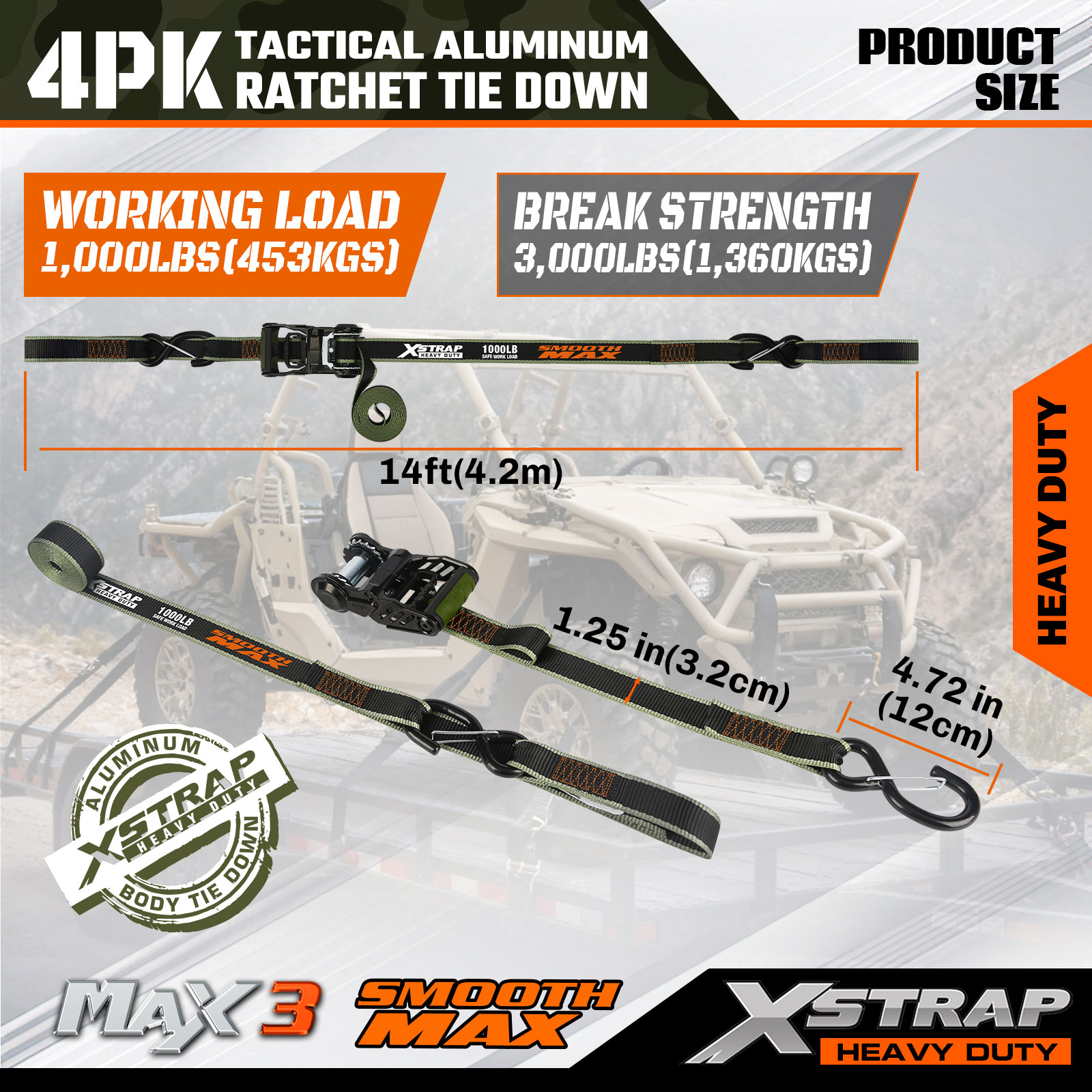 Xstrap Tactical Ratchet Tie Down ialah 1.25 inci x 12ft, beban kerja yang selamat ialah 1000lbs dan kekuatan pecah ialah 3000lbs.