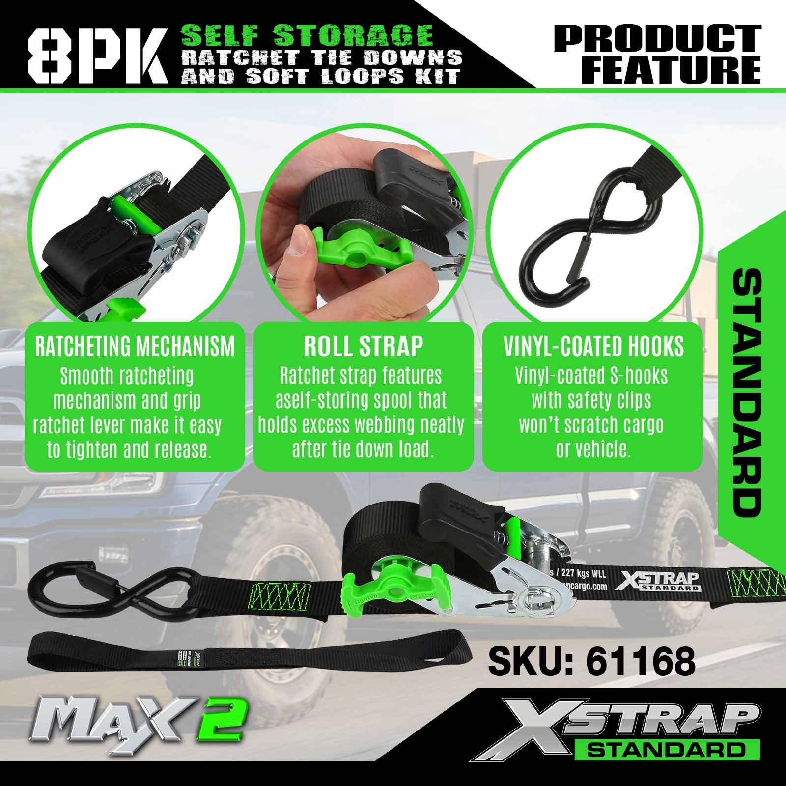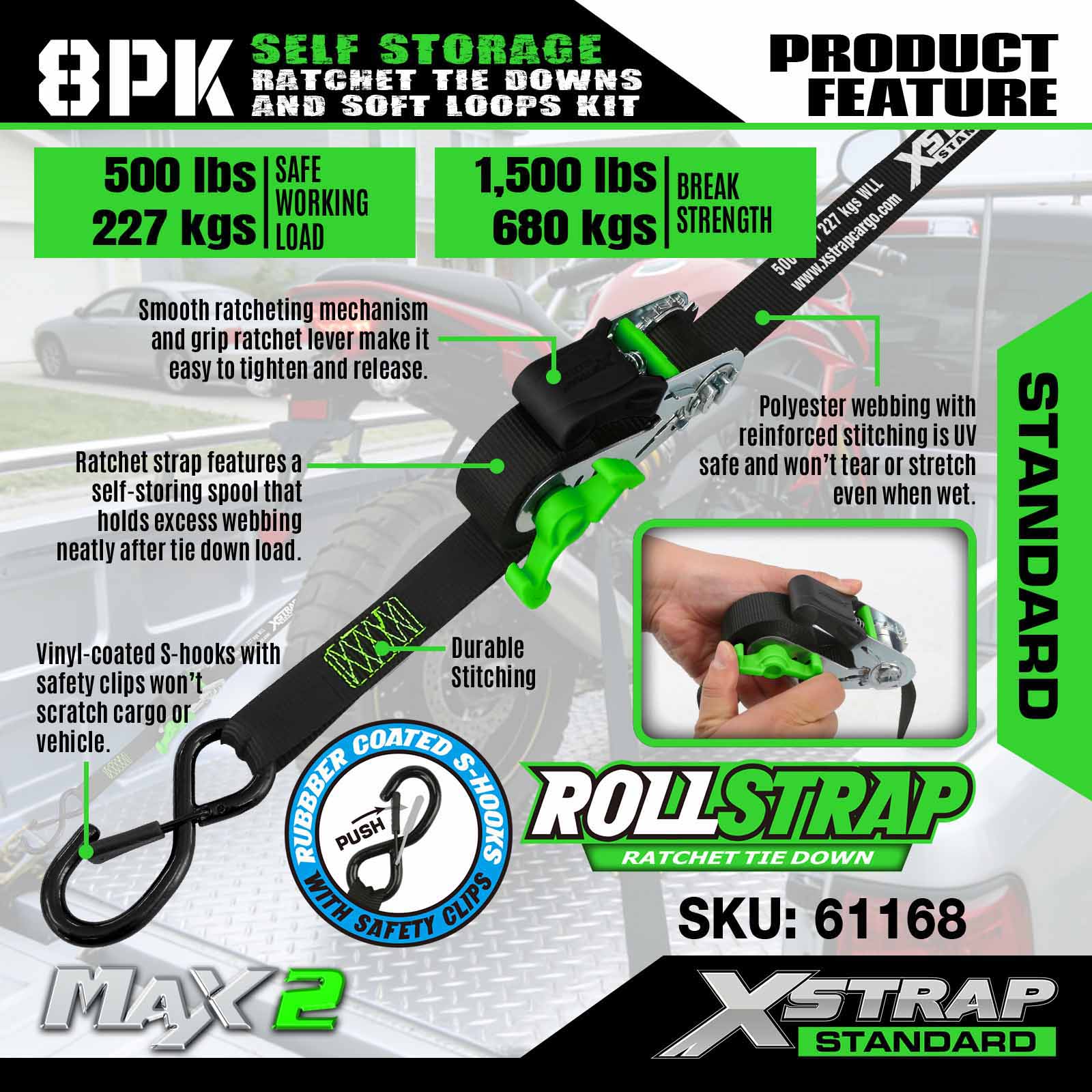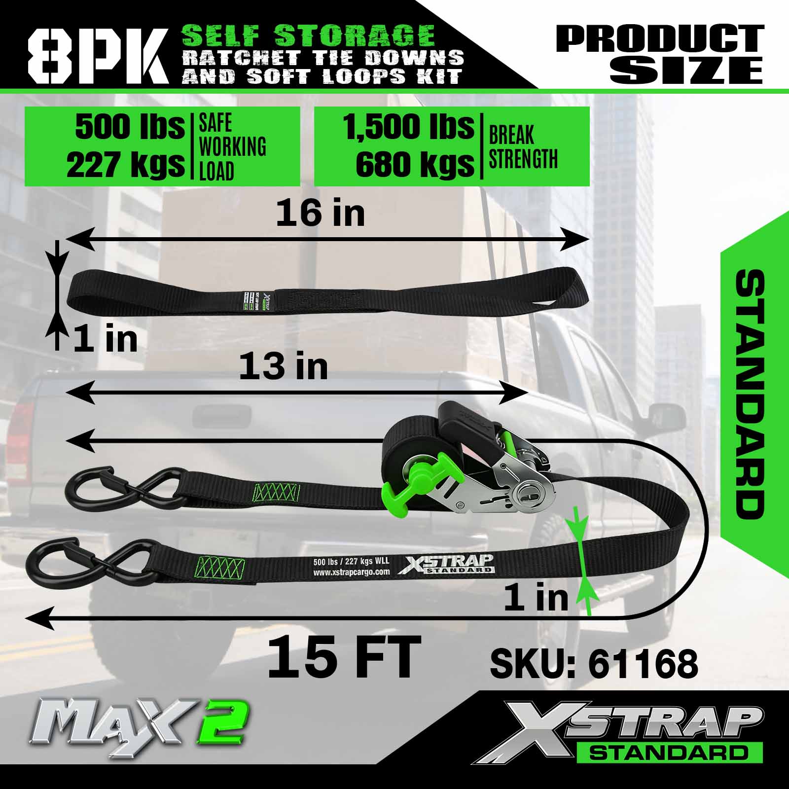 Xstrap 61168 1 inci 15 kaki Penyimpanan Sendiri Pengikat Ratchet 500LB SWL