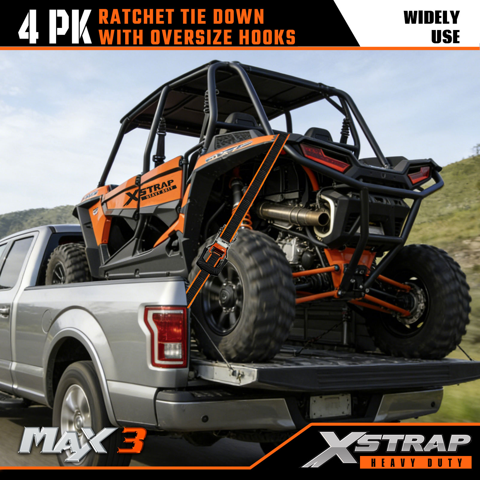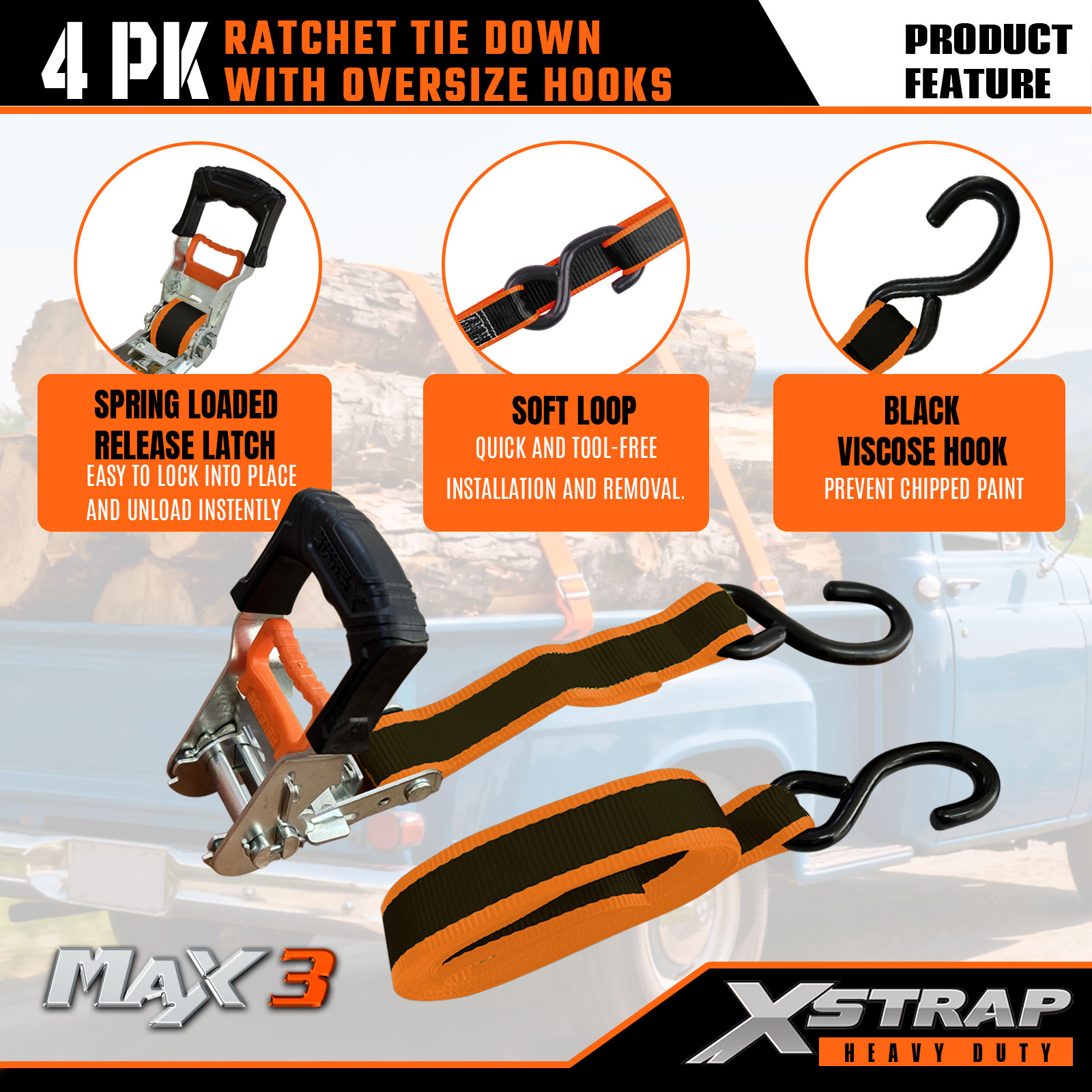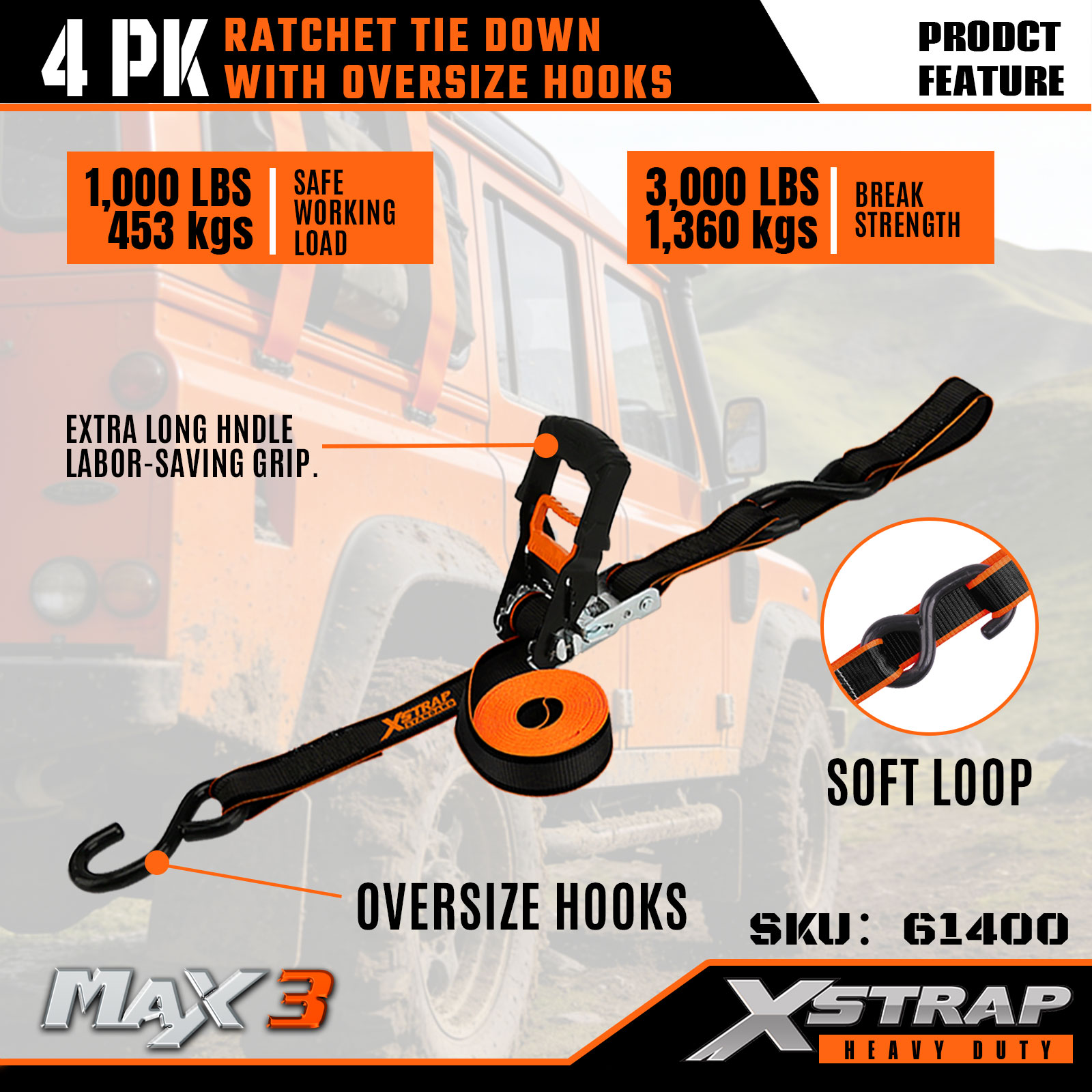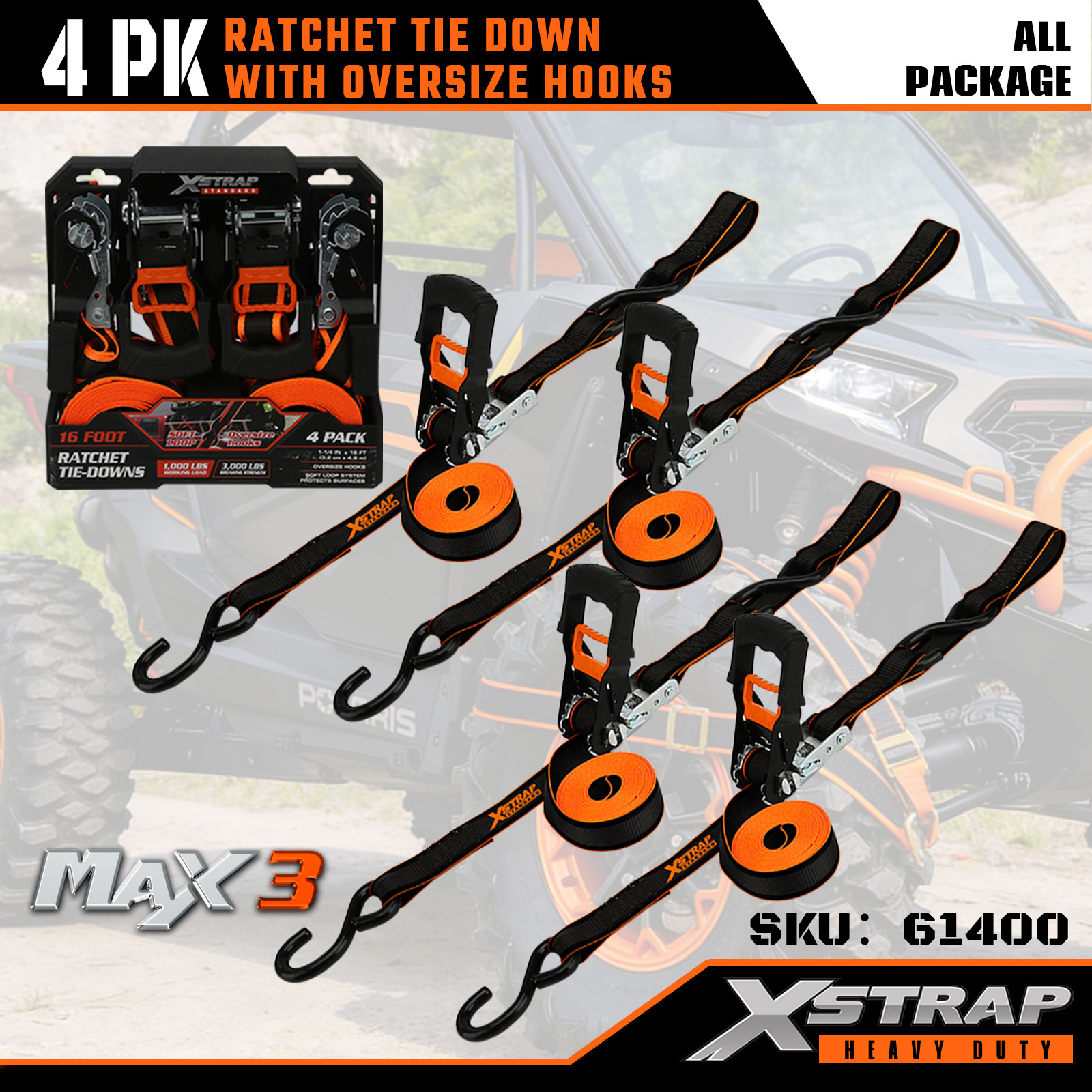 Xstrap 4 Pack Ratchet Tie Down, 1-1/4” x 16’ Poliester Tie Down Strap Tarik Ratchet Strap, 1000lbs Kapasiti Ikatan Kargo Tali Pengaman dengan Double J Hooks untuk Trak Pickup, SUV, Rak Atas Kereta Motosikal, Bot Memancing Ringan, Jet Ski, Kereta Salji.