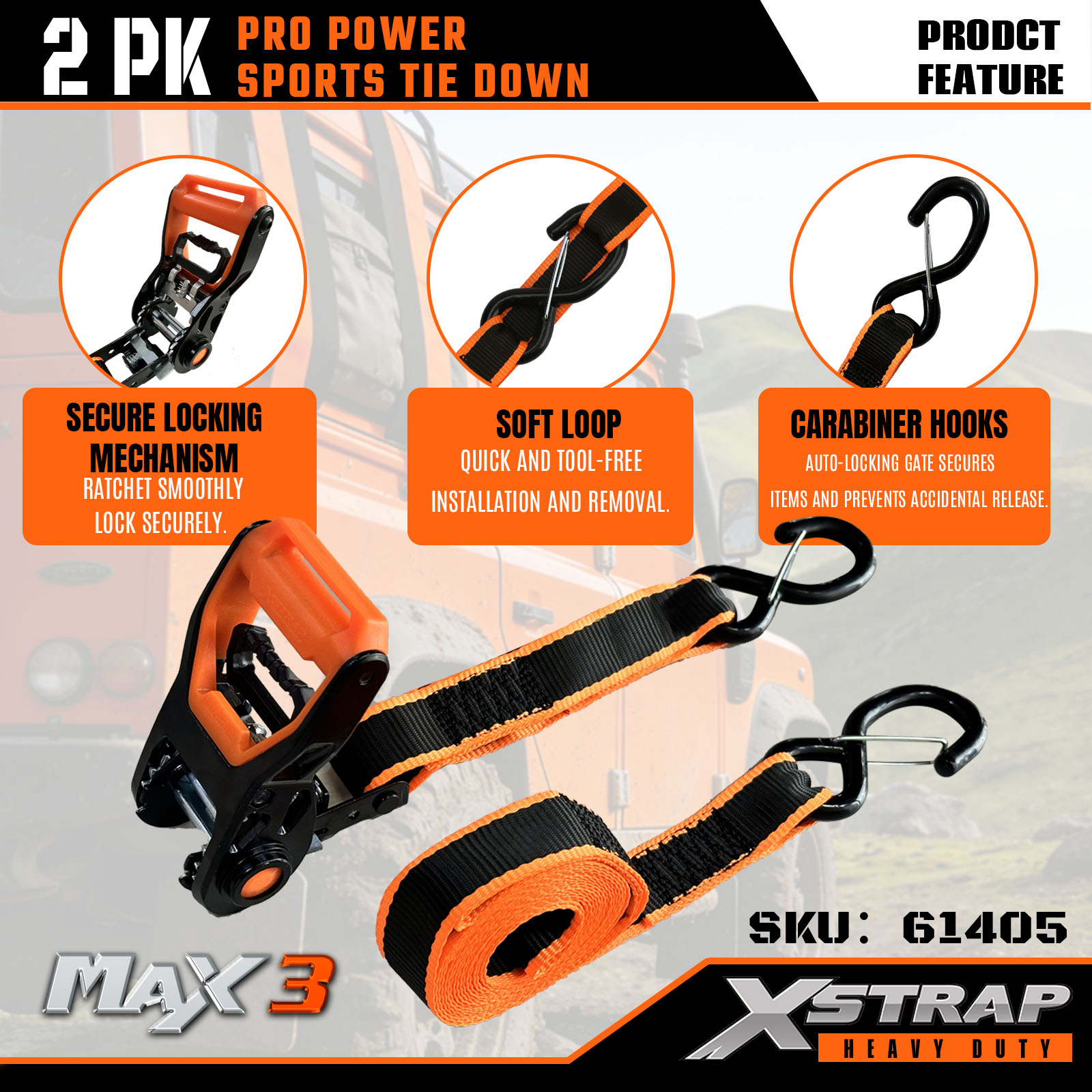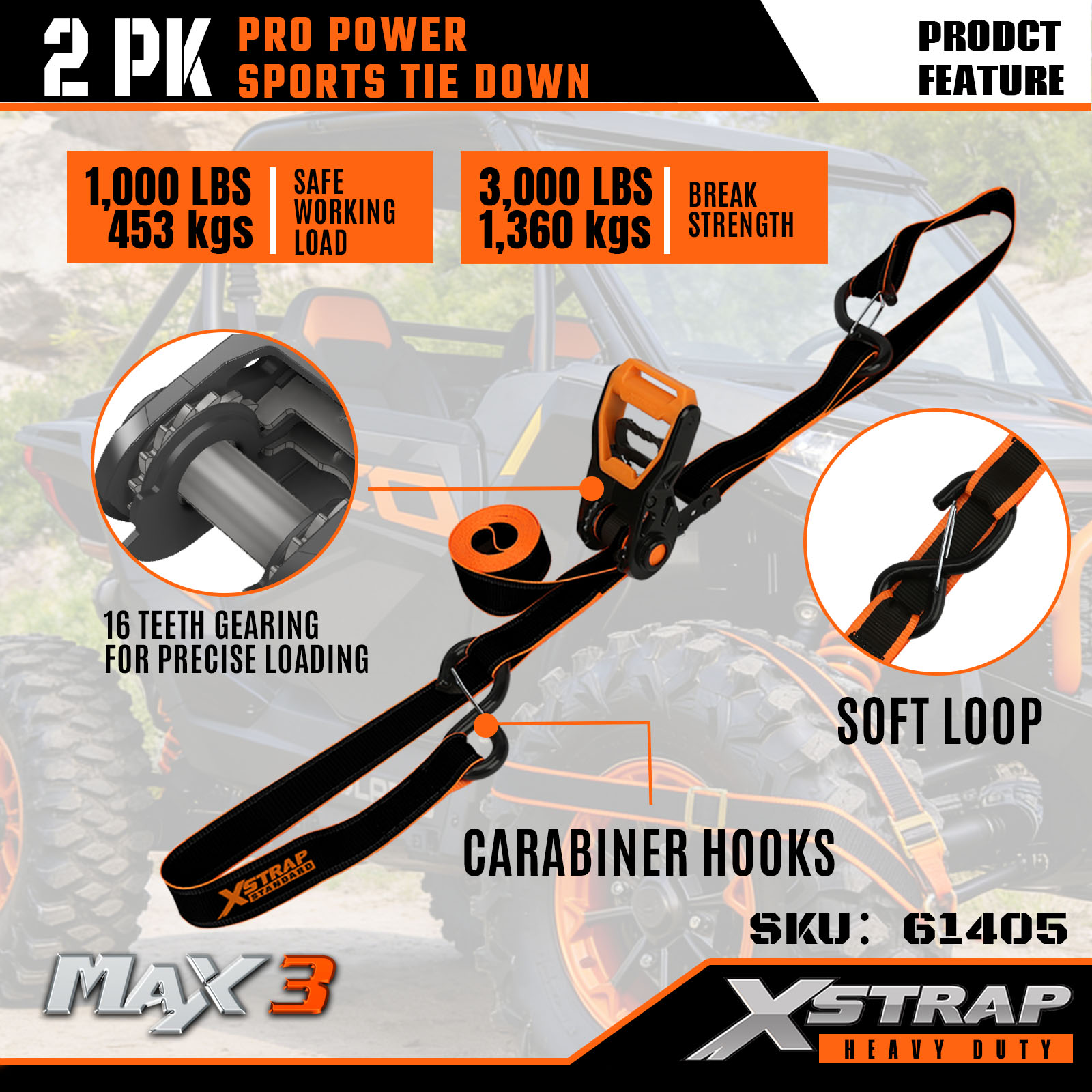 Xstrap 2 Pack PRO Power Sports Tie-Down Tali, 1-1/4” x 14’ Poliester Tie Down Strap Tarik Ratchet Strap, 1000lbs Kapasiti Kargo Lashing Tali Pengaman dengan CArabiner Cangkuk untuk Lori, SUV, Rak Atas Kereta Motosikal.