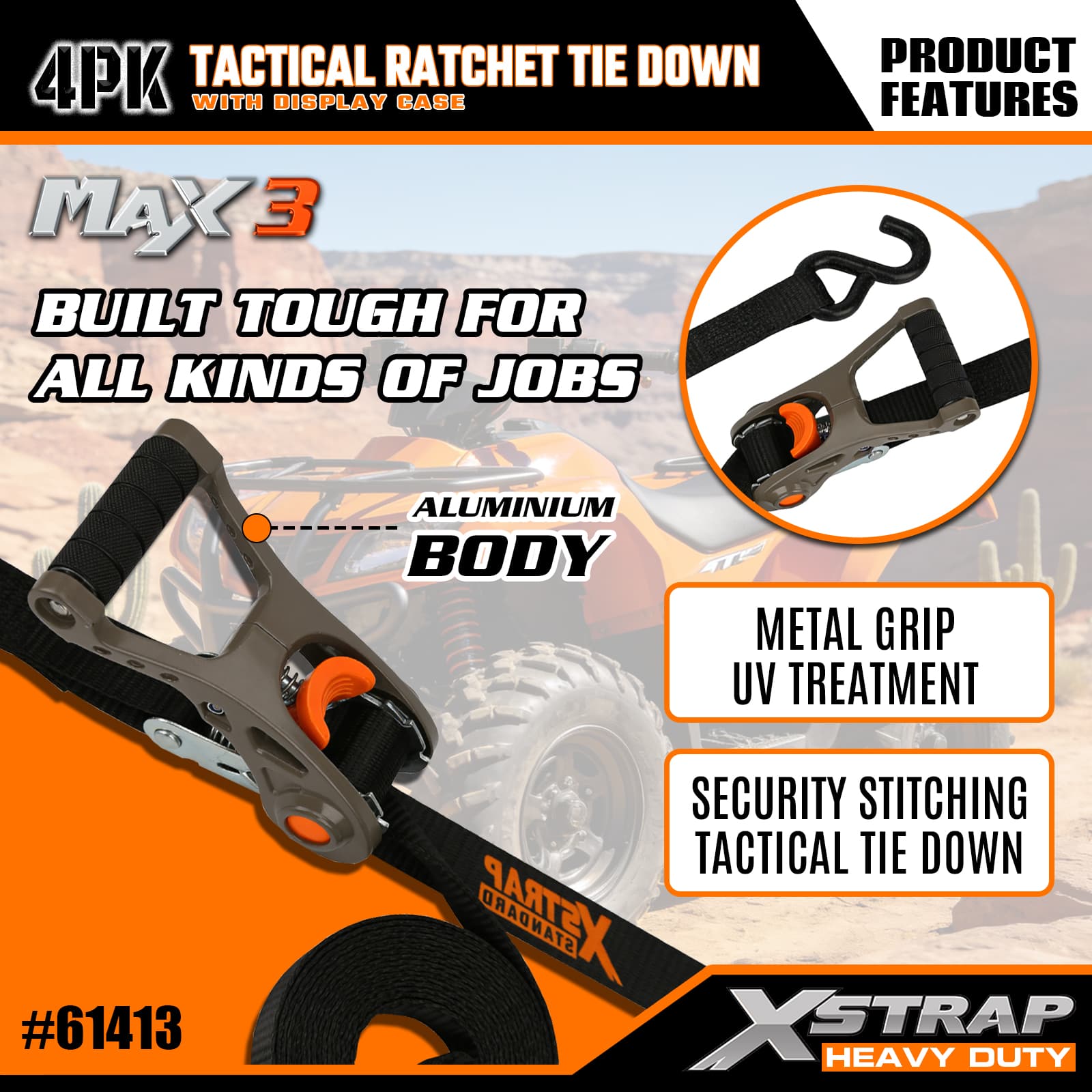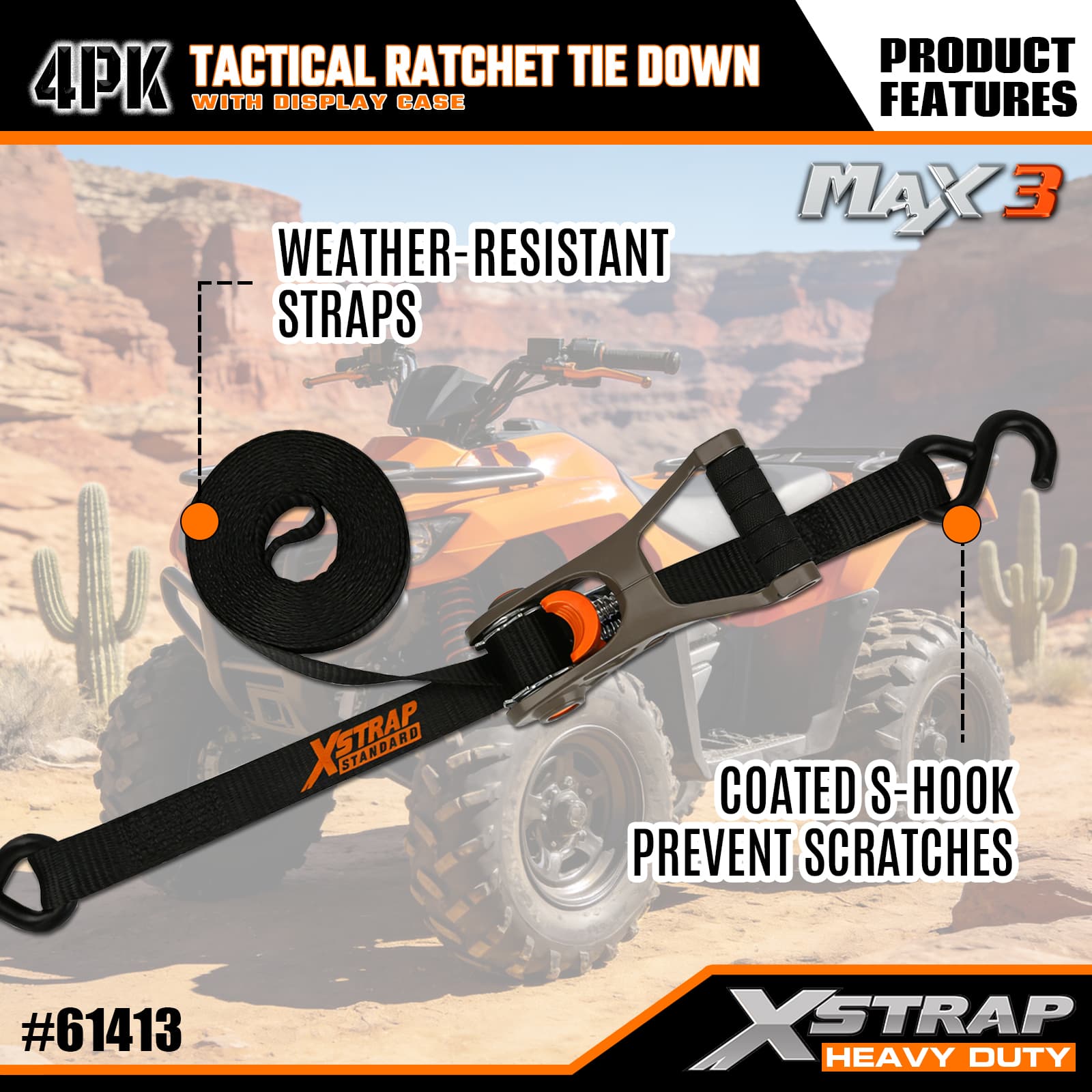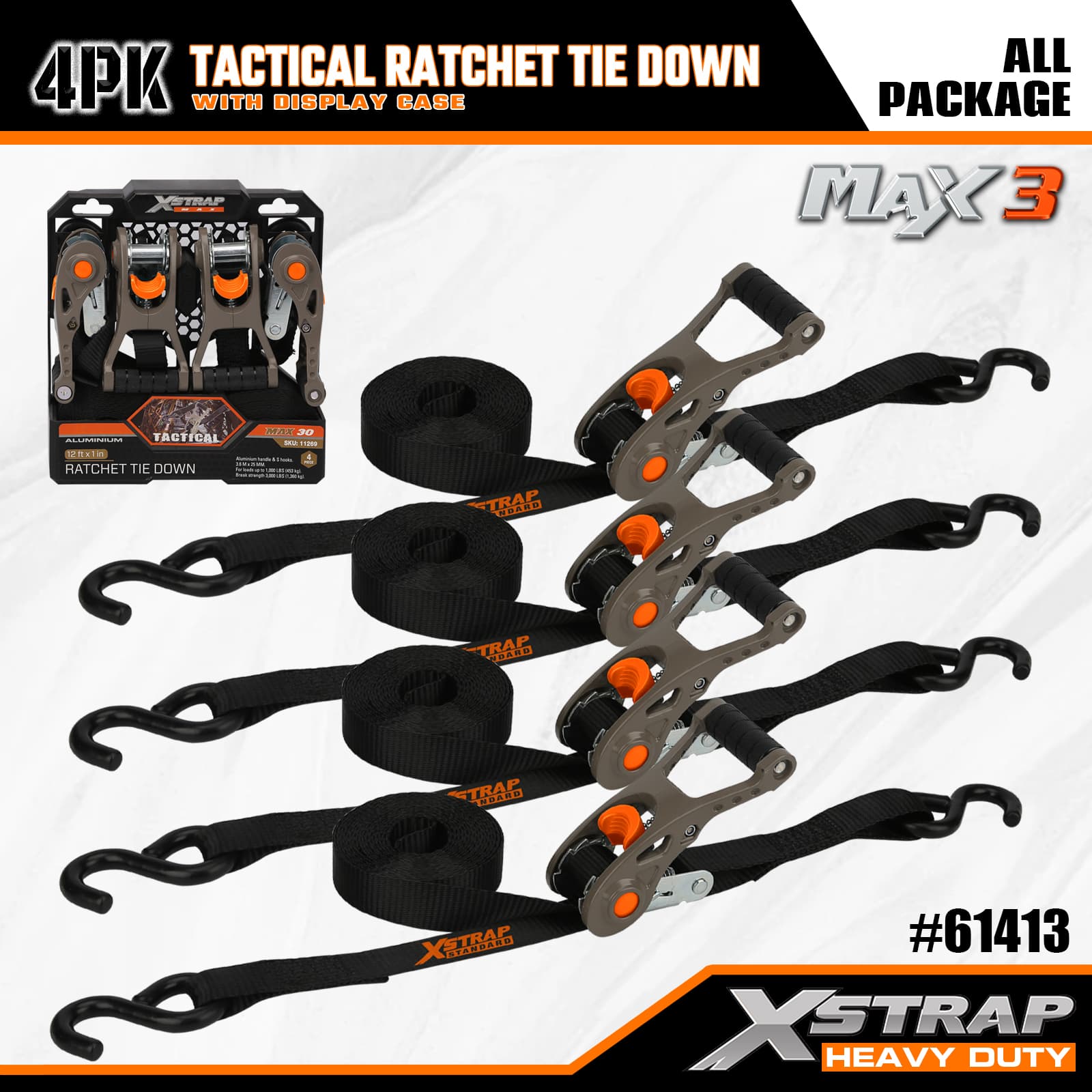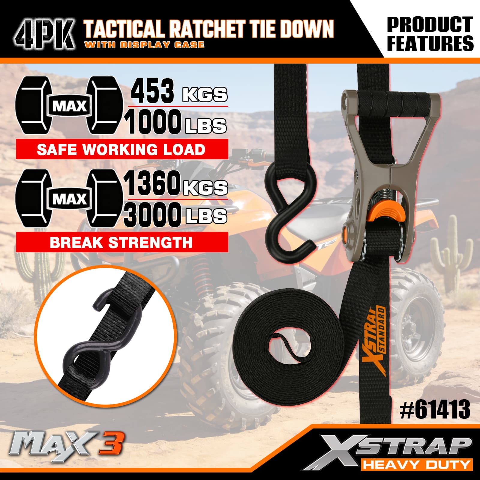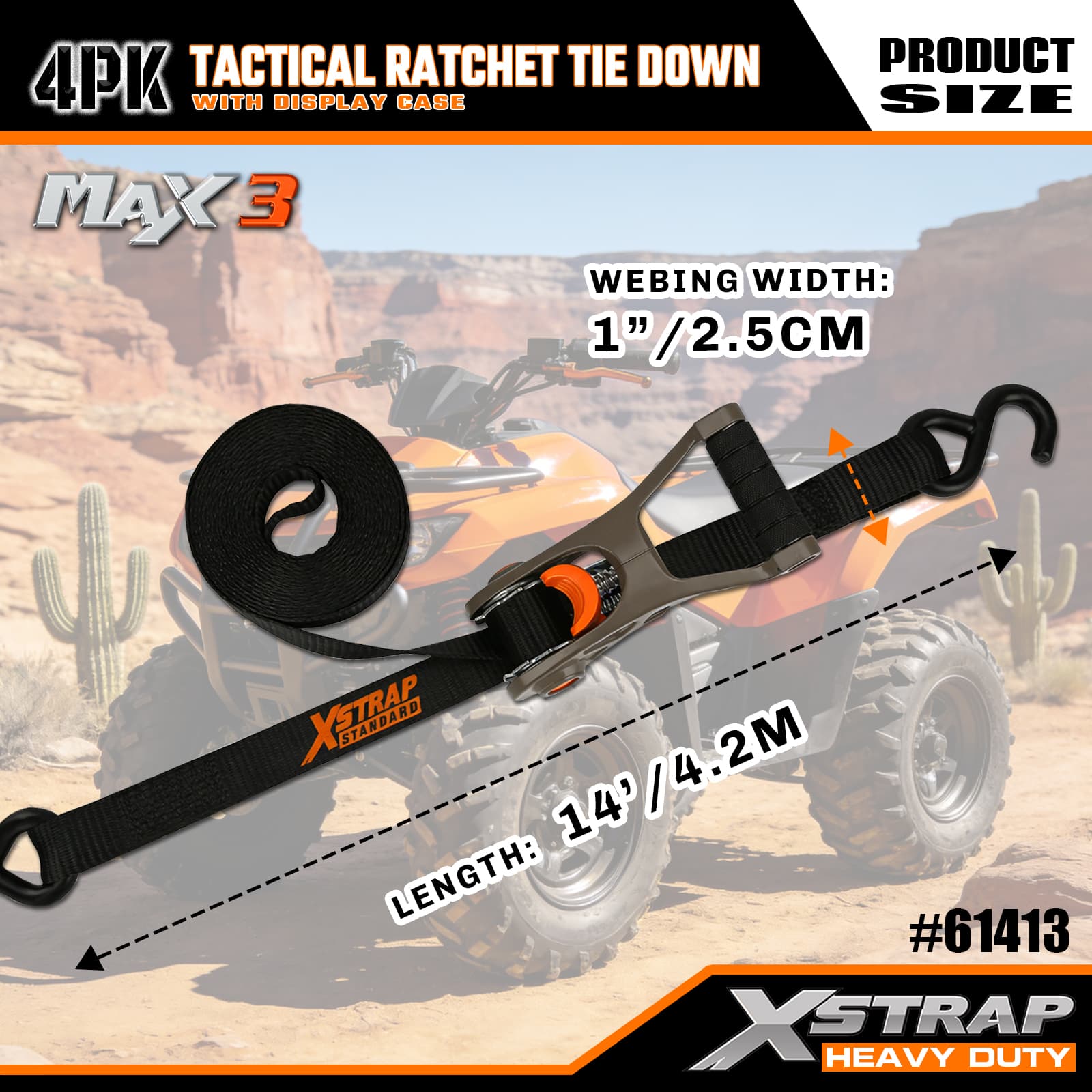 Xstrap 4 Pek Tactical Ratchet Ikatan dengan Gelung Lembut, 1” x 14’ Poliester Tie Down Tali Tarik Ratchet Strap, 1000lbs Kapasiti Ikatan Kargo Tali Pengaman dengan S Cangkuk untuk Lori, SUV, Rak Atas Kereta Motosikal.