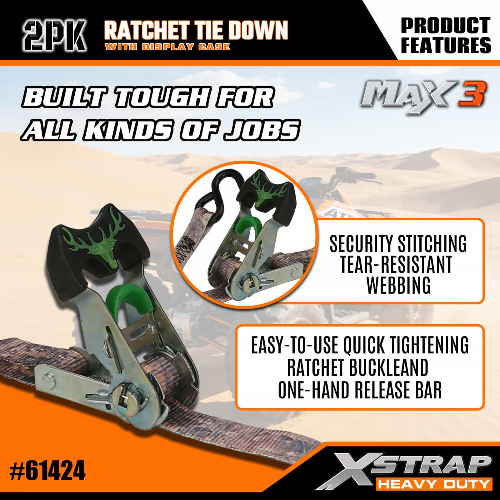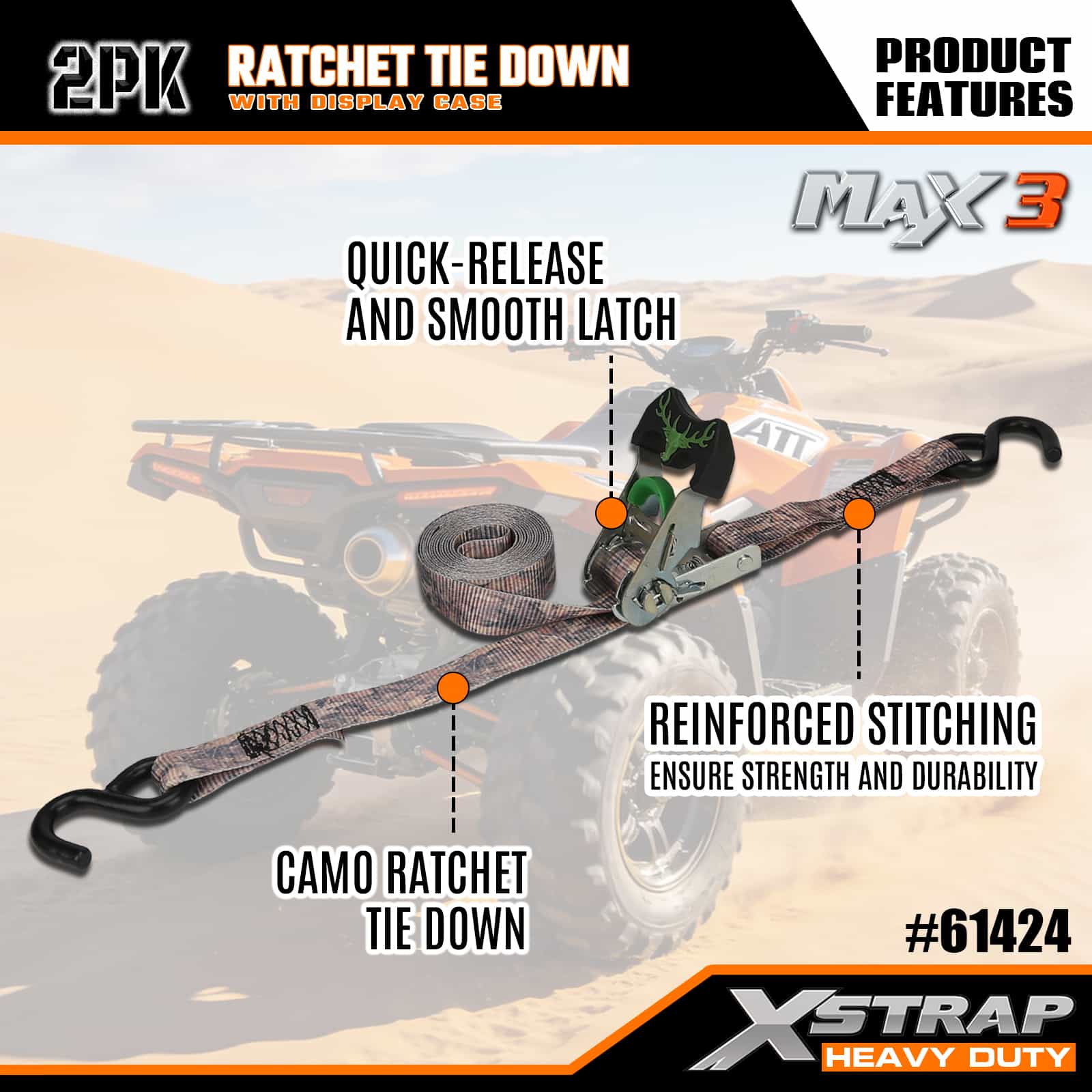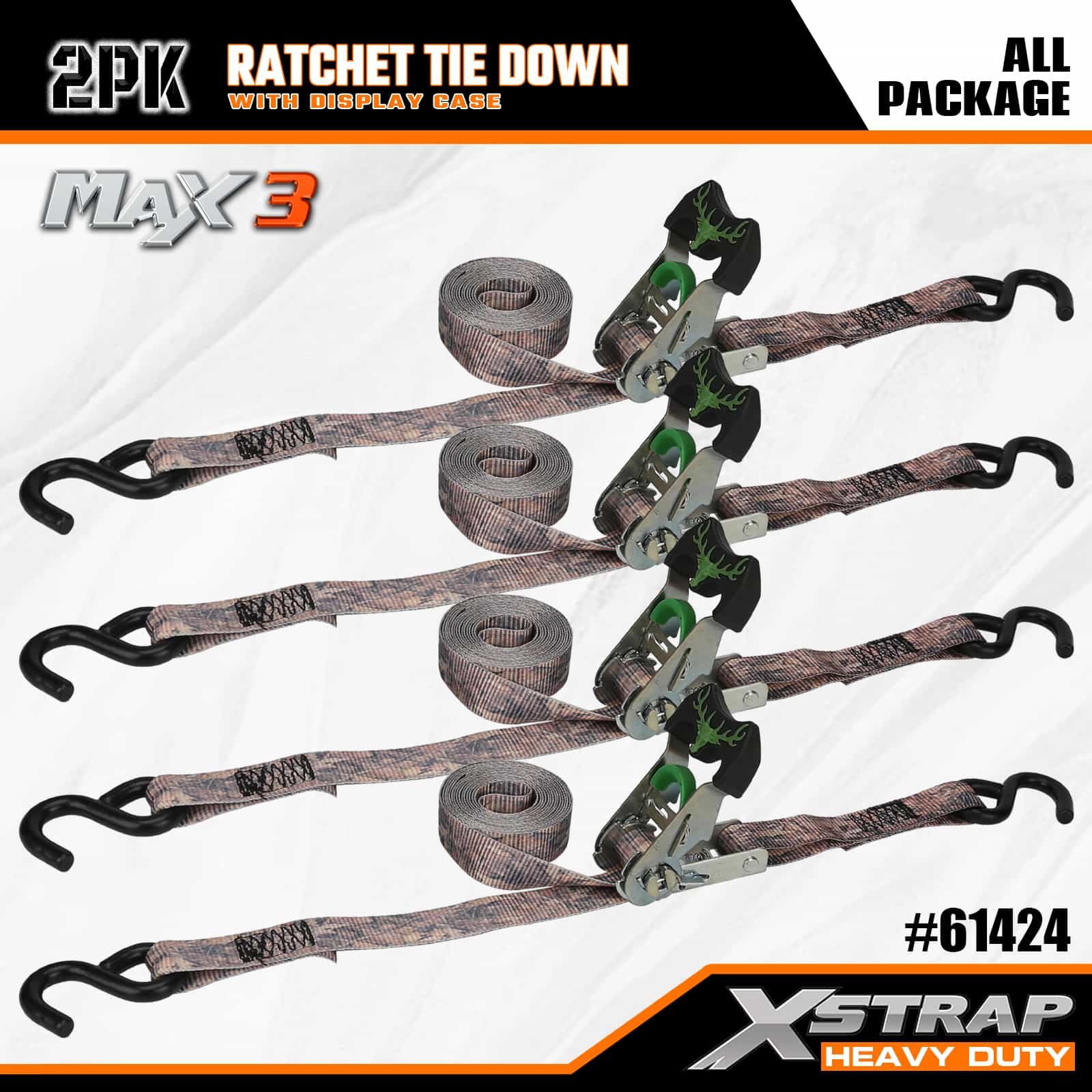 Xstrap 2 Pack Camo Ratchet Tie Down, 1-1/16 ” x 14’ Poliester Tie Down Strap Tarik Ratchet Strap, 1000lbs Kapasiti Ikatan Kargo Tali Pengaman dengan S Cangkuk untuk Trak Pickup, SUV, Rak Atas Kereta Motosikal, Bot Memancing Ringan, Jet Ski, Ski Salji