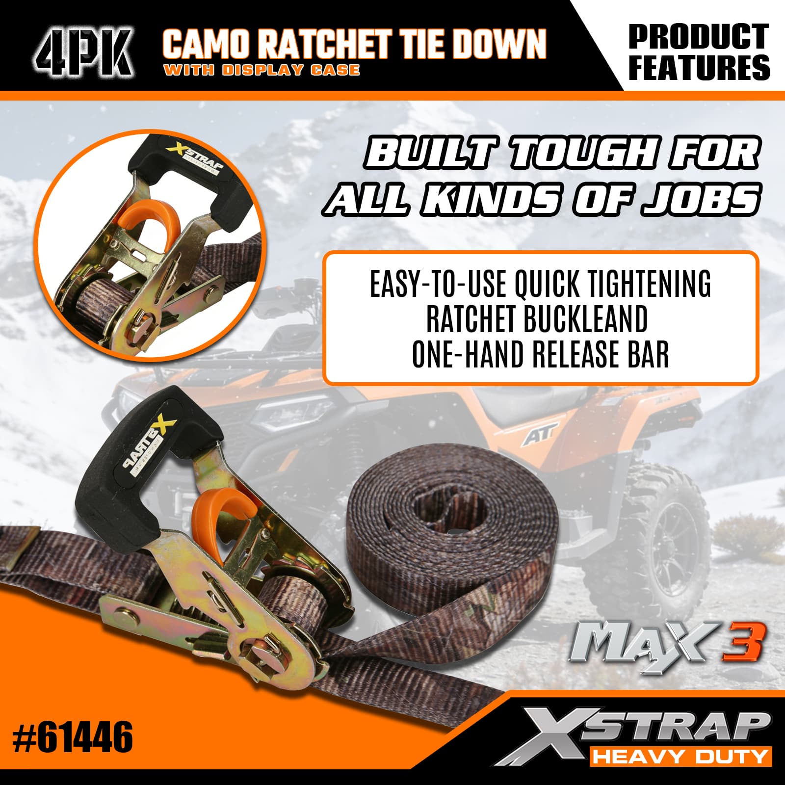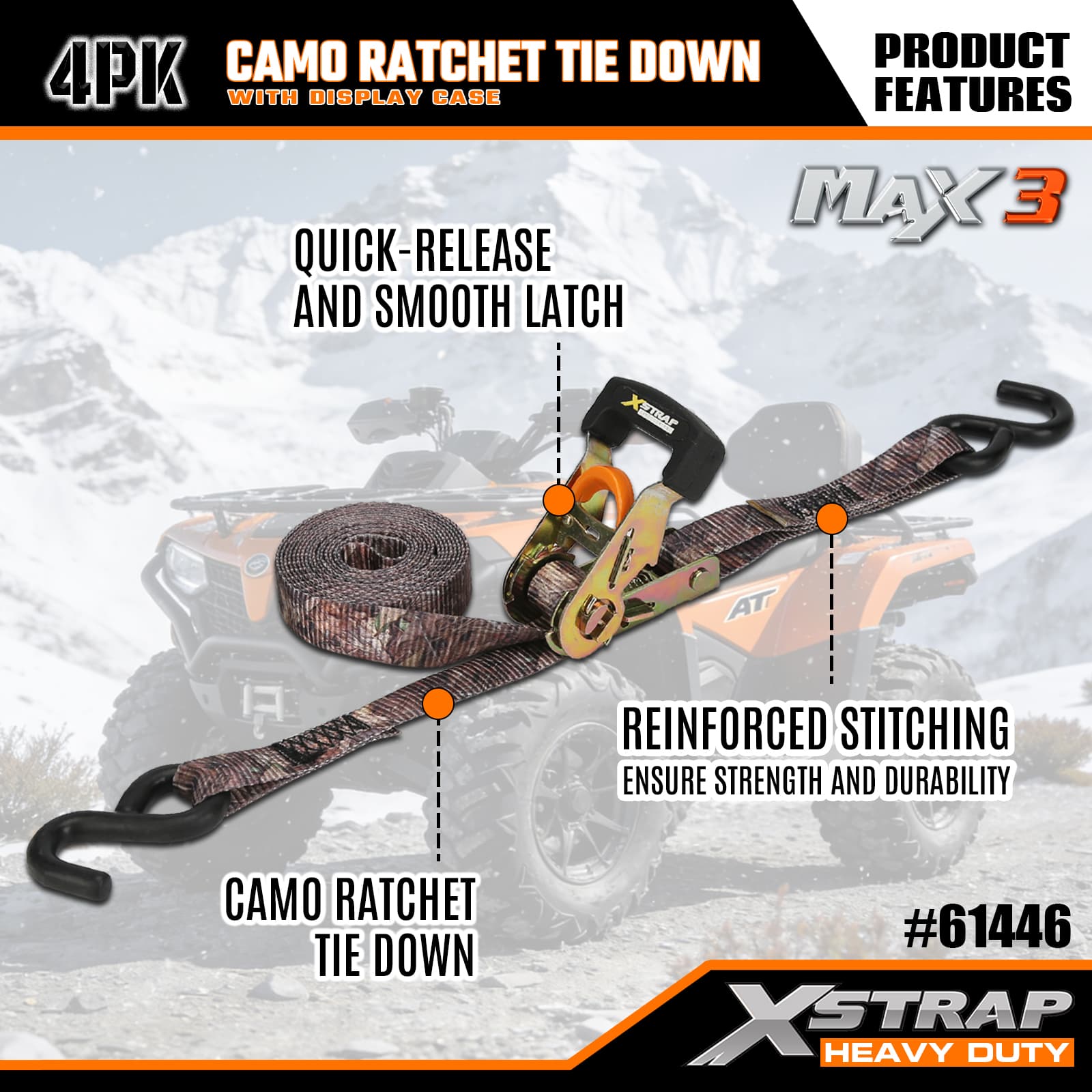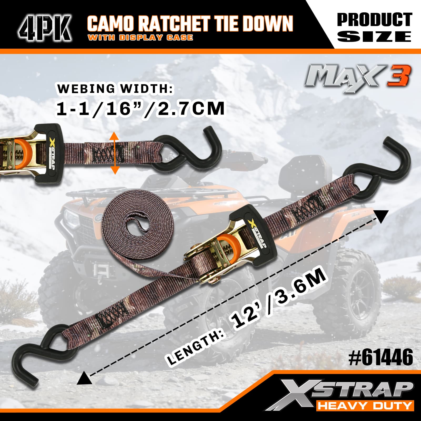 Xstrap 4 Pack Camo Ratchet Tie Down, 1-1/16 ” x 12’ Poliester Tie Down Tali Tarik Ratchet Strap, 1000lbs Kapasiti Ikatan Kargo Tali Pengaman dengan S Cangkuk untuk Trak Pickup, SUV, Rak Atas Kereta Motosikal, Bot Memancing Ringan, Lawn Ski, Kereta Salji.
