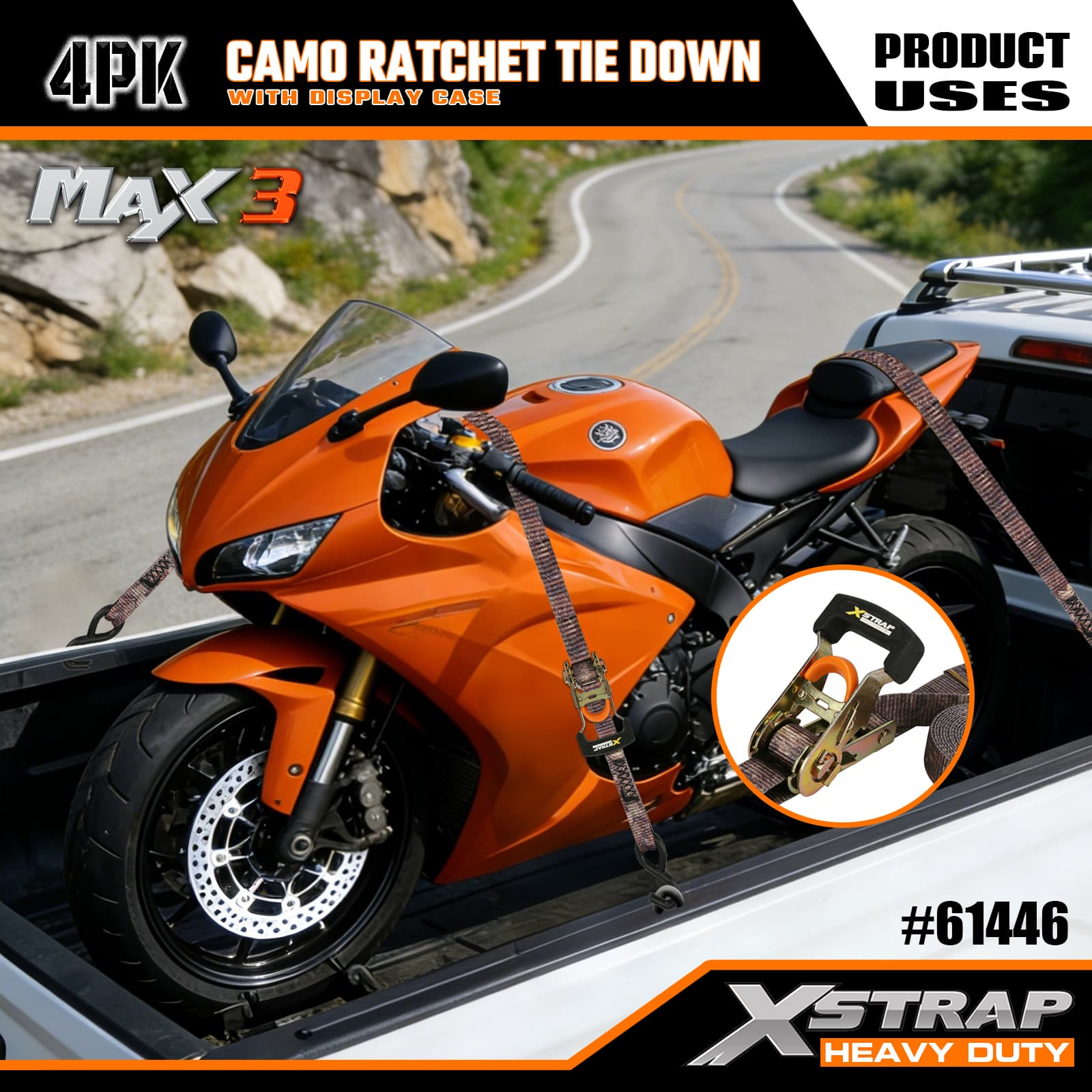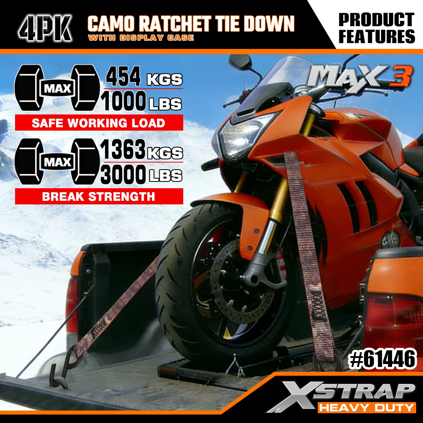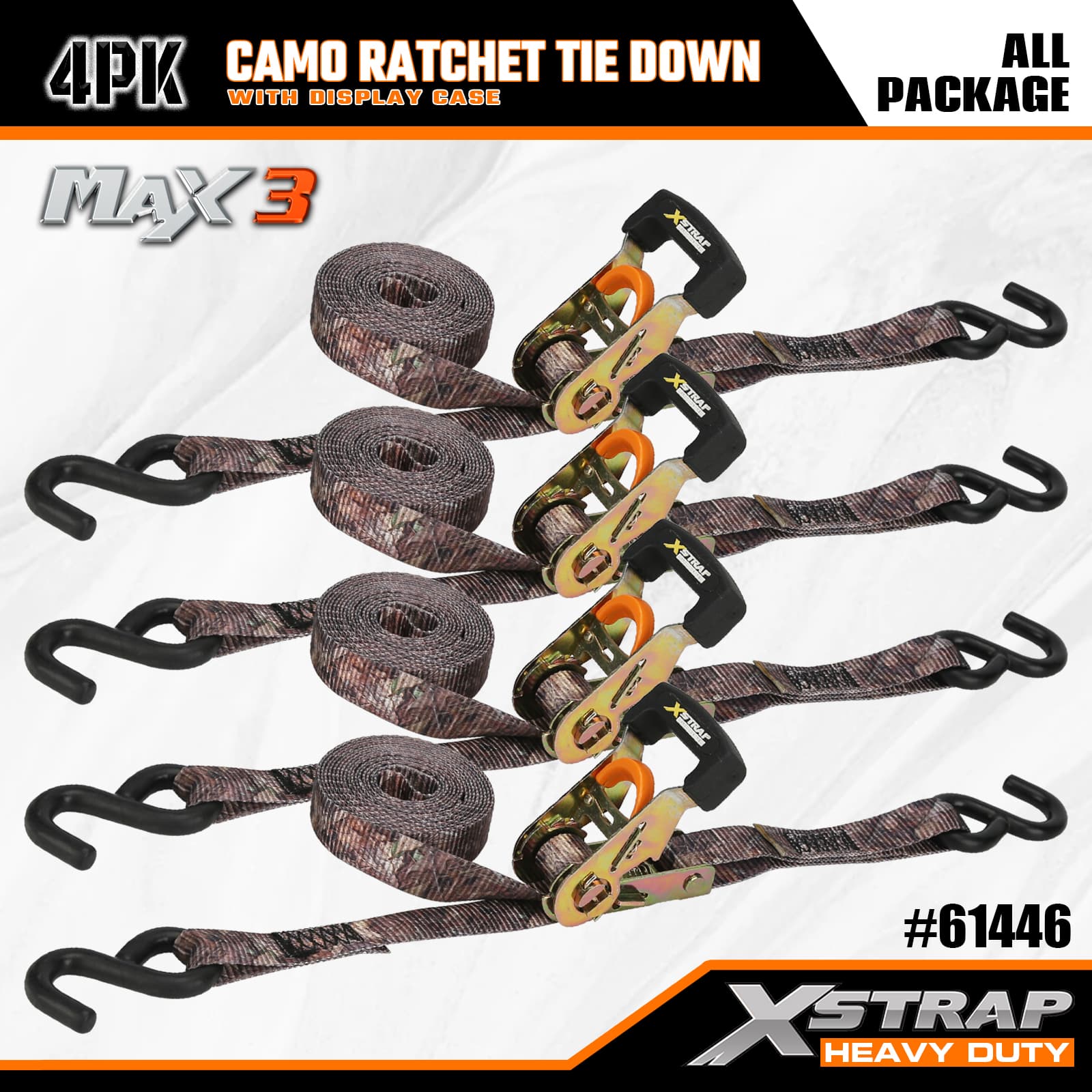 Xstrap 4 Pack Camo Ratchet Tie Down, 1-1/16 ” x 12’ Poliester Tie Down Tali Tarik Ratchet Strap, 1000lbs Kapasiti Ikatan Kargo Tali Pengaman dengan S Cangkuk untuk Trak Pickup, SUV, Rak Atas Kereta Motosikal, Bot Memancing Ringan, Lawn Ski, Kereta Salji.