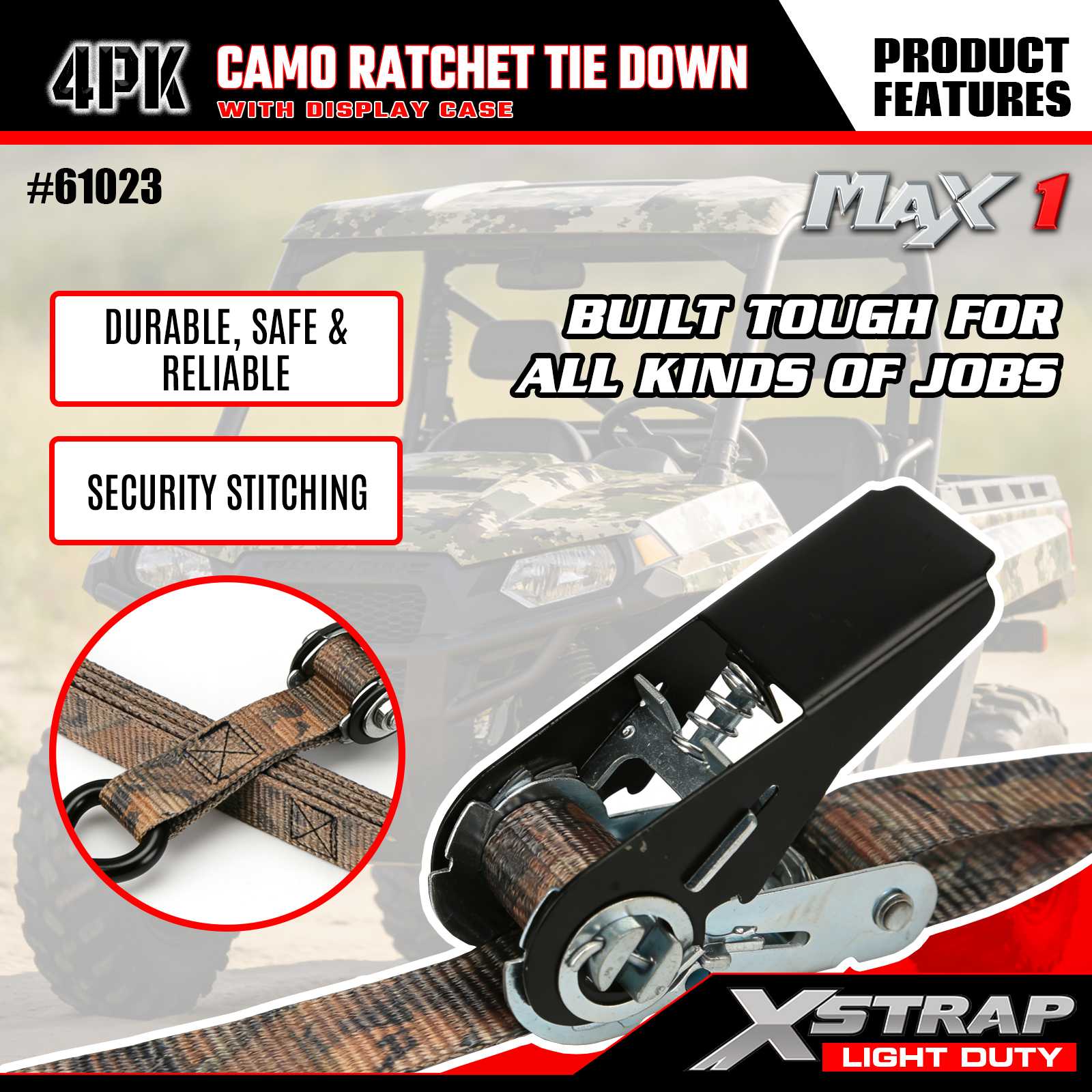 Tali Pengikat Kebawah Xstrap 4PK CAMO adalah 1 dalam x 10 kaki, beban kerja yang selamat ialah 300 paun dan kekuatan pecah ialah 900 paun.