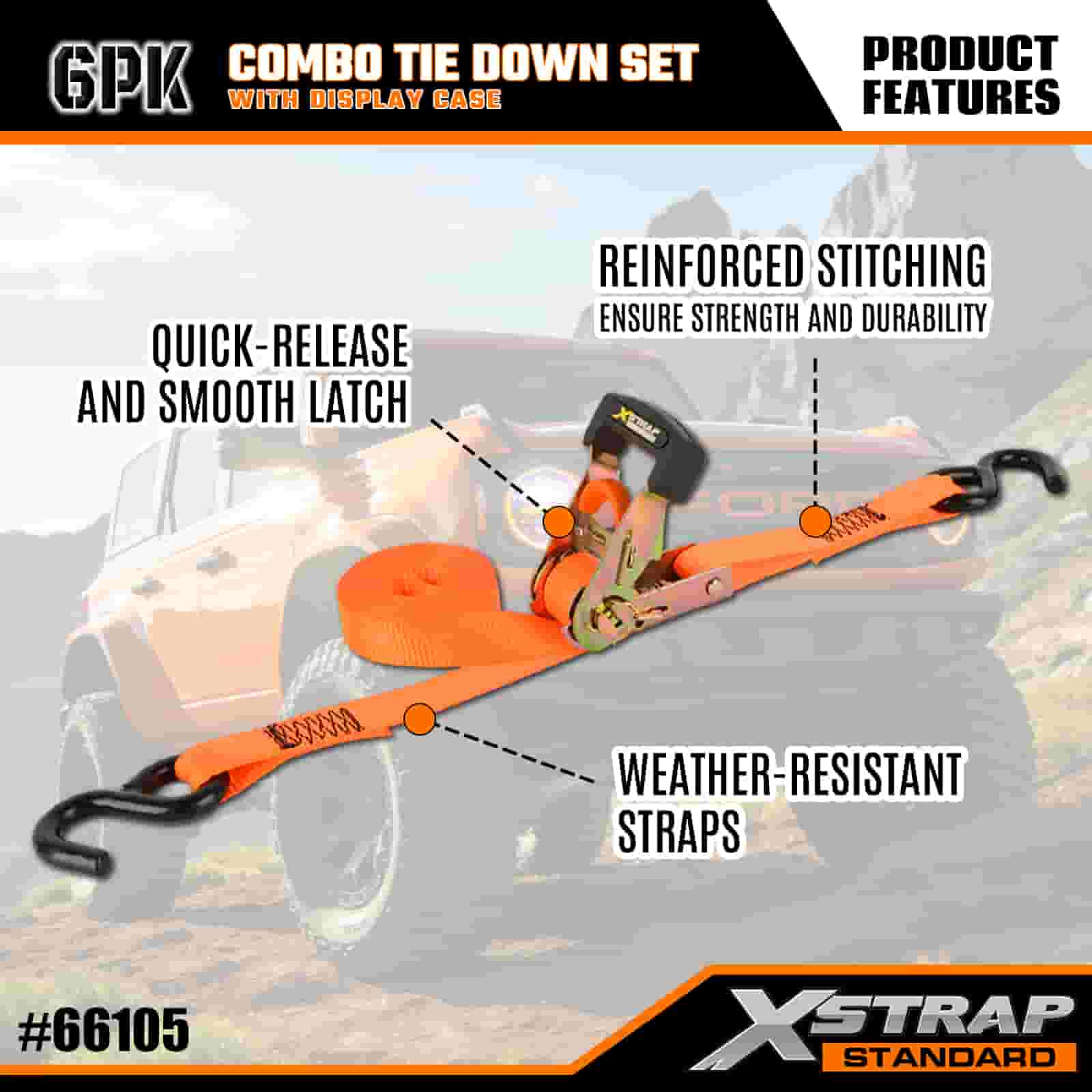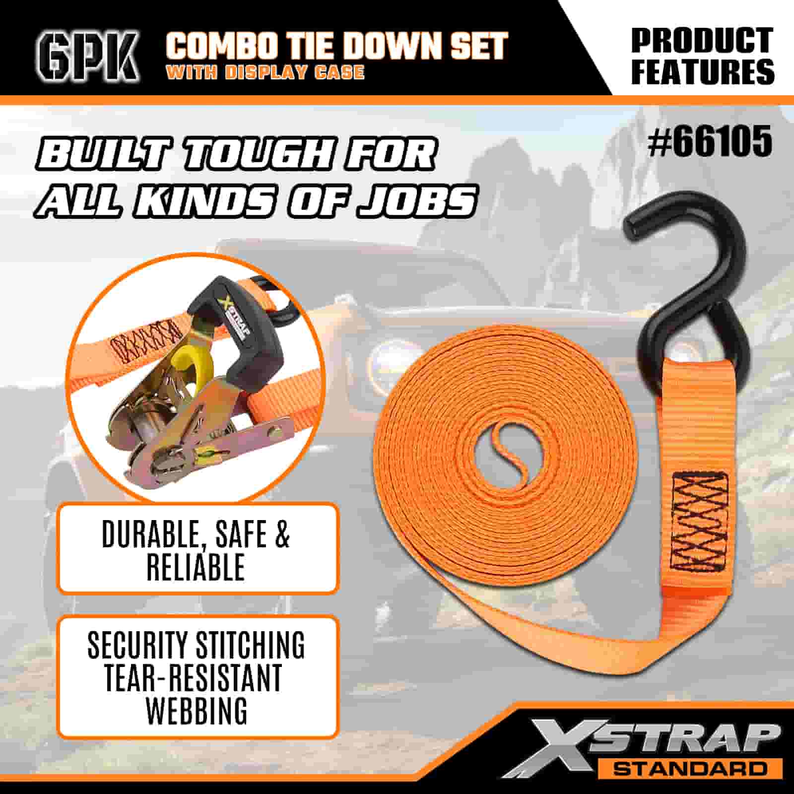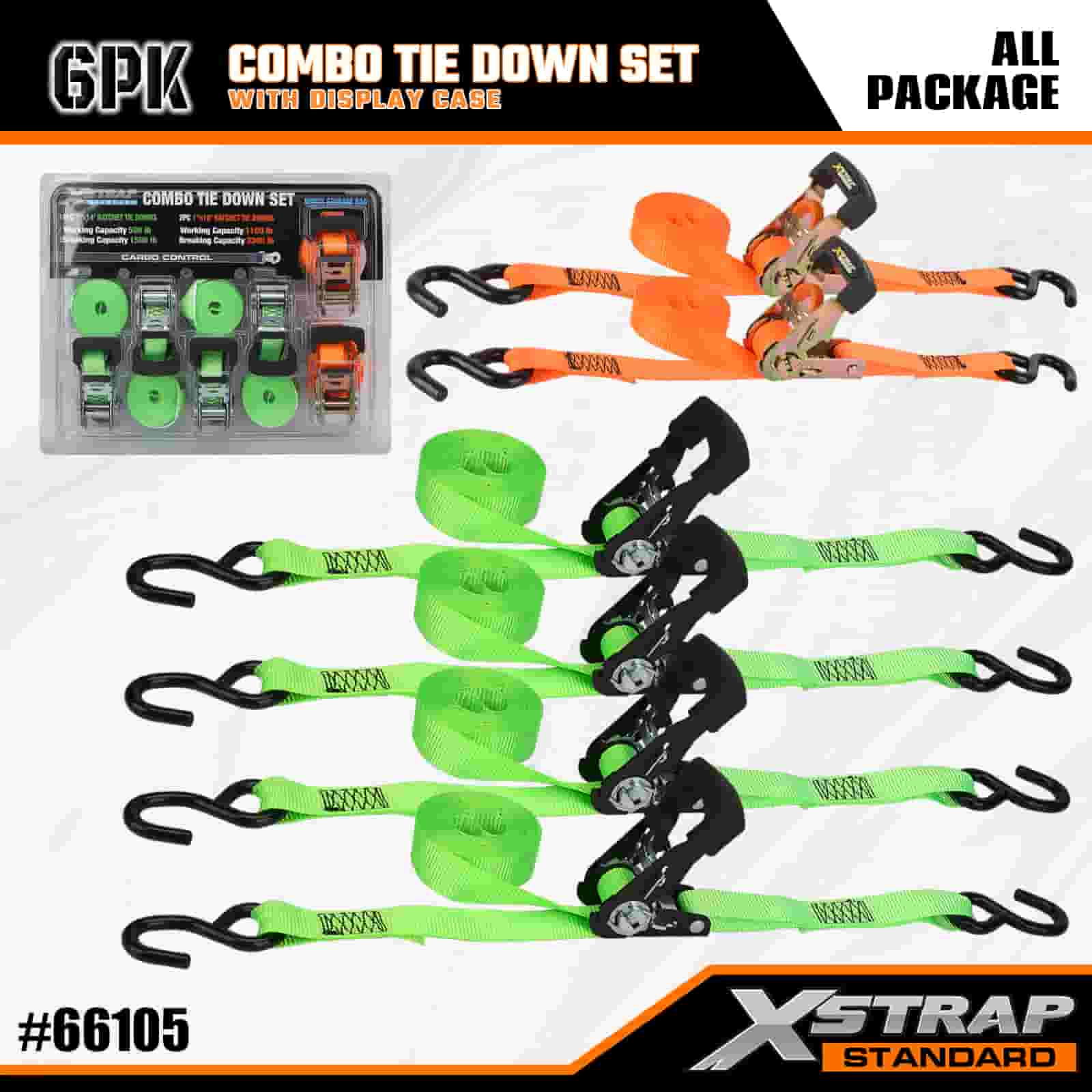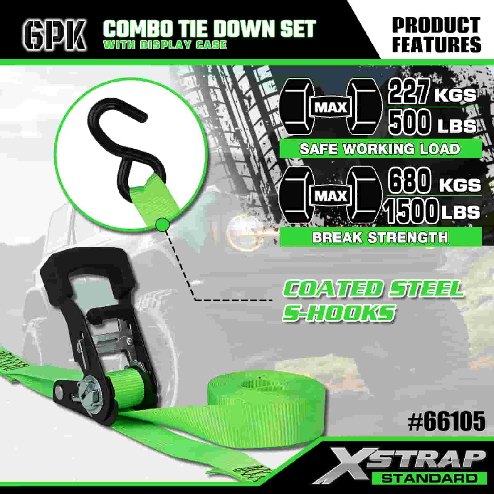 Xstrap 6 Pack Aluminium Ratchet Tie Down, 1” x 14’ dan 1” x 10’ Polyester Tie Down Strap Tarik Ratchet Strap Tarik Ratchet Tali, 500lbs and 1100lbs Tali Pengaman Kargo Berkapasiti dengan S Cangkuk untuk Kawalan Kargo, Trak Pickup Kereta.