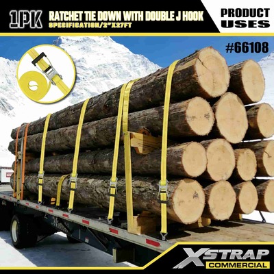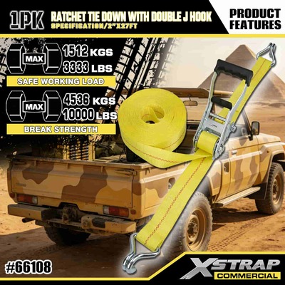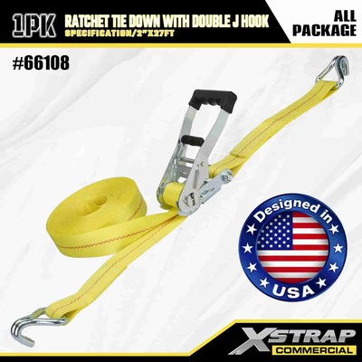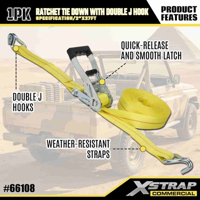 Xstrap Ratchet Tie Down dengan Double J Hooks, 2” x 27’ Poliester Tie Down Strap Tarik Ratchet Strap, 3333lbs Kapasitas Ikatan Kargo Tali Pengaman dengan Double J Hooks untuk Kargo Kawalan Pickup Truk, SUV, Rak Atas Kereta Motosikal,.