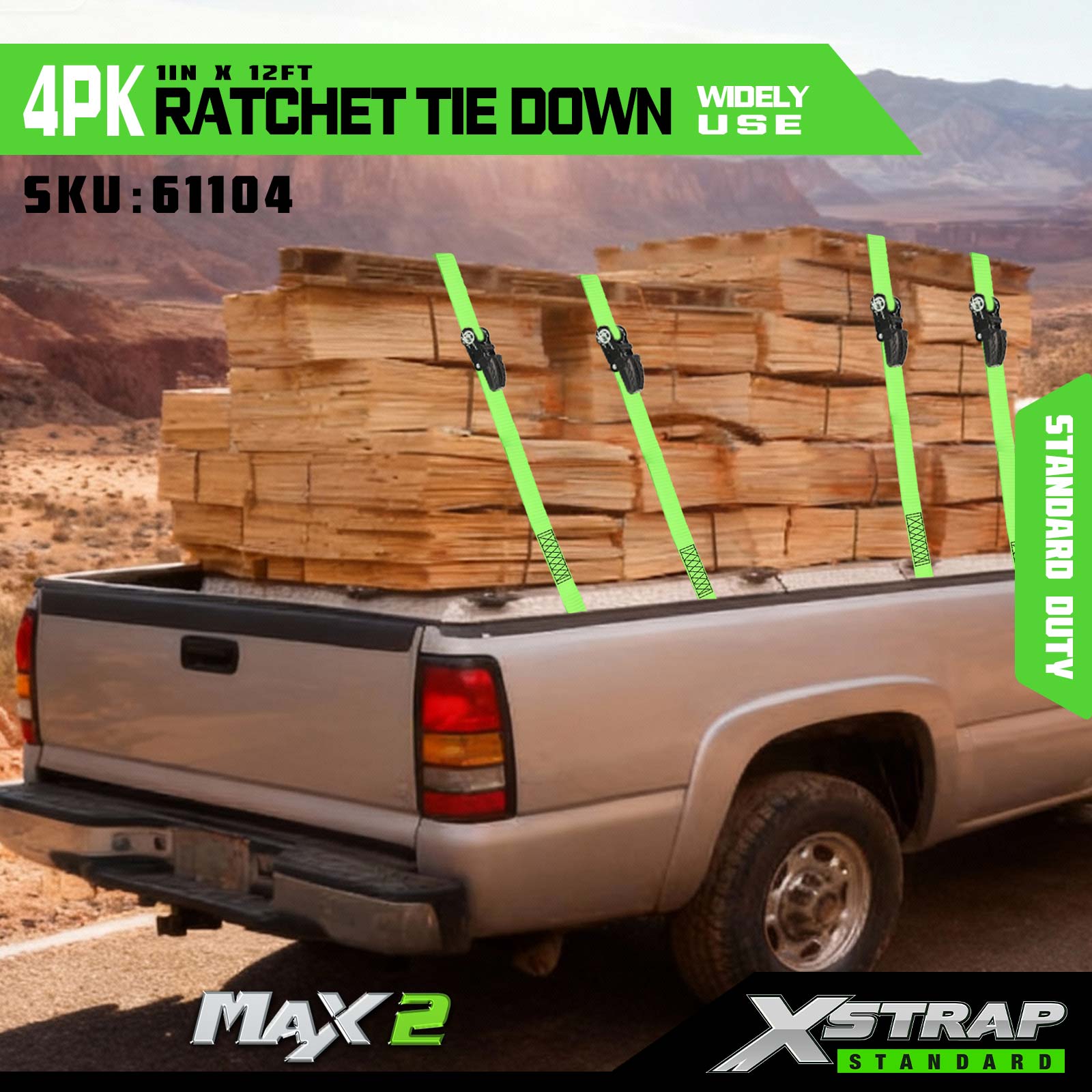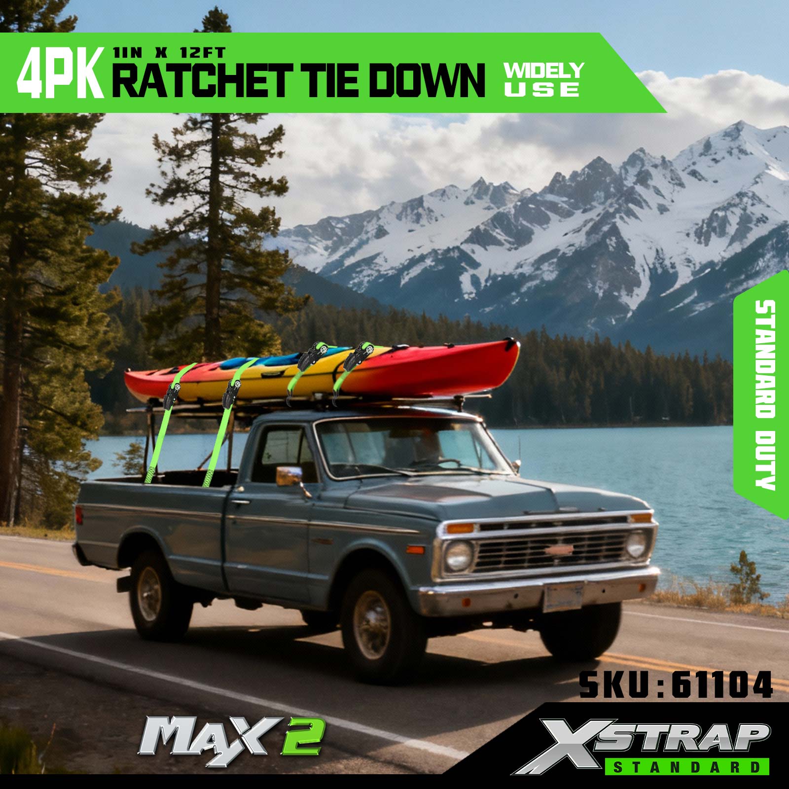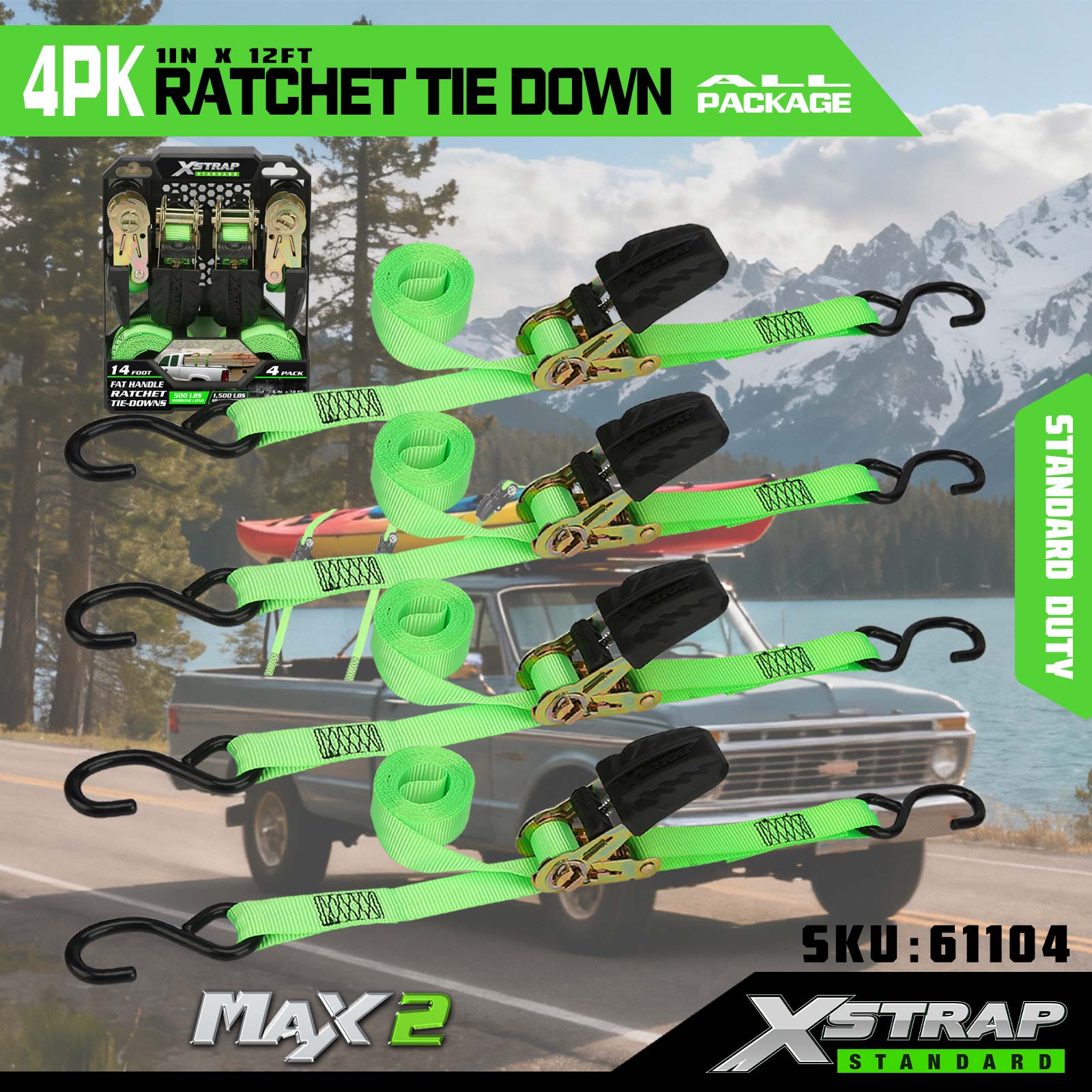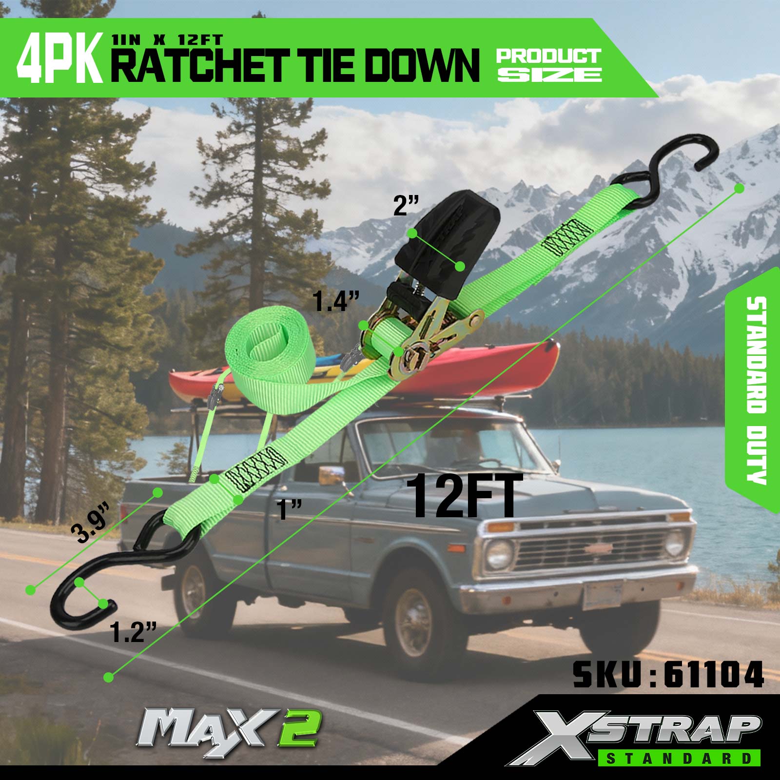 Xstrap 4 Pack Ratchet Tie Down, 1” x 12’ Poliester Tie Down Strap Tarik Ratchet Strap, 500lbs Kapasiti Ikatan Kargo Tali Pengaman dengan S Cangkuk untuk Trak Pickup, Motosikal Treler Ringan, Bot Memancing Ringan, Jet Ski, Kereta Salji.