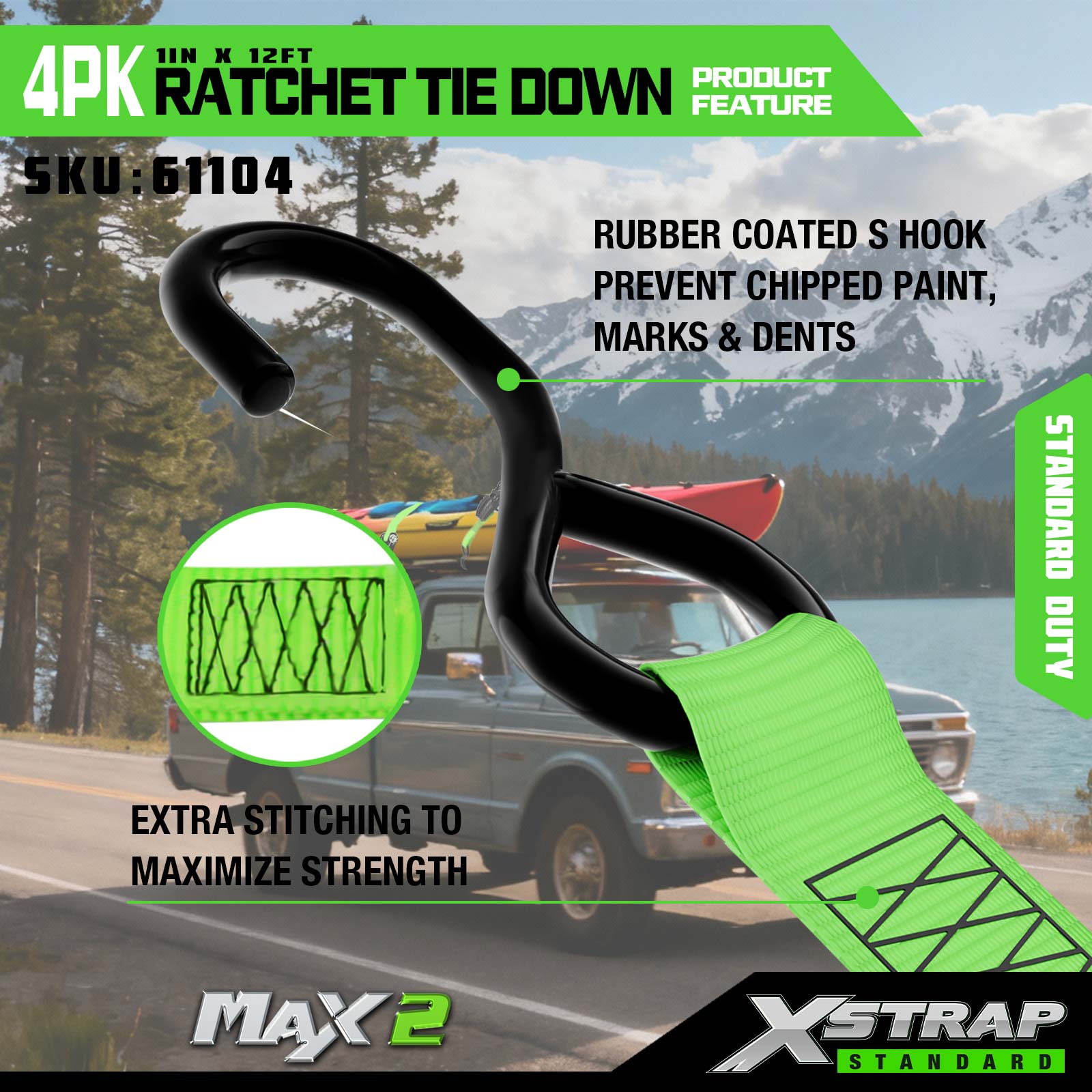 - Cangkuk S Bersalut Getah untuk Perlindungan: Dilengkapi dengan cangkuk S bersalut getah yang melindungi kenderaan dan kargo daripada serpihan cat, tanda dan penyok, mengimbangi pengekangan yang kukuh dengan penjagaan permukaan.