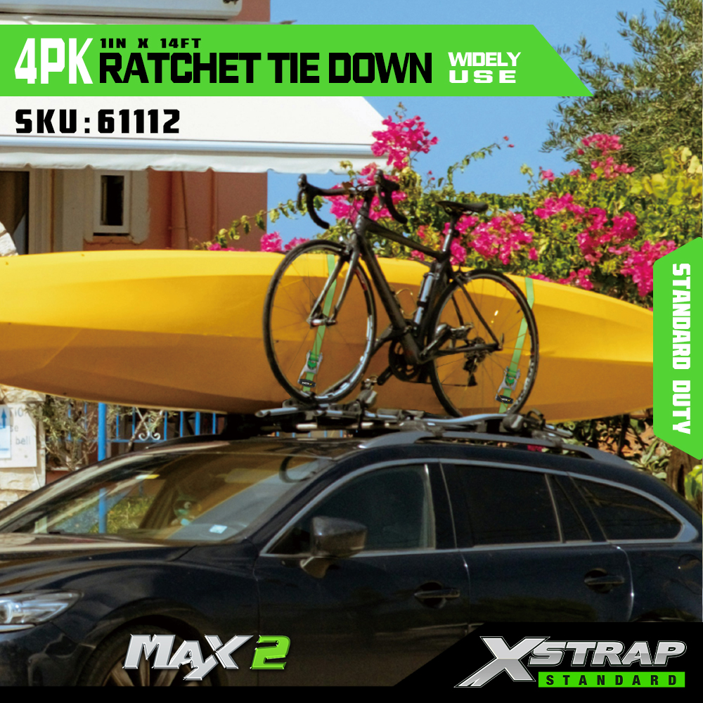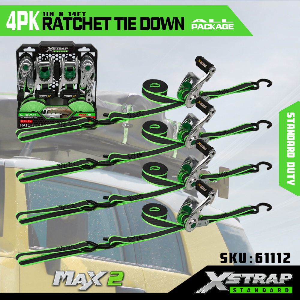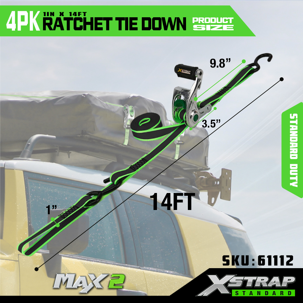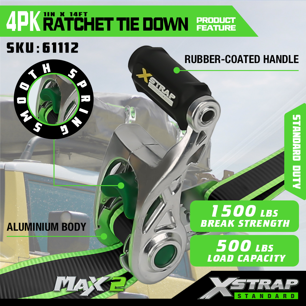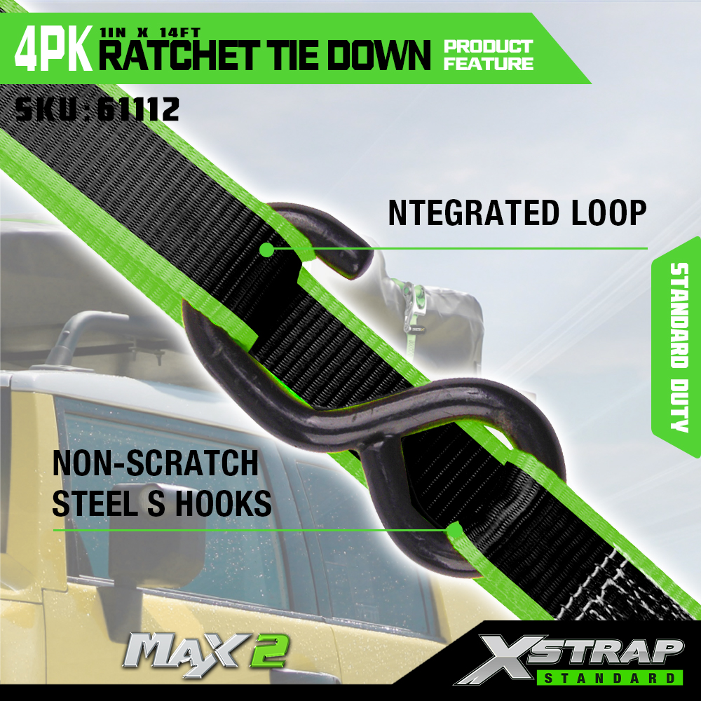 Xstrap 4 Pek Tie-Down Tali Ratchet Pemegang Terbuka, 1"x 14' Tali Tie Down Poliester Ratchet dengan Gelung Lembut, 1500lbs (500lbs) Kapasiti Ikatan Kargo Tali Pengaman dengan Ratchet aluminium & Cangkuk S untuk Kargo, Lori, Mesin Pemotong, A