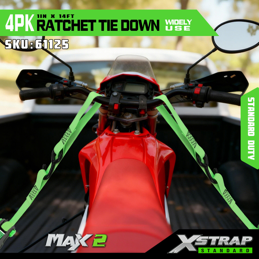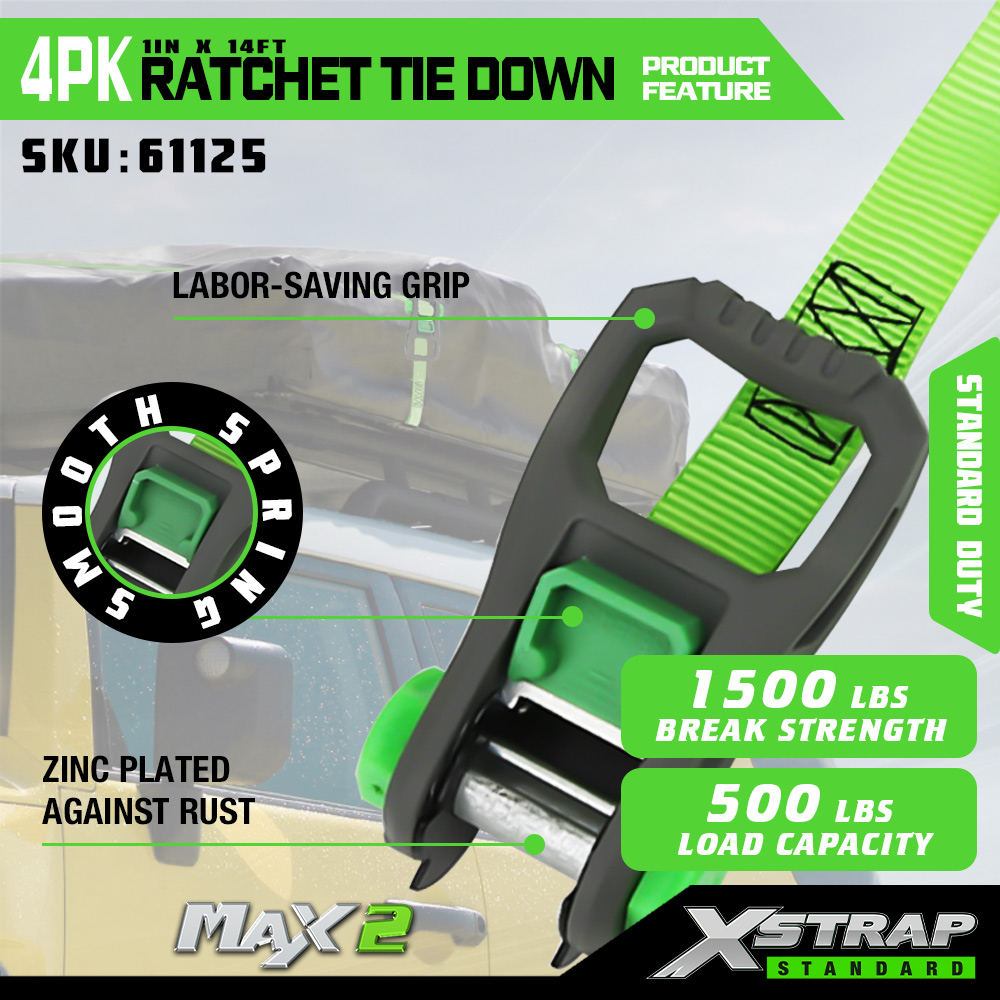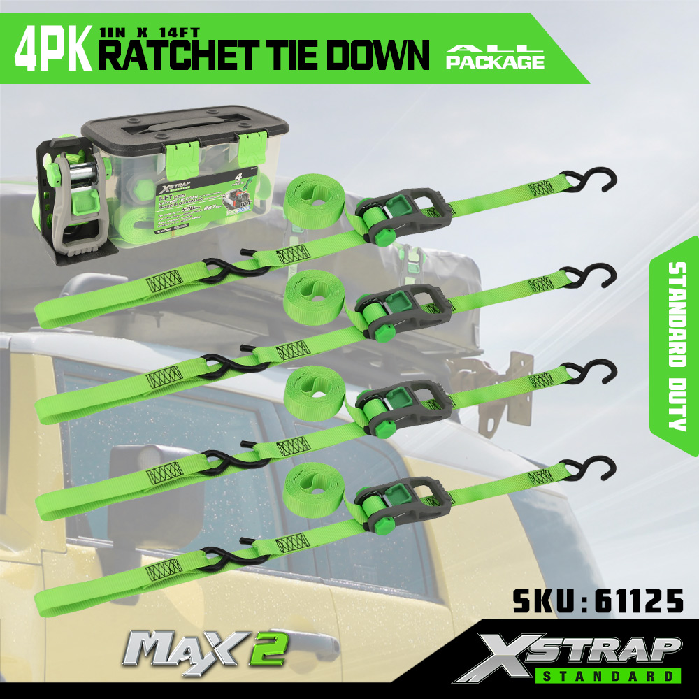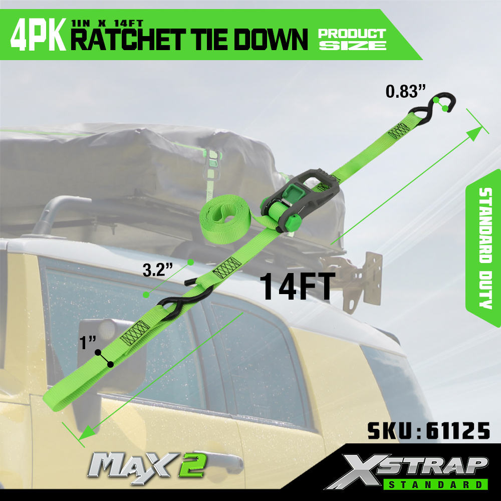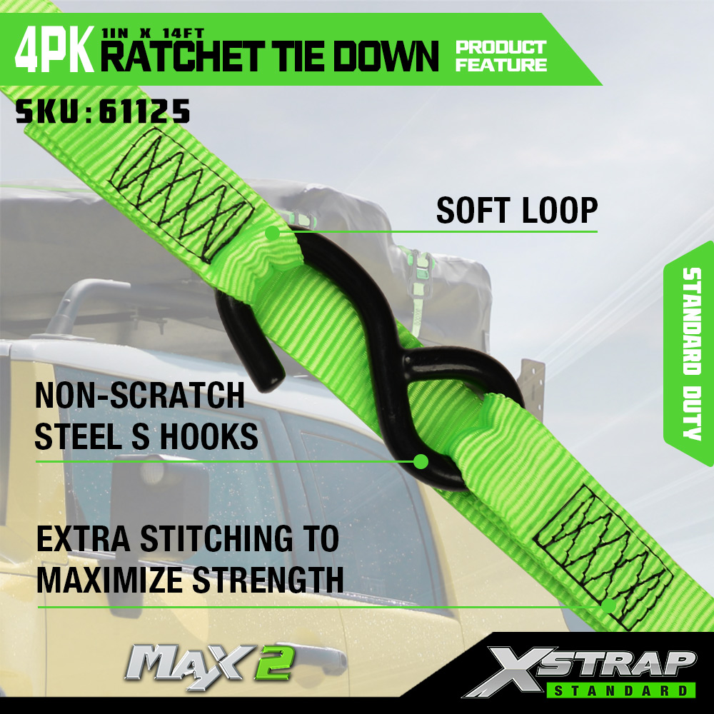 Xstrap 4 Pack Ratchet Tie Down, 1” x 14’ Poliester Tie Down Strap dengan gelung lembut Tali Ratchet Tarik, 500lbs Kapasiti Ikatan Kargo Tali Pengaman dengan S Cangkuk untuk Trak Pickup, SUV, Rak Atas Kereta Motosikal, Bot Memancing Ringan, Jet Ski, Kereta salji.