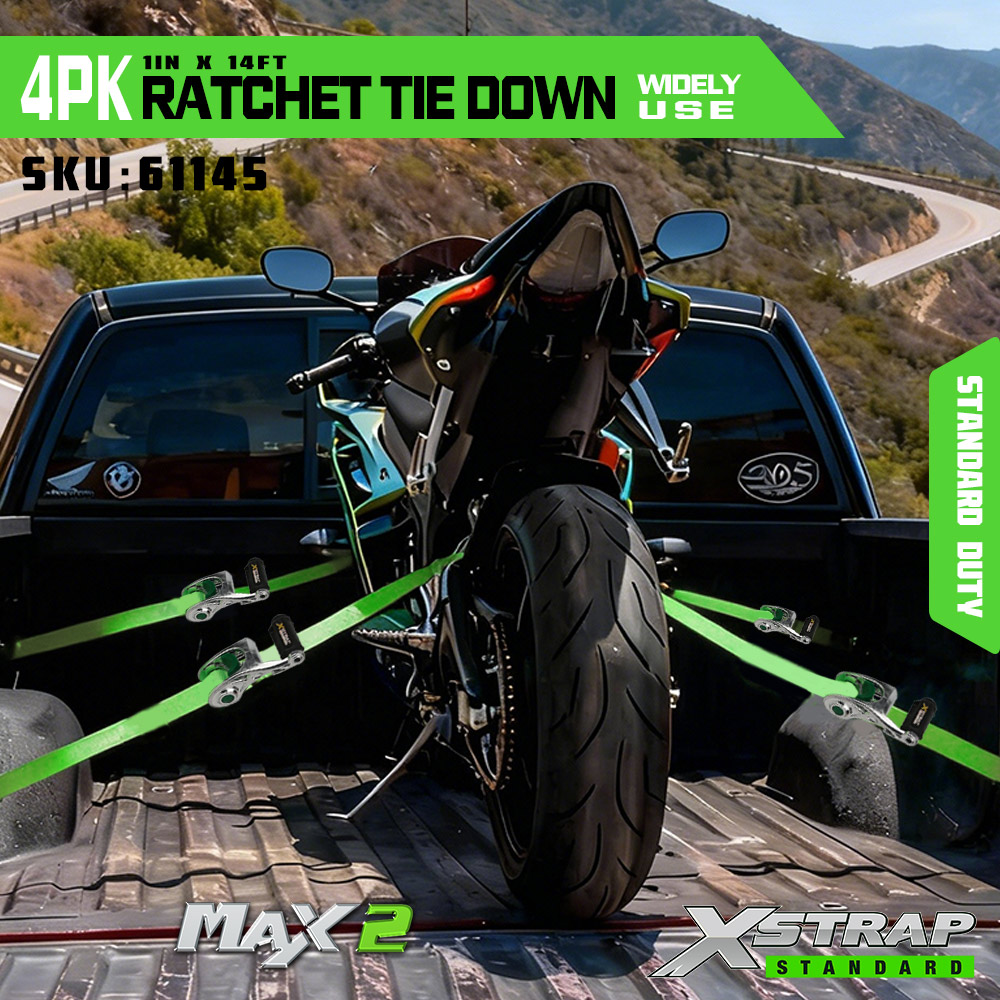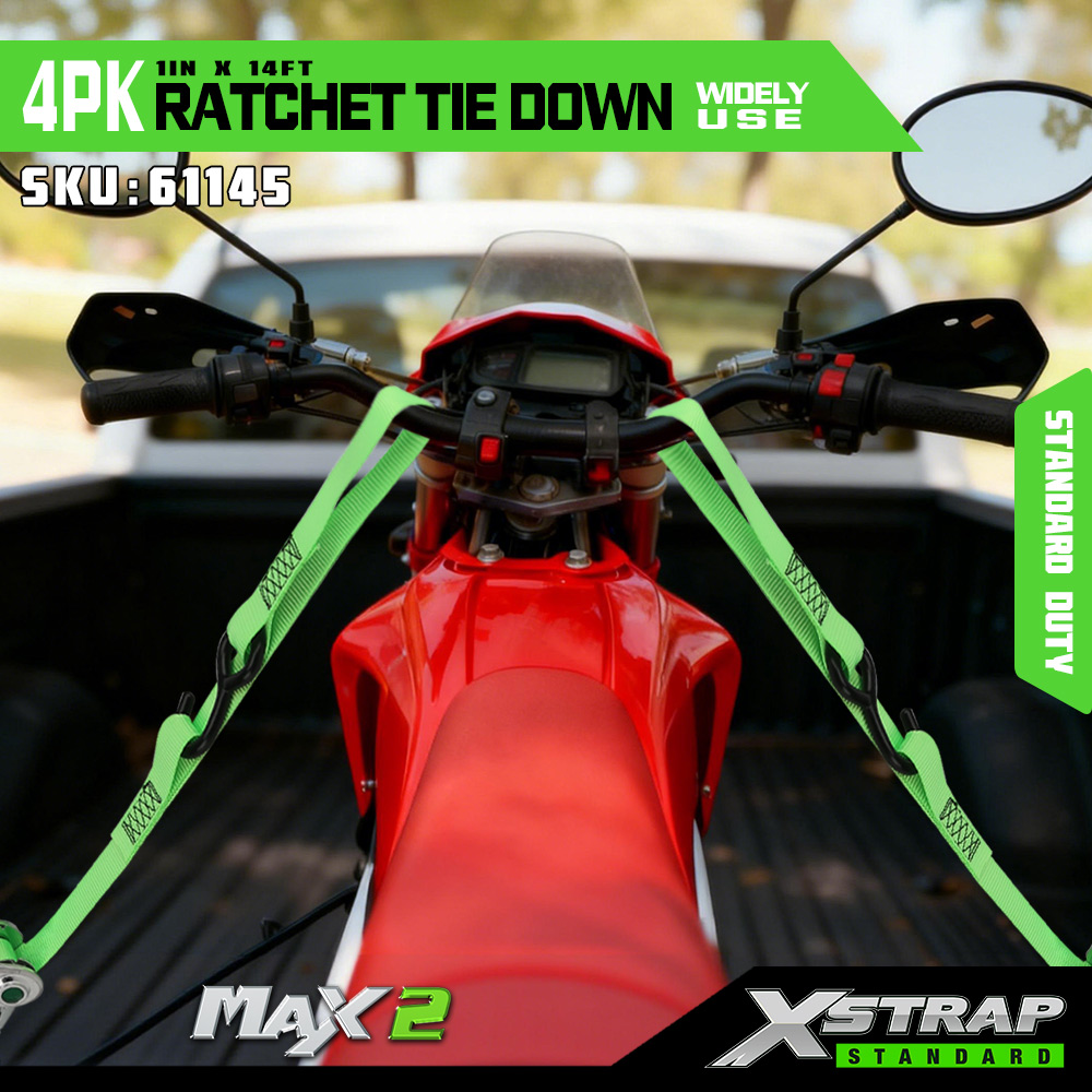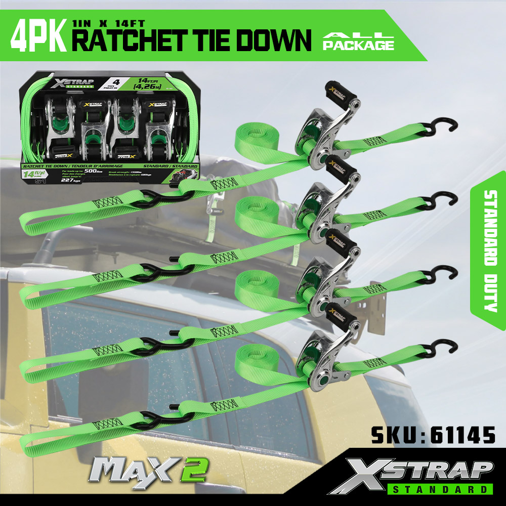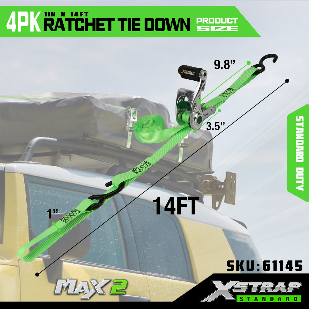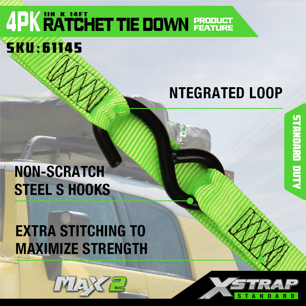 Xstrap 4 Pack Ratchet Tie Down dengan Gelung Lembut, 1" x 14' Poliester Tie Down Tali Tarik Ratchet Strap, 1000lbs Kapasiti Kargo Lashing Tali Pengaman dengan Cangkuk S untuk Lori, SUV, Rak Atas Kereta Motosikal.