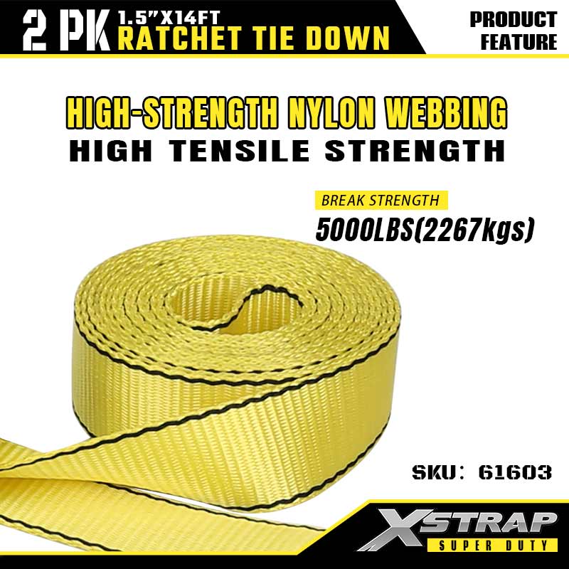 - Anyaman Nilon Tegangan Tinggi (Kekuatan Pecah 5000LBS): Dibina dengan tali nilon kuning berkekuatan tinggi (lebar 1.5") — memberikan kekuatan tegangan yang luar biasa (beban pecah 5000LBS) dan rintangan lelasan, sesuai untuk pengangkutan tugas berat atau tugas pengikat industri.l